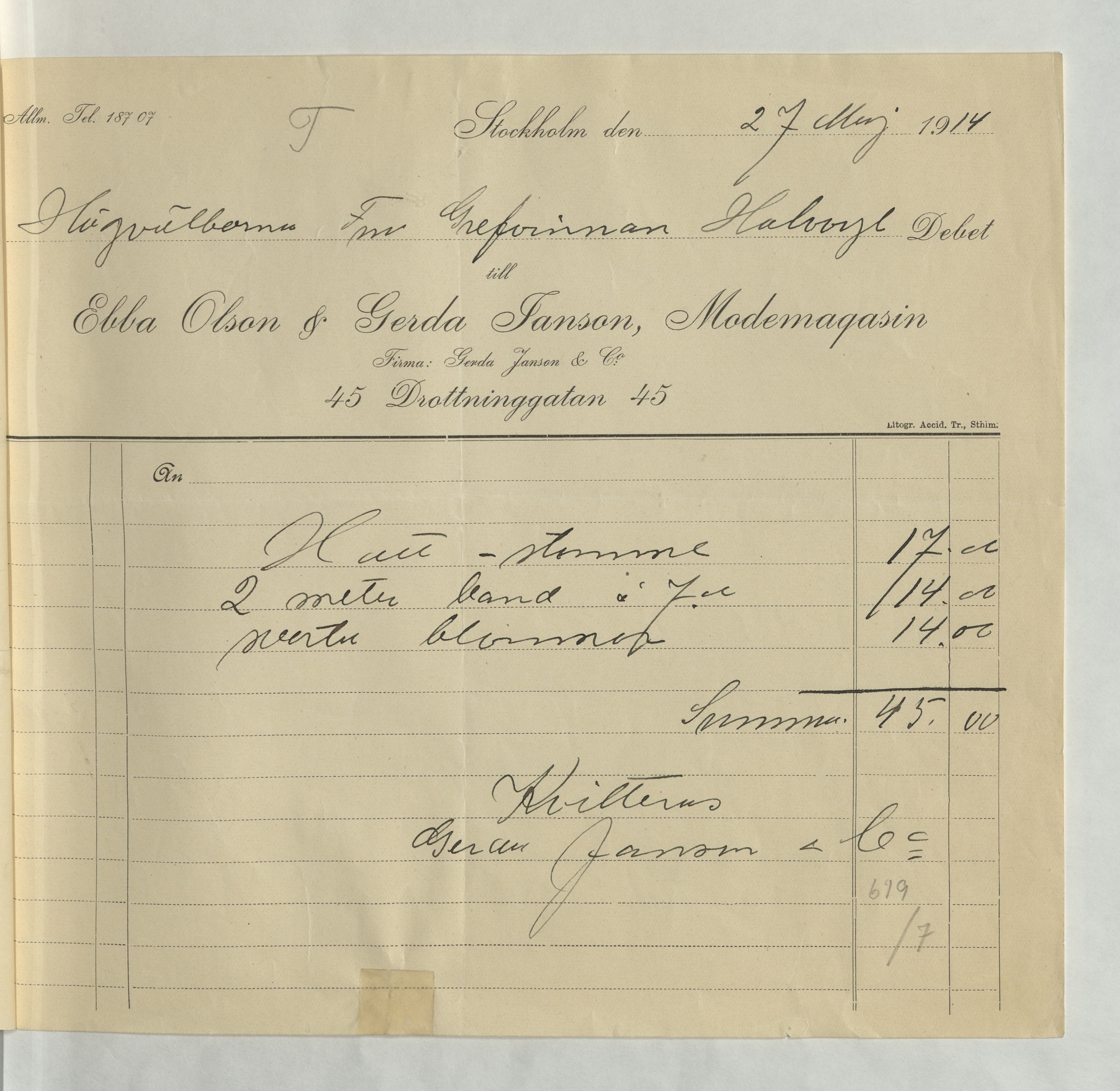 Kvitto från Ebba Olson & Gerda Janson, Modemagasin. Inköpt "Hatt-stomme", 2 meter band och svarta blommor, för en totalsumma av 45Kr. Betalt Stockholm 27 maj 1914.