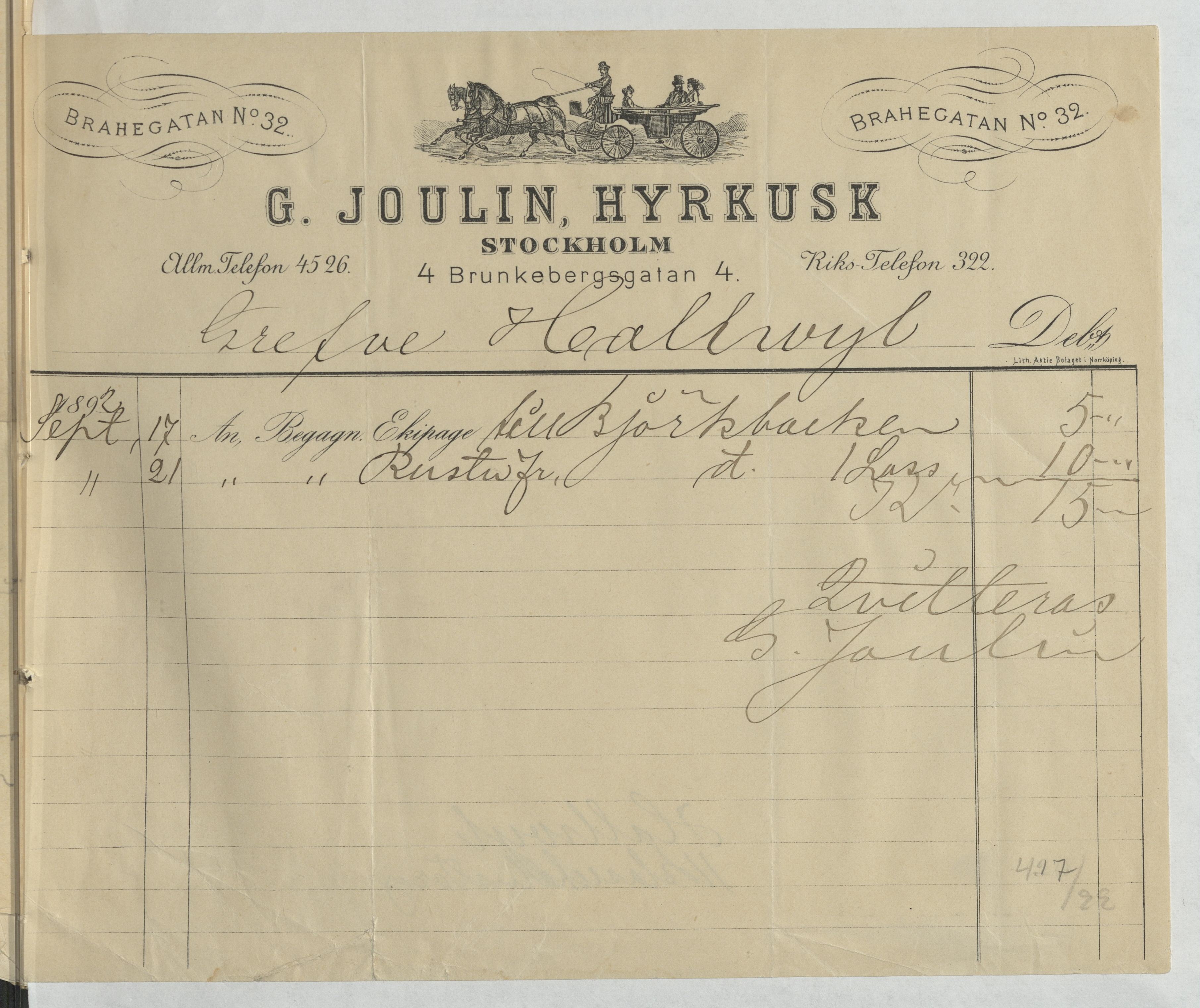 Kvitto från G. Joulin, Hyrkusk. Gällande resa samt transport med rustvagn till Villa Björkhagen. Stockholm, 1892.