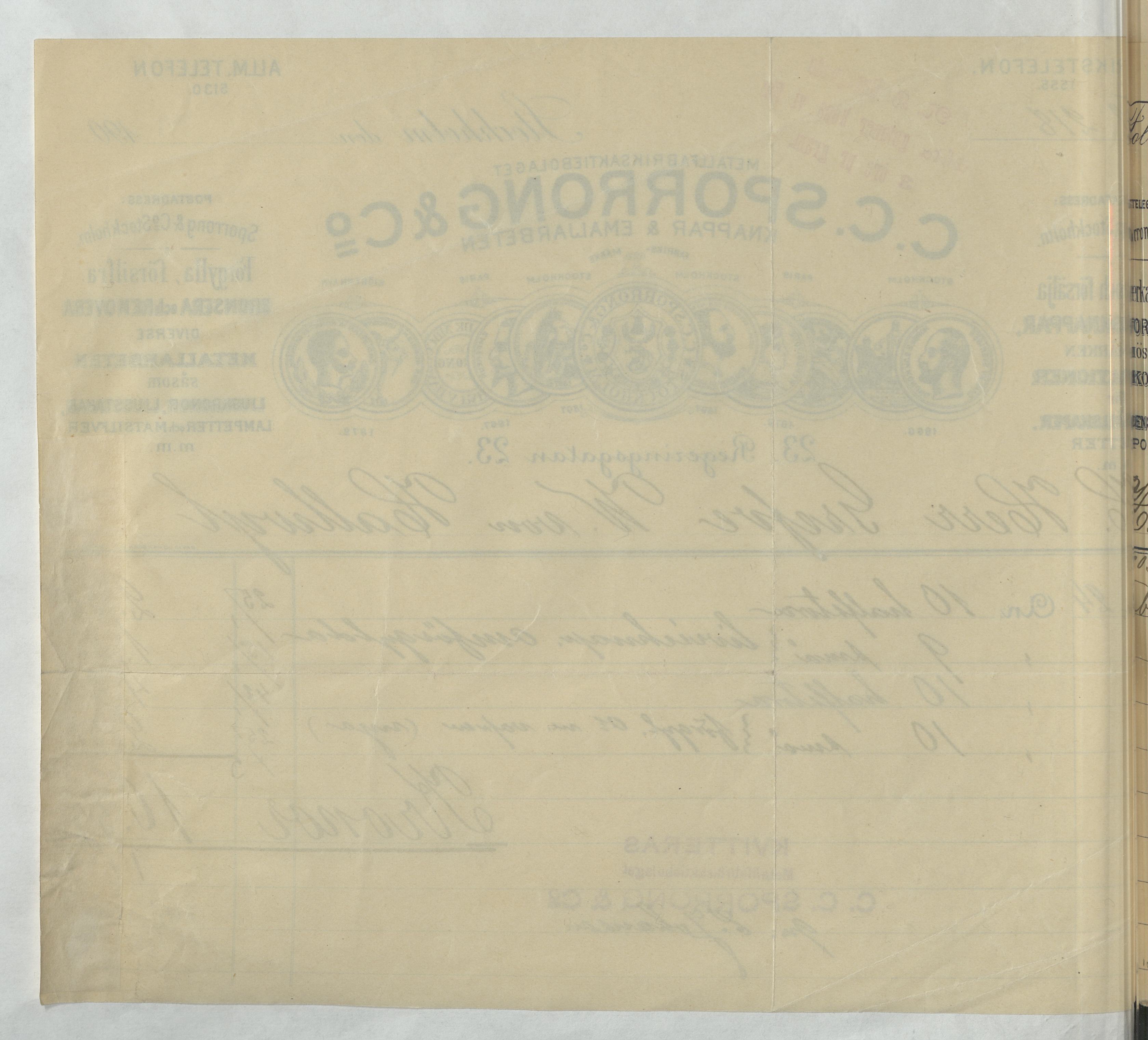 Kvitto från Metallfabriksaktiebolaget C. C. Sporrong & Co. Knappar & Emaljarbeten
