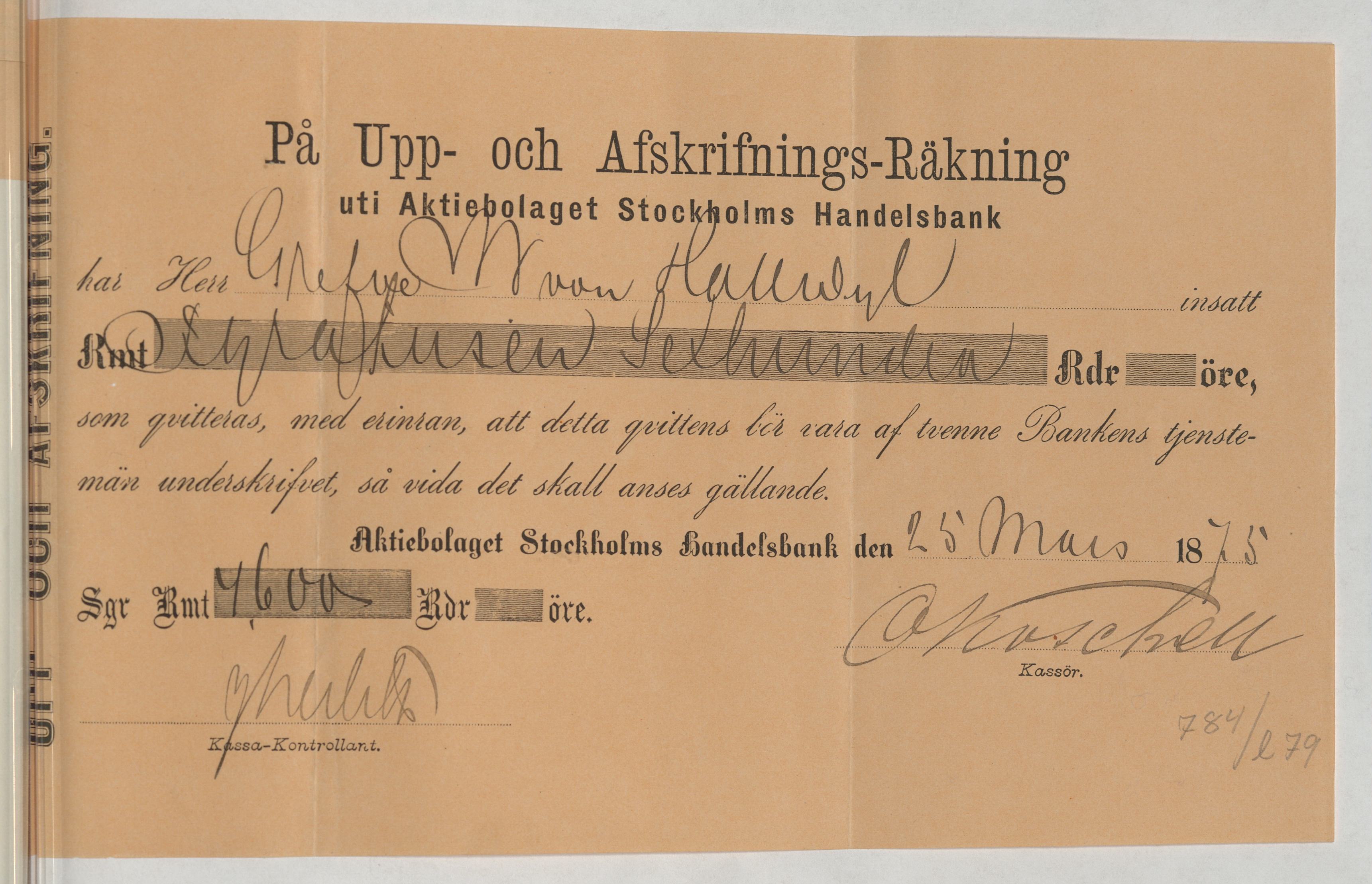 Kvitto från Aktiebolaget Stockholms Handelsbank rörande Upp- och Afskrifnings-Räkning