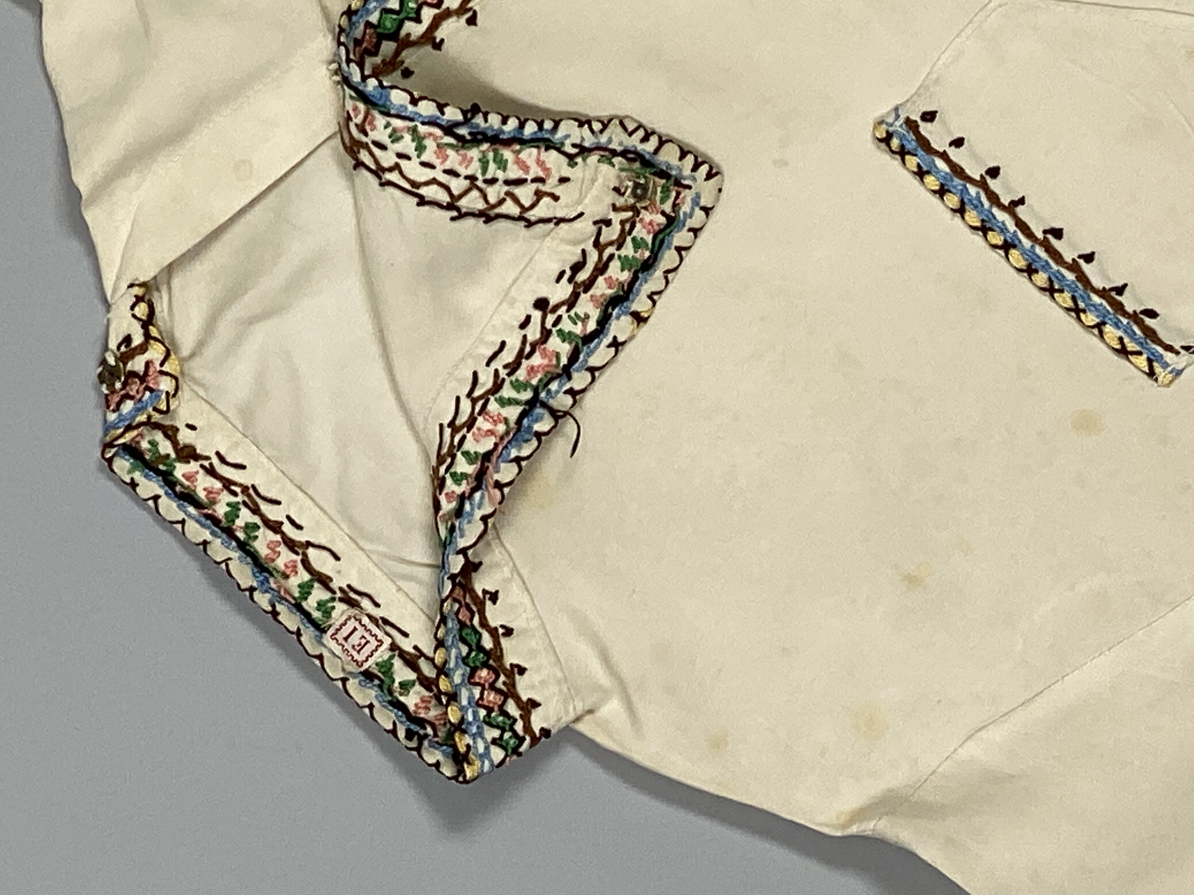 Vit, långärmad skjorta i barnstorlek med påsydd fick på höger sida och knäppning på vänster. Färgglad brodyr kring hals, ärmar och ficka. Påsytt märkband med monogram "W. I." i halsen.