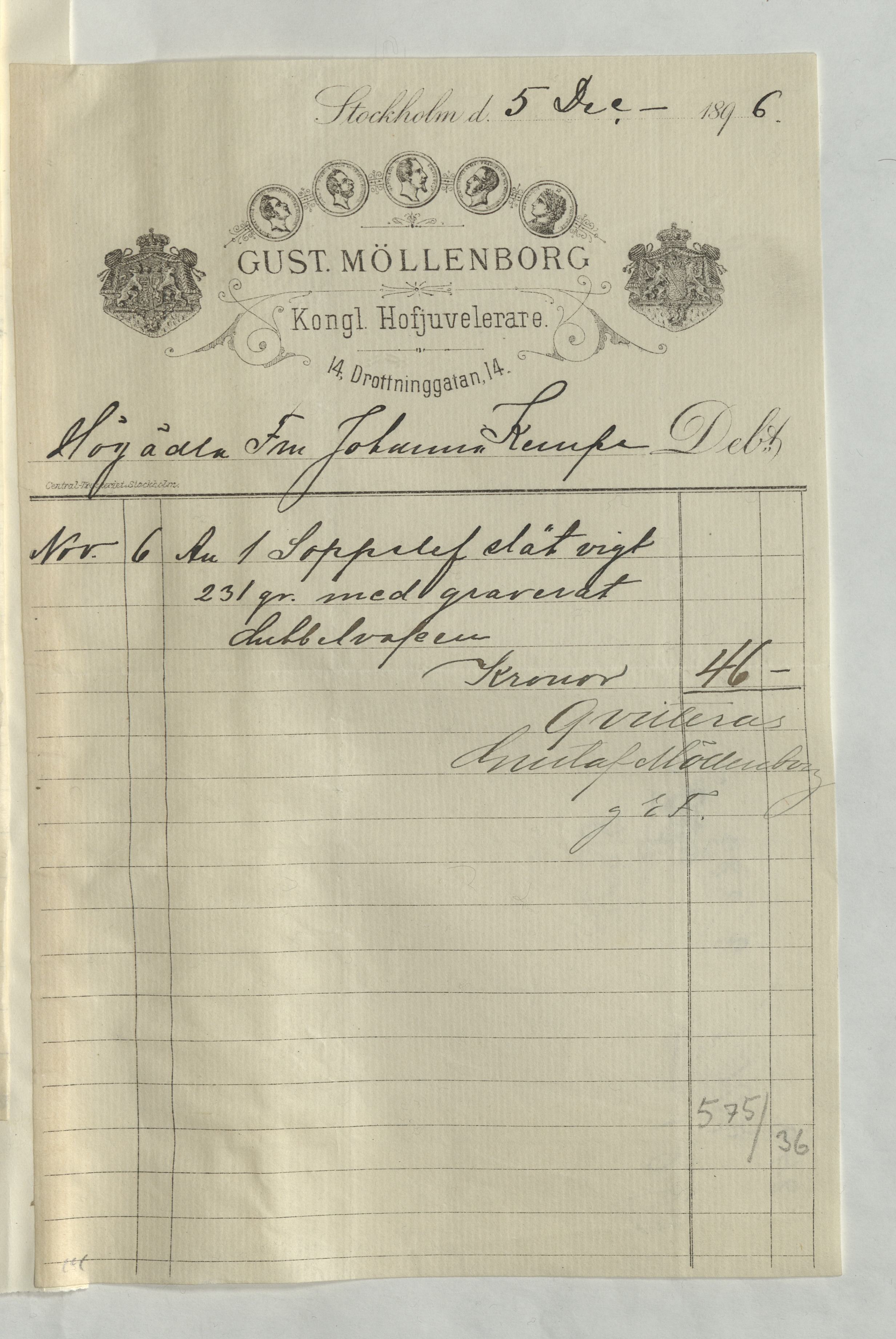 Kvitto från Gustaf Möllenborg, Juvelerare