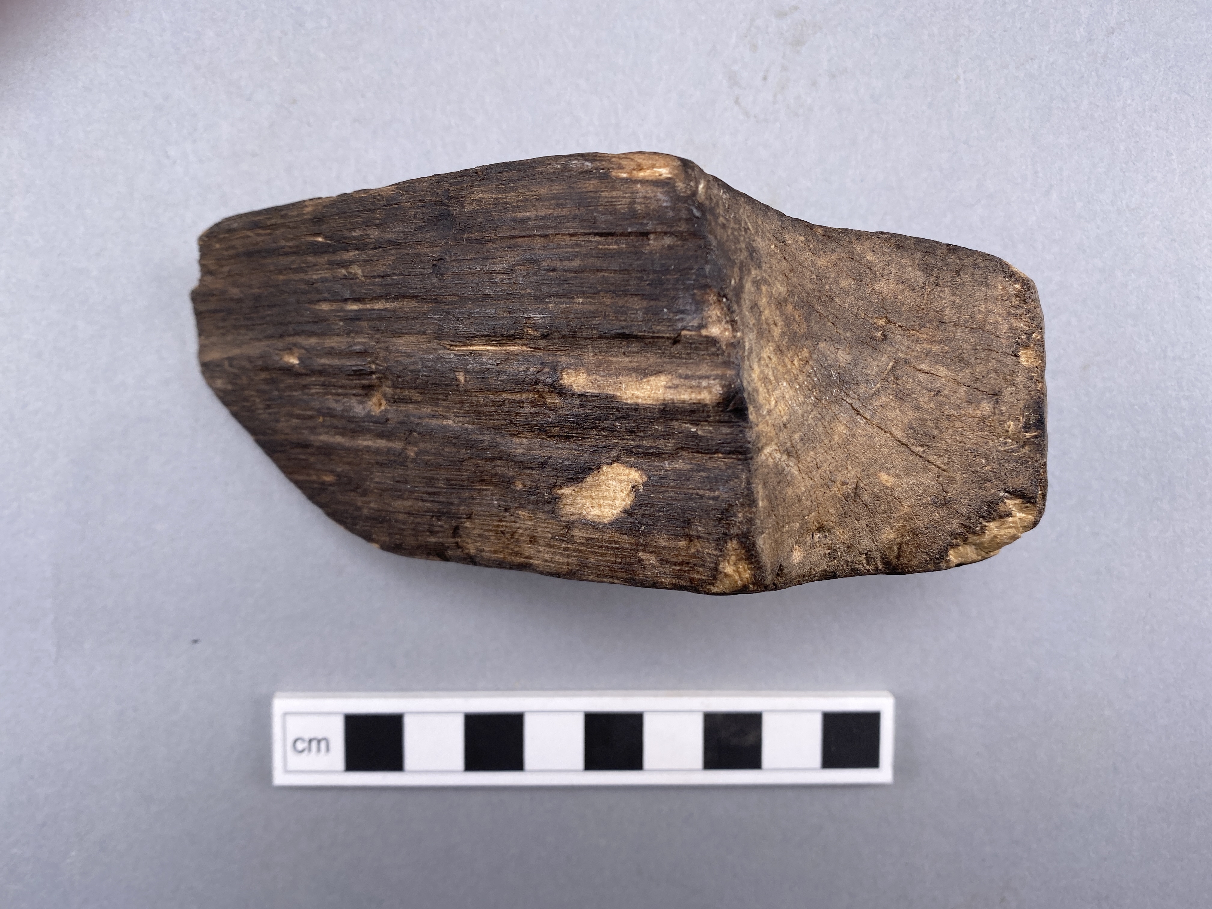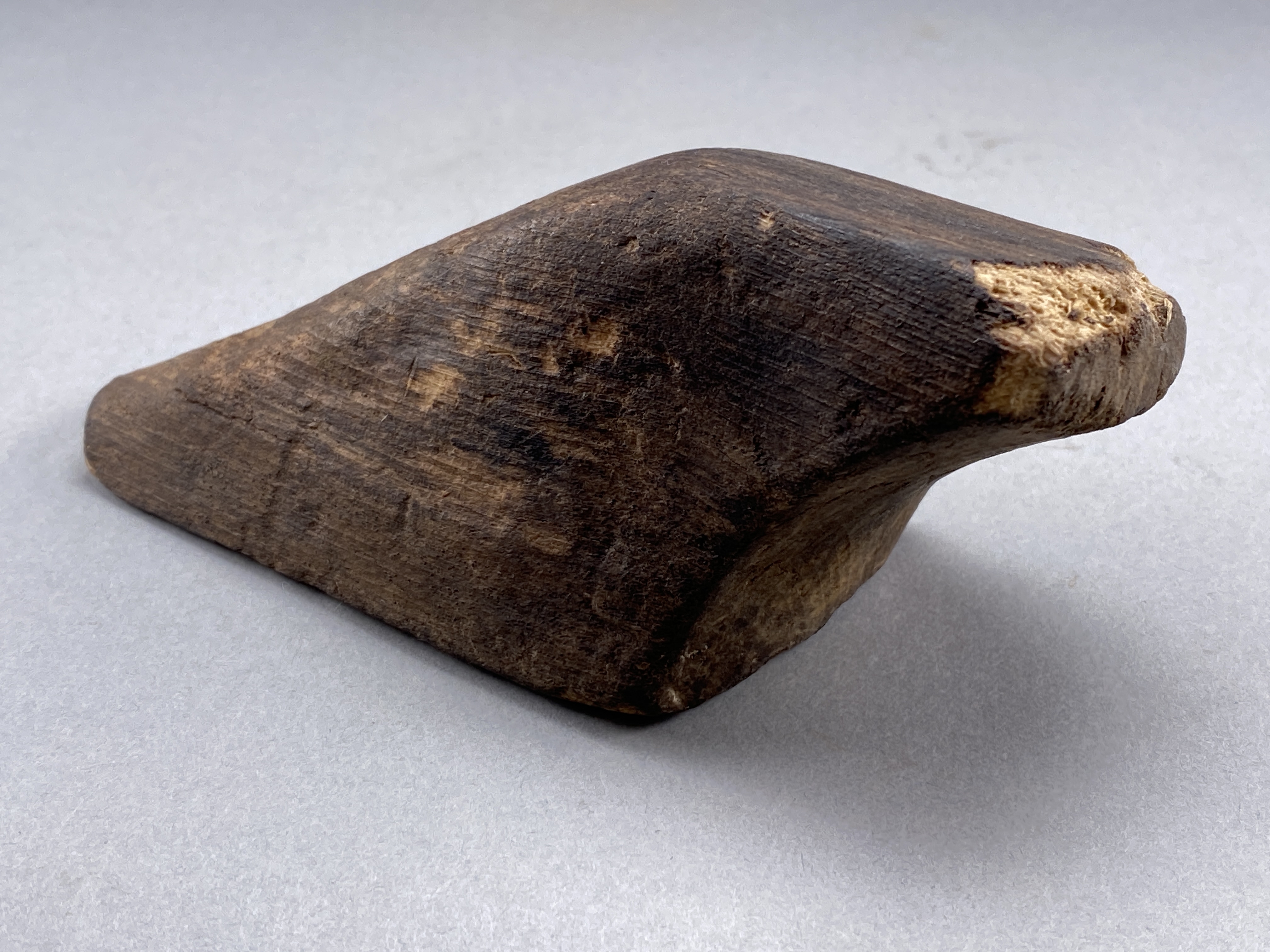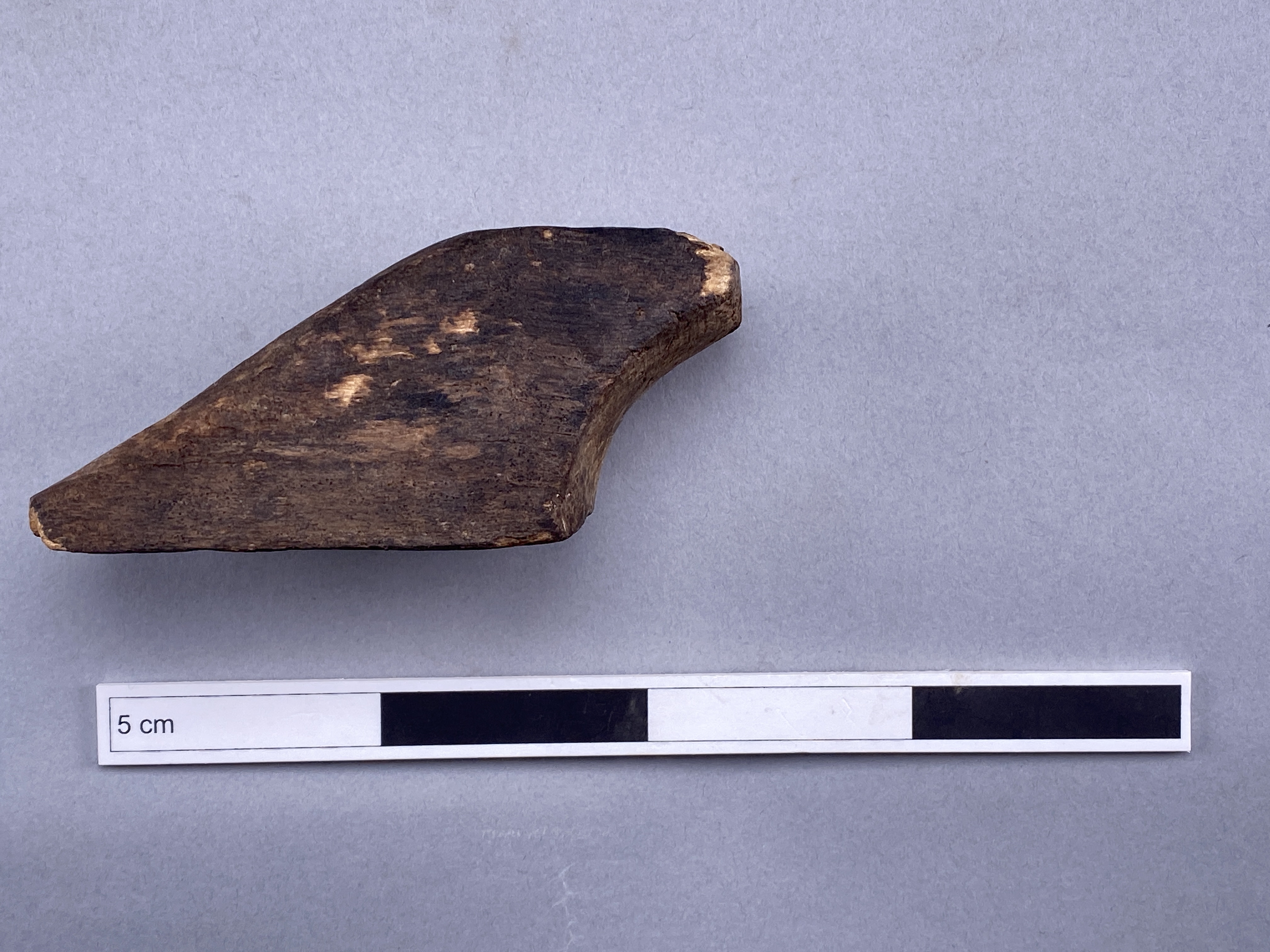 Större bit med urtag. Fint bearbetade kanter. Något eroderad.