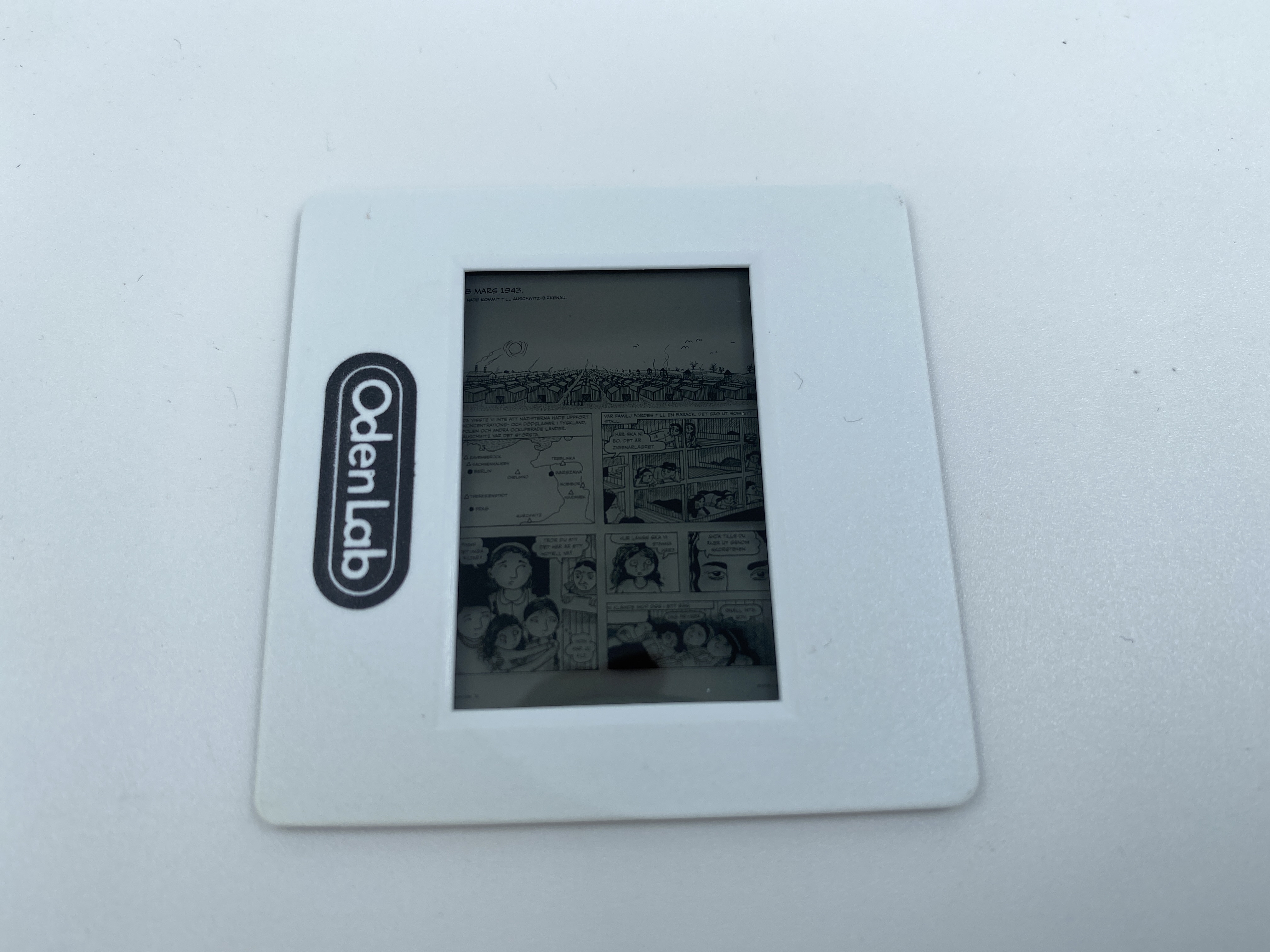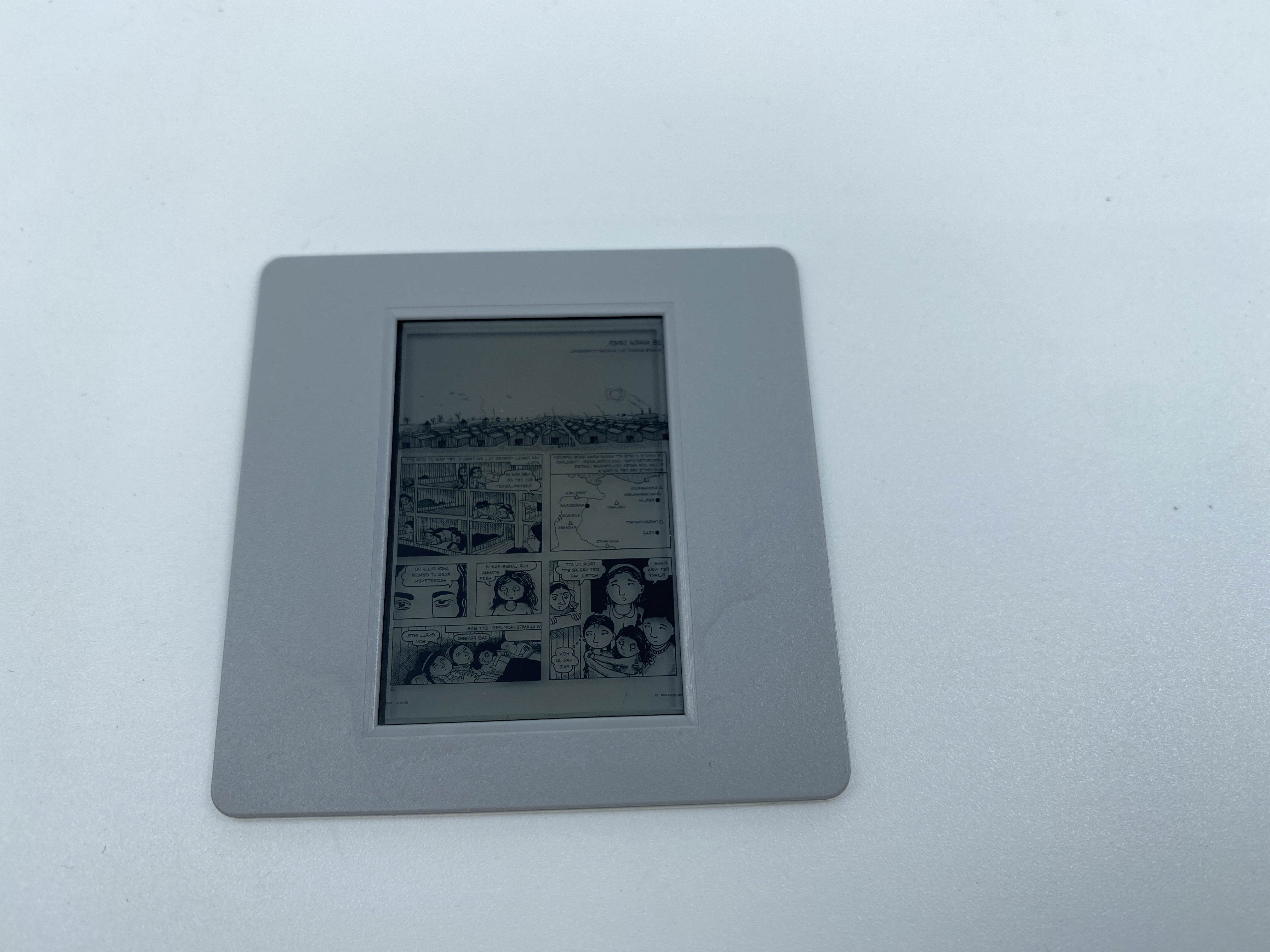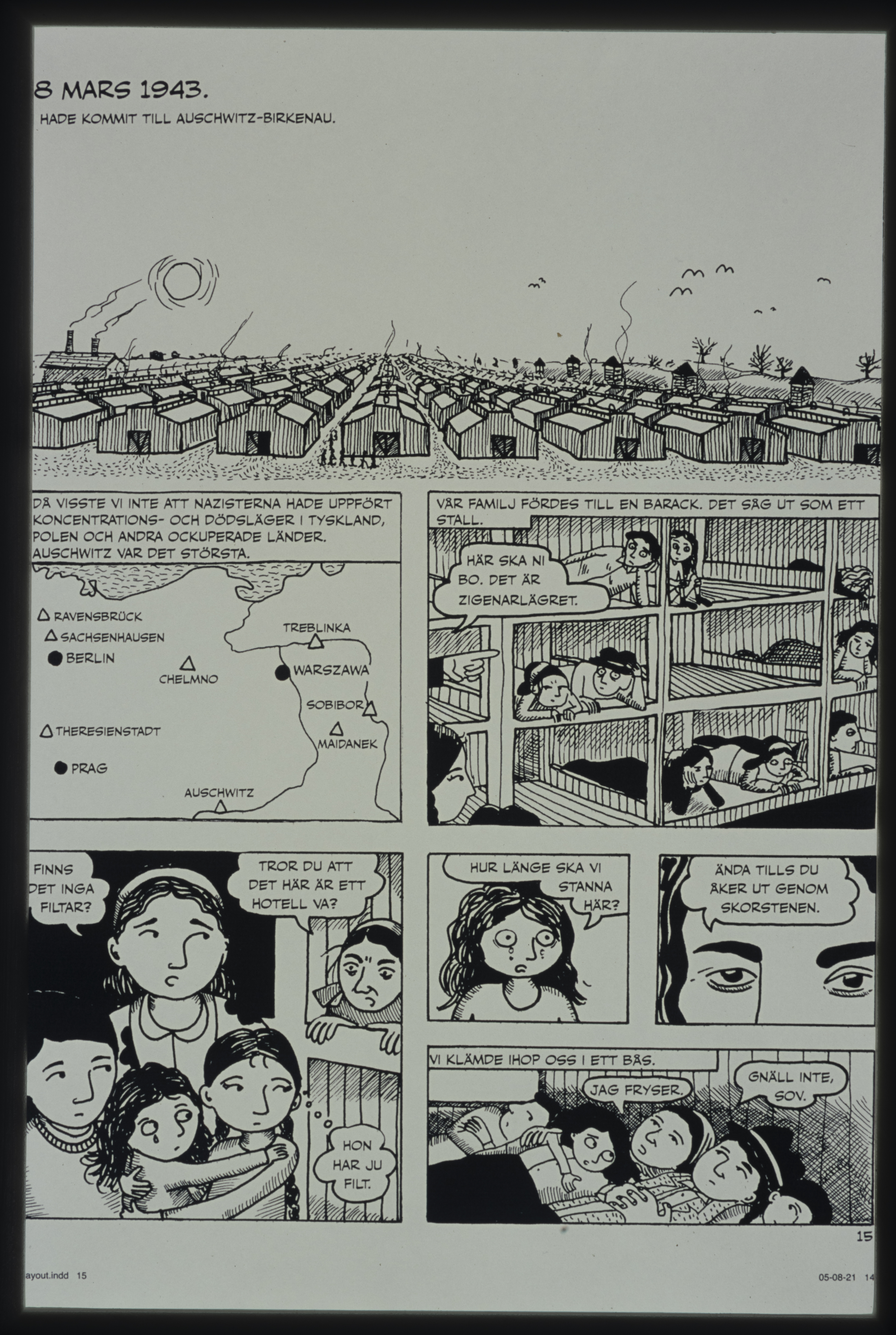 Diabild monterad i diaram i plast. Bilden föreställer en seriesida ur Gunilla Lundgrens och Amanda Erikssons seriealbum Sofia Z45-15 som skildrar hur Sofia Taikons familj drabbades av nazisternas förföljelse under andra världskriget.