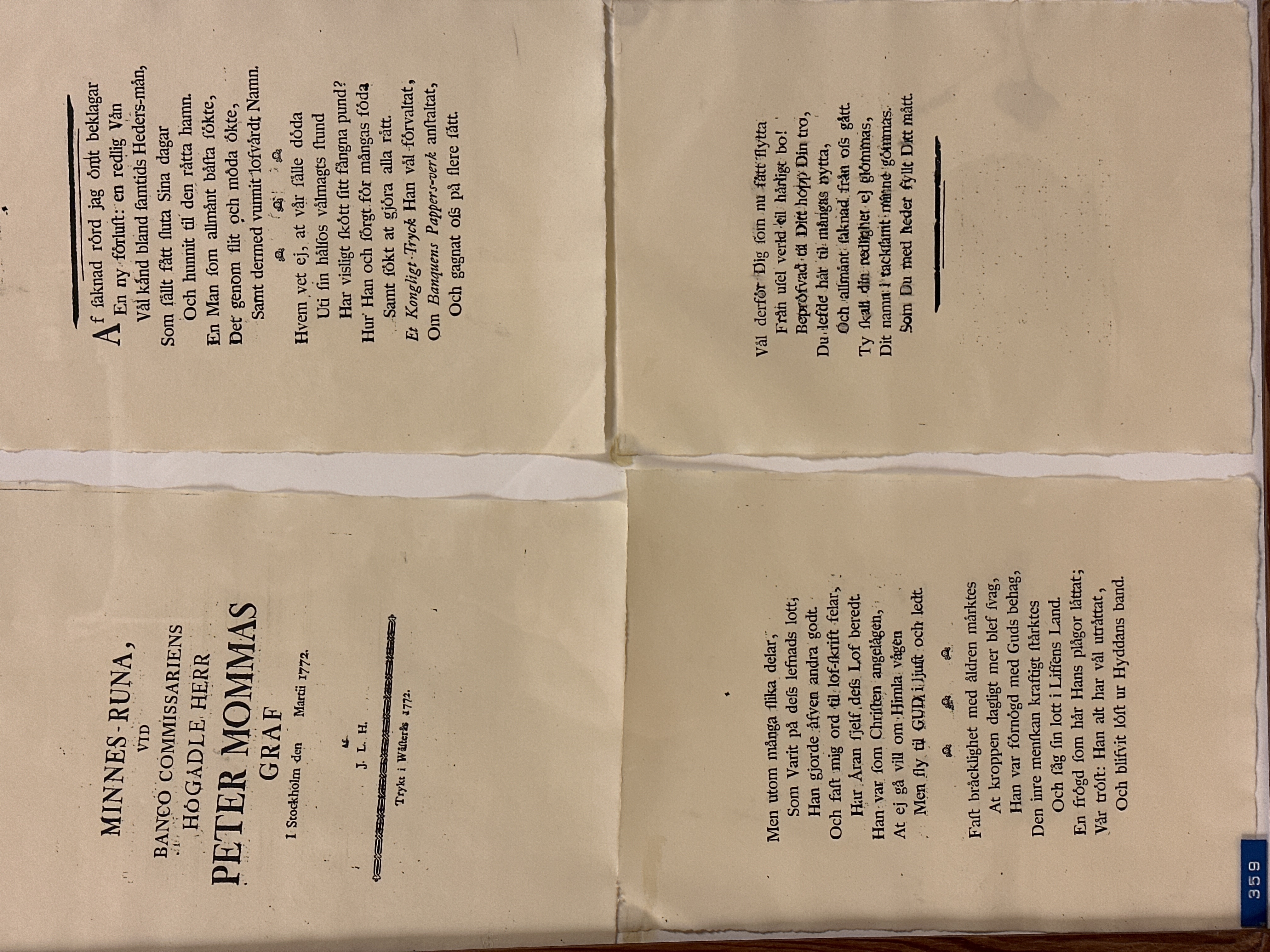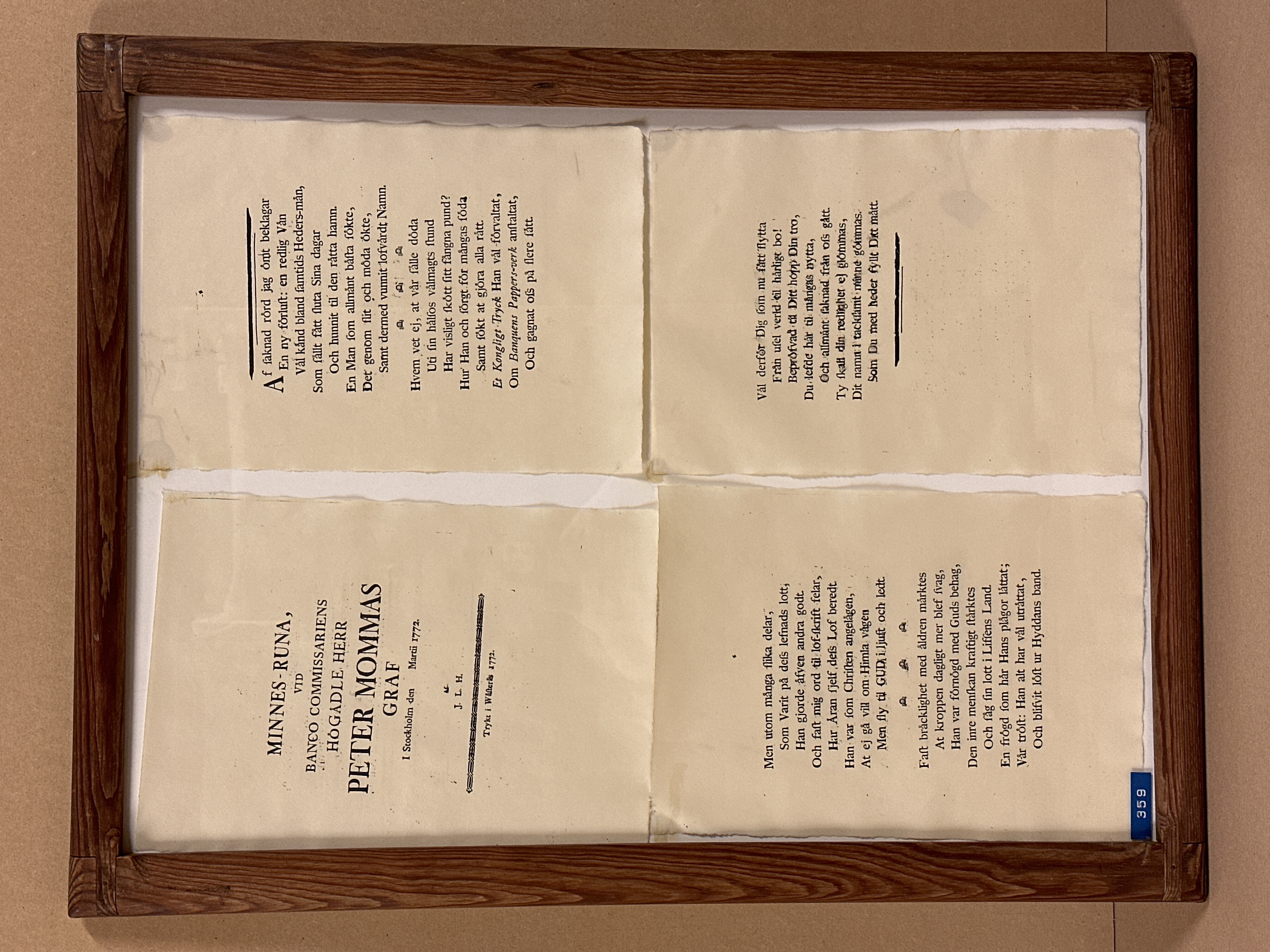 Tavla, bestående av fyra hanformade pappersark innanför ram av trä. Ramen tillverkad av däckel från pappersform. Pappersarken med text tryckt i svart, texten hämtad från Peter Mommas (1711-1772) minnesruna. Första pappersarket, övre vänstra hörnet: "MINNES-RUNA, VID BANCO COMMISSARIES HÖGÅDLE HERR PETER MOMMAS GRAF I Stockholm den Martii 1772. J. L. H. Tryckt i Wåsterås 1772". Andra arket, övre högra hörnet: "Af saknad rörd jag ömt beklagar En ny förlust: en redlig vän Väl känd bland samtids Heders-män, Som sällt fått sluta Sina dagar Och hunnit til den rätta hamn. En man som allmänt bästa sökte, Det genom flit och möda ökte, Samt dermed vunnit lofvårdt Namn. Hvem vet ej, at vår sälle döda Uti sin hälsos välmagts stund Har visligt skött sitt fångna pund? Hur Han och sörgt för mångas föda Samt sökt att gjöra alla rätt. Et Kongligt Tryck Han väl förvaltat, Om Banquens Pappers-verk anstaltat, Och gagnat oss på flere sätt". Tredje arket, nedre vänstra hörnet: "Men utom många flika delar, Som varit på dess lefnads lott, Han gjorde även andra godt. Och fast mig ord til lof-skrift felar, Har Äran sjelft dess Lof beredt. Han var som Christen angelägen, At ej gå vill om Himla vägen Men fly til GUD i ljuft och ledt. Fast bräcklighet med åldren märktes At kroppen dagligt mer blef svag, Han var förnögd med Guds behag, Den inre menskan kraftigt stärktes Och såg sin litt i Liffens Land. En frögd som här Hans plågor lättat; Vår tröst: Han alt har väl uträttat, Och blifvit löft ur Hyddans band". Fjärde arket, nedre högra hörnet: "Väl derför Dig som nu fått flytta Från usel verld til härligt bo! Bepröfvad til ditt hopp Din tro, Du lefde här til mångas nytta, Och allmänt saknad från oss gått. Ty skall din redlighet ej glömmas. Som Du med heder fyllt Ditt mått". Tavlan troligtvis tillverkad och brukad på Tumba bruks tidigare bruksmuseum (1968- ca.2004).