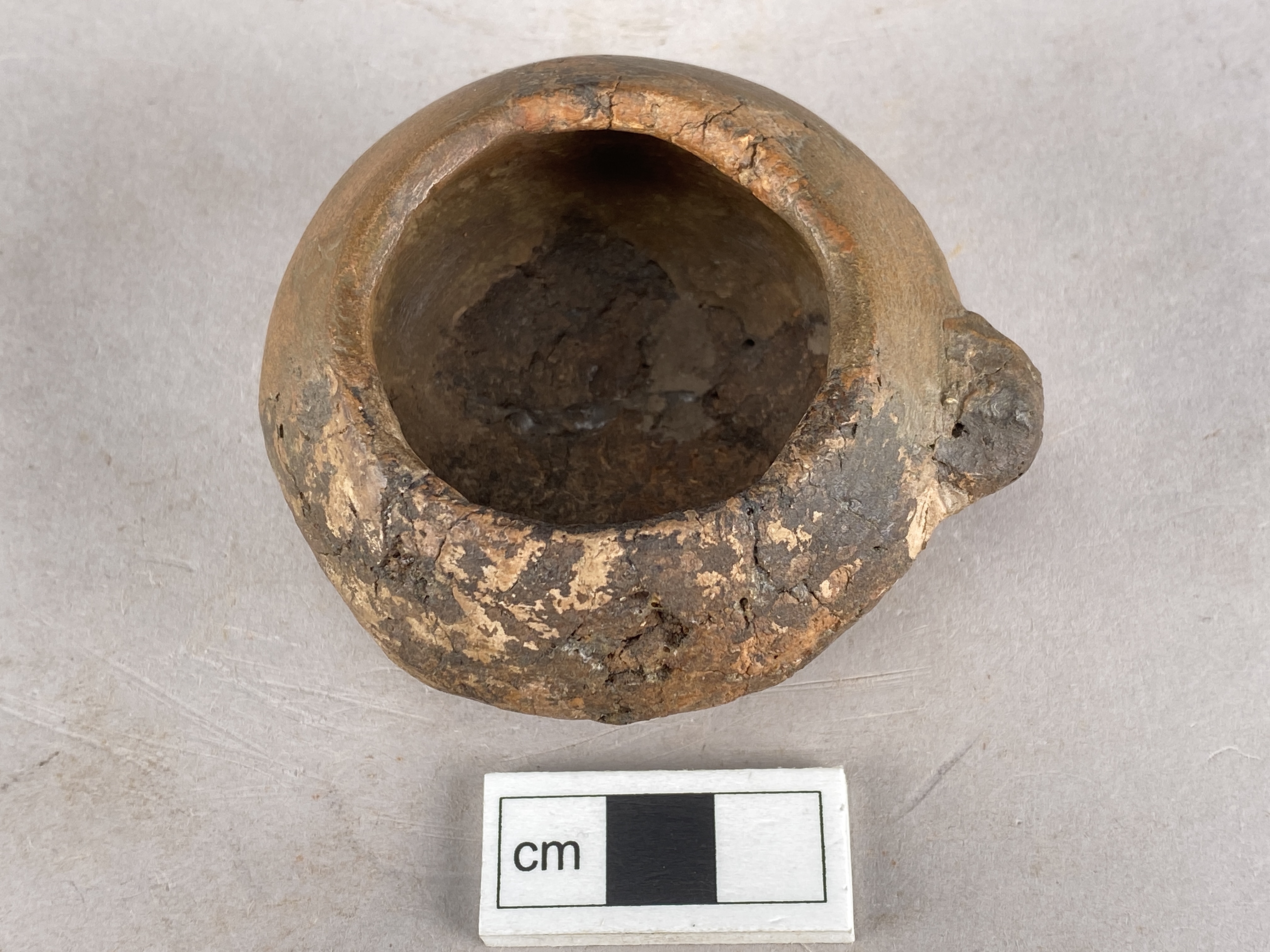 liten bikonisk skål med en knopp på skuldran. oxiderat bränd.