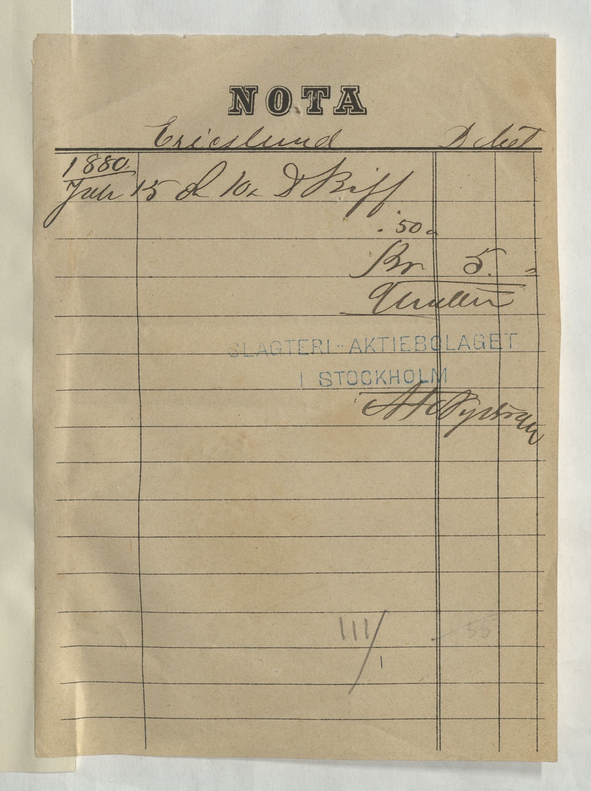 Kvitto från Slagteri Aktiebolaget i Stockholm. Daterat 1880.