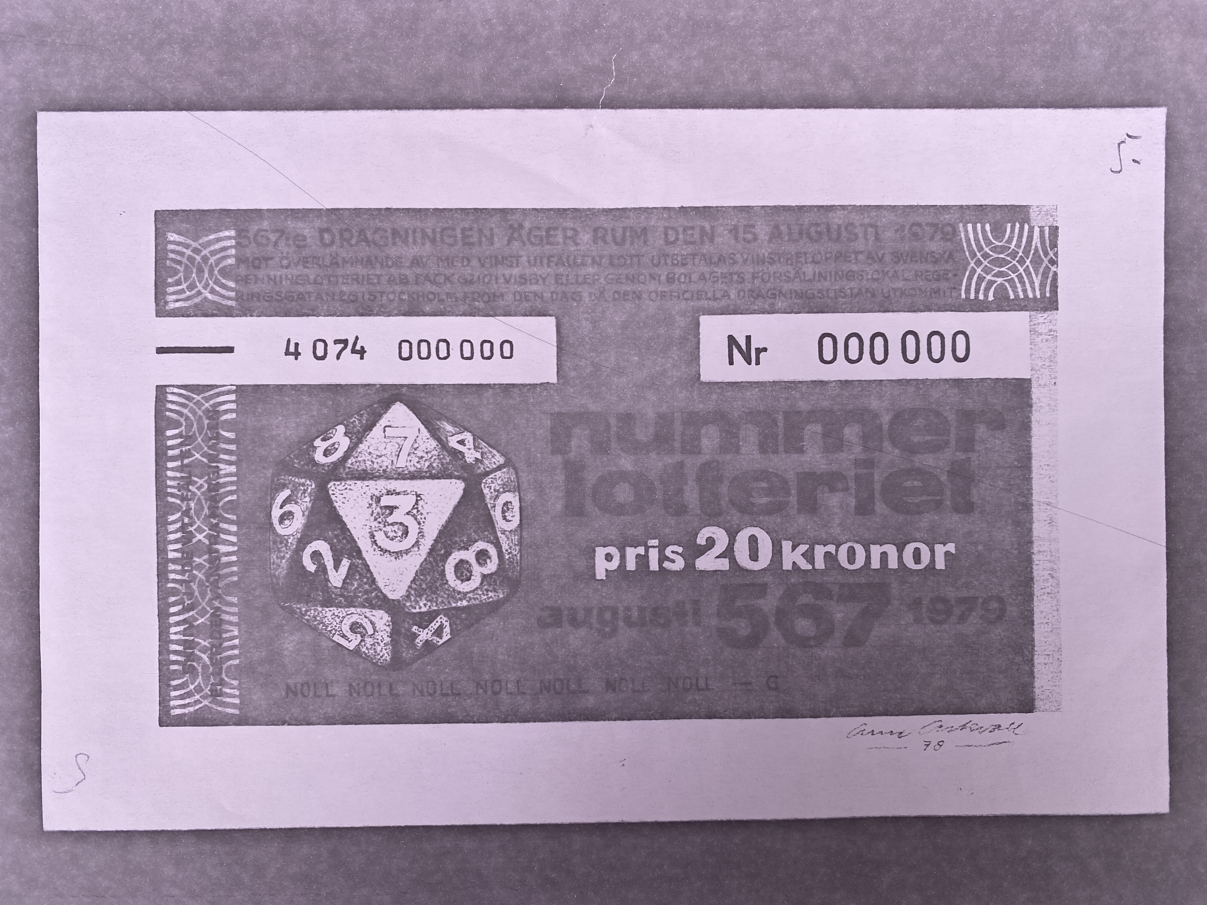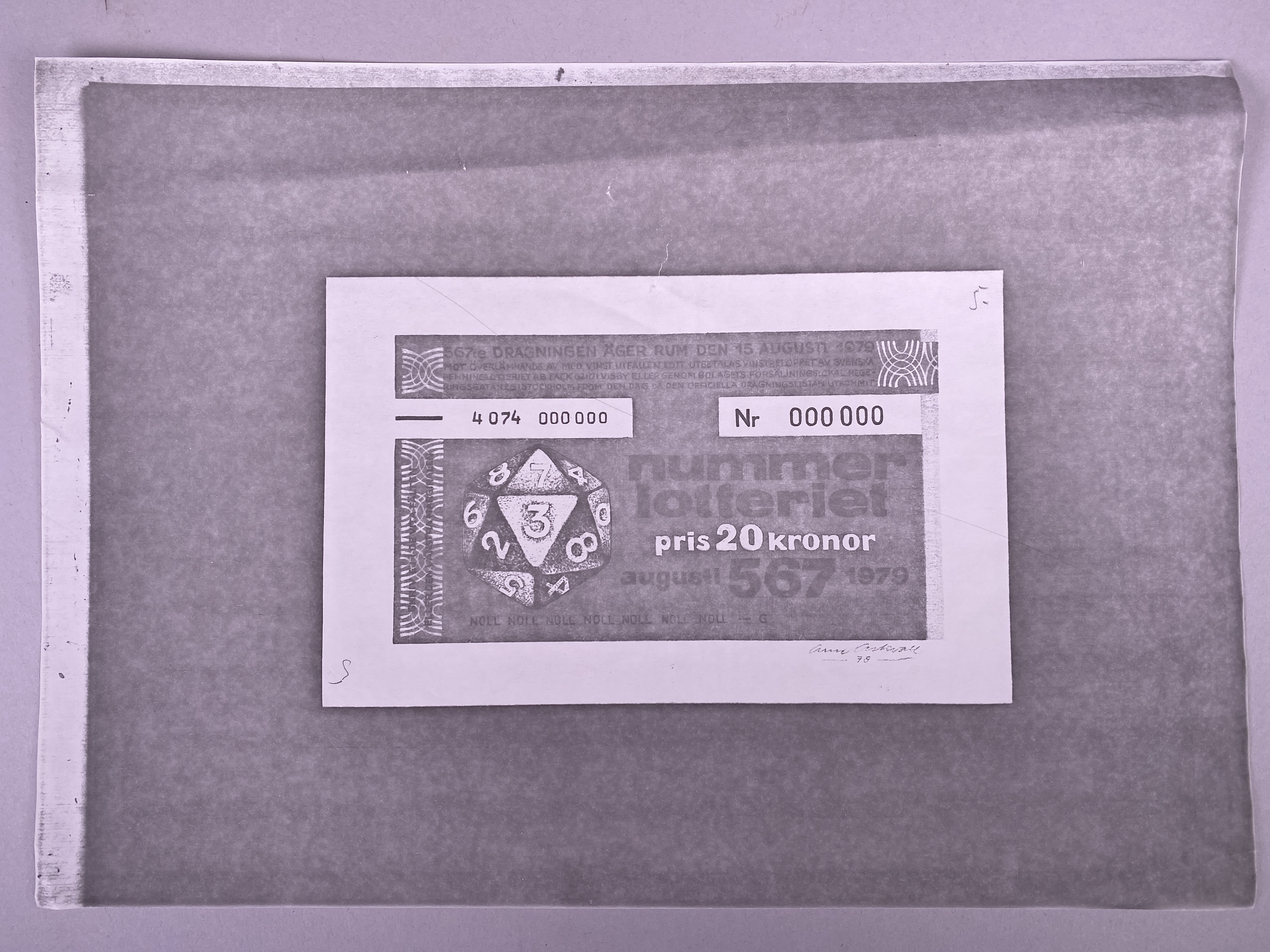 Fotostatkopia och förslag på lotterisedel med dragningsdatum den 15 augusti 1979, 567:e dragning. 3 av 6 exemplar med nr 000000. Jämför skillnaden i design med objektet 3145314.