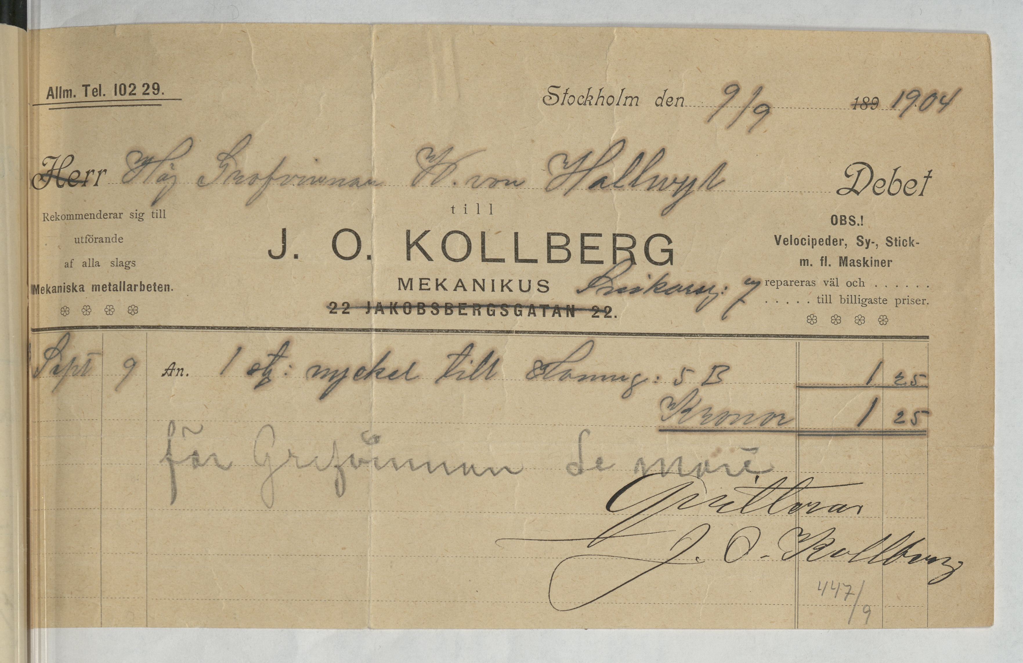 Kvitto från J. O. Kollberg, Mekanikus. Stockholm, 1904.