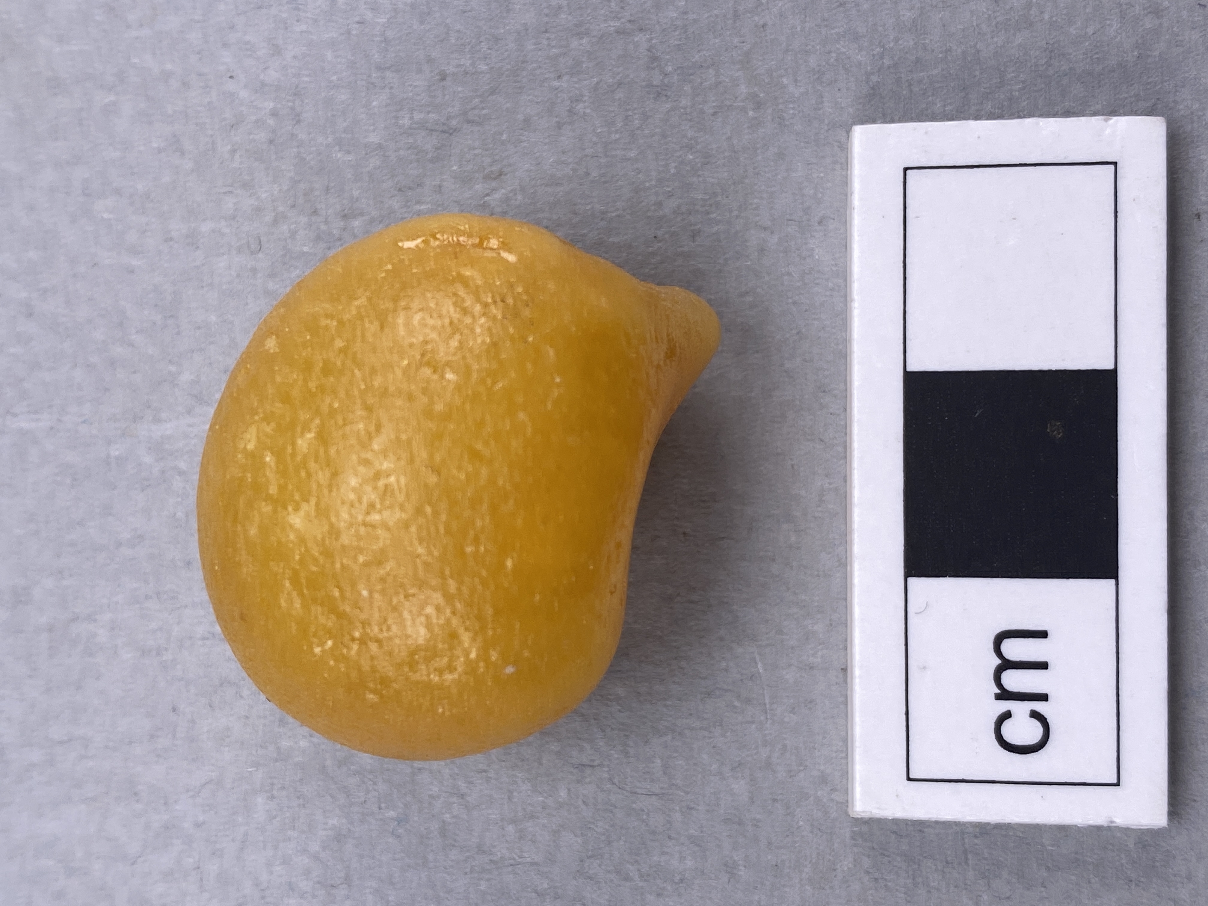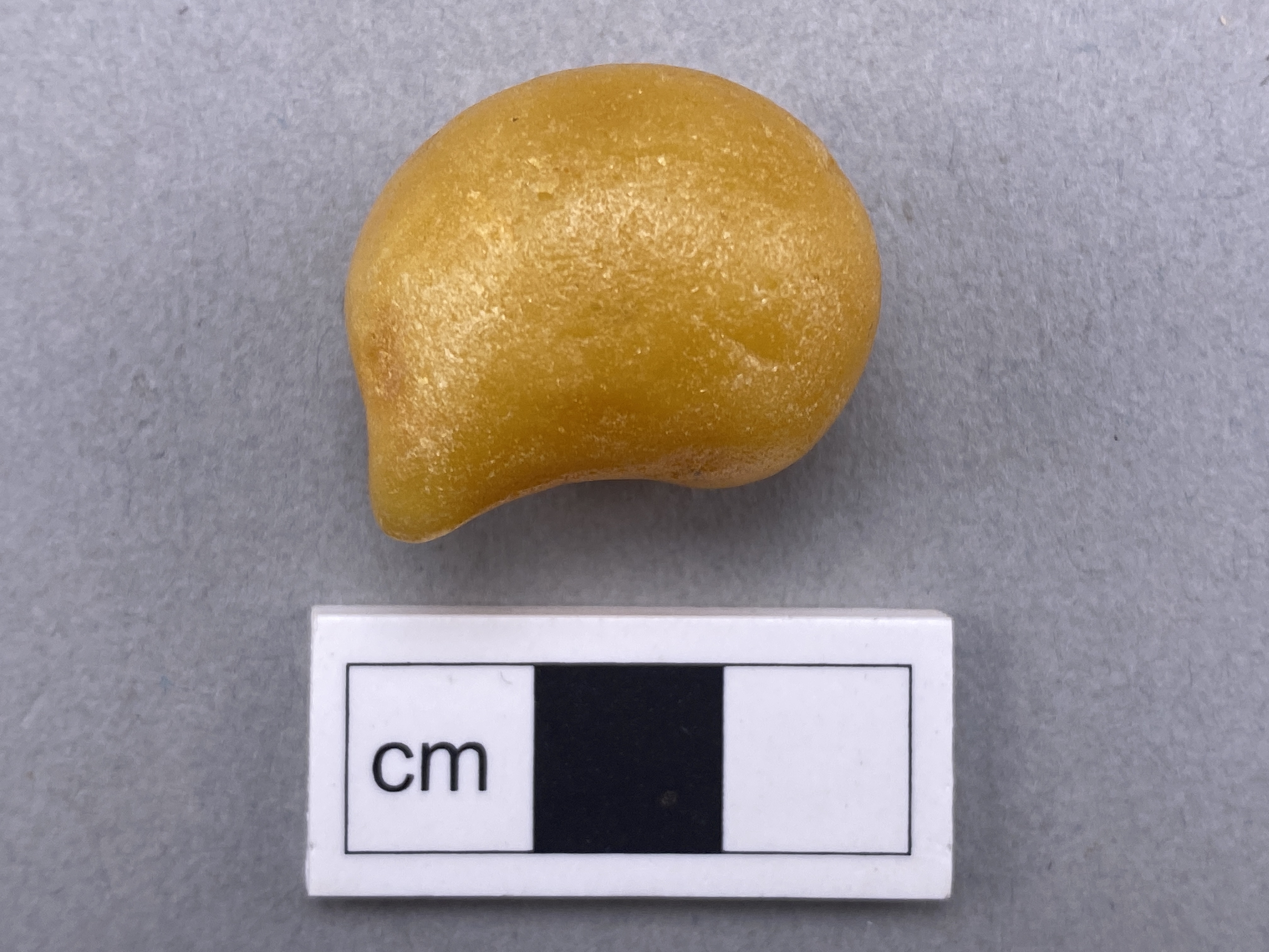 Stor, rund i formen. Svallad. Ej bearbetad. Droppformat klot kåda som smalnar av till en spets på ena sidan.