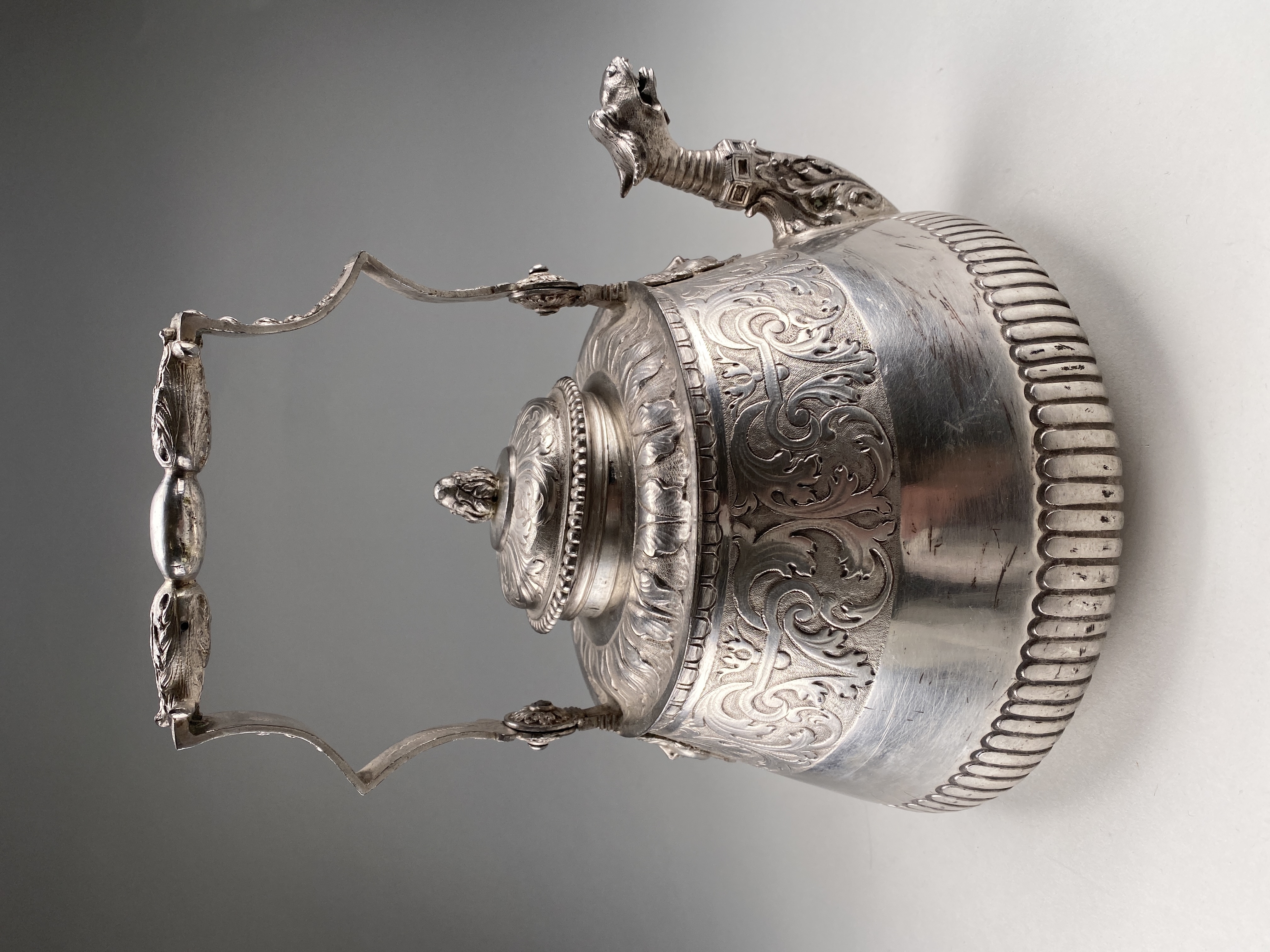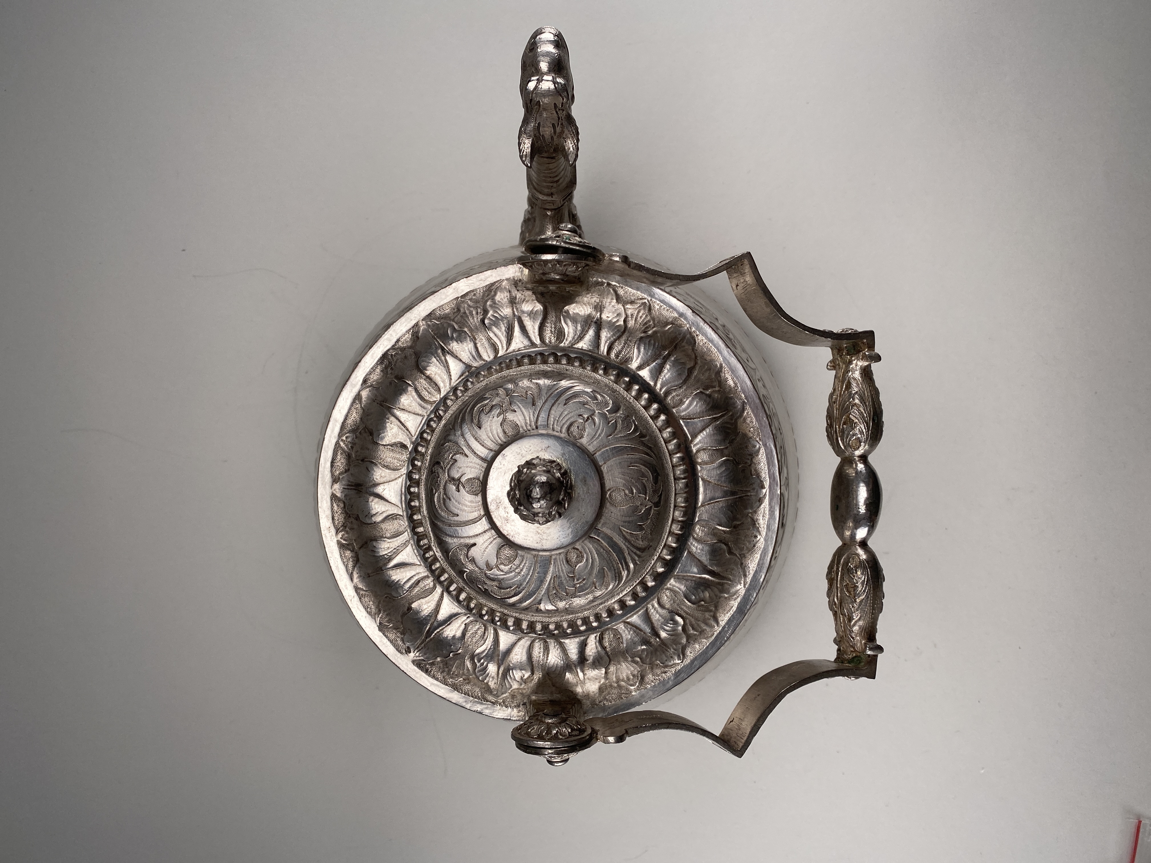 Tekanna med lock, gjuten och driven ornamentik med akantusblad, pärl- och äggstavar, maskaron m.m. allt i utpräglat klassisk form, pipen avslutad som ett drakhuvud. Två människoansikten, inramade av fjäderliknande former, sitter ett på varje sida nedanför hantagets infästningar. Inskrift på fotkantens undersida: IGB VS. Ristat i botten 100 1/4 l. Mästare Johan Schenck, Stockholm 1707. Hittad i kittel B, fylld med 912 mynt.
