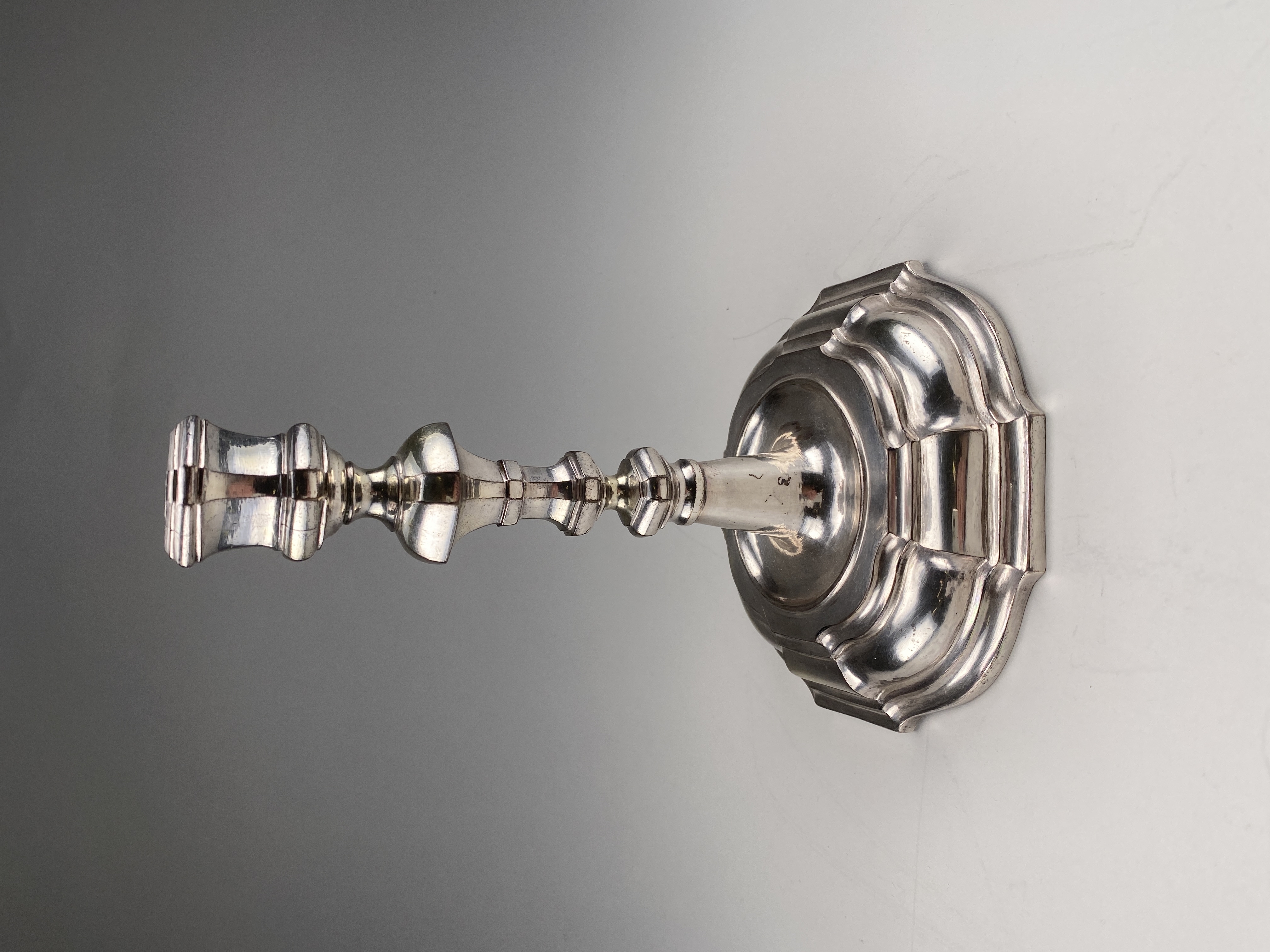 Ljusstake med åttkantig fot, rikt profilerad. Balusterliknande skaft med åttkantig profilerad ljuspipa. Saknar unr 21 i signeringen.