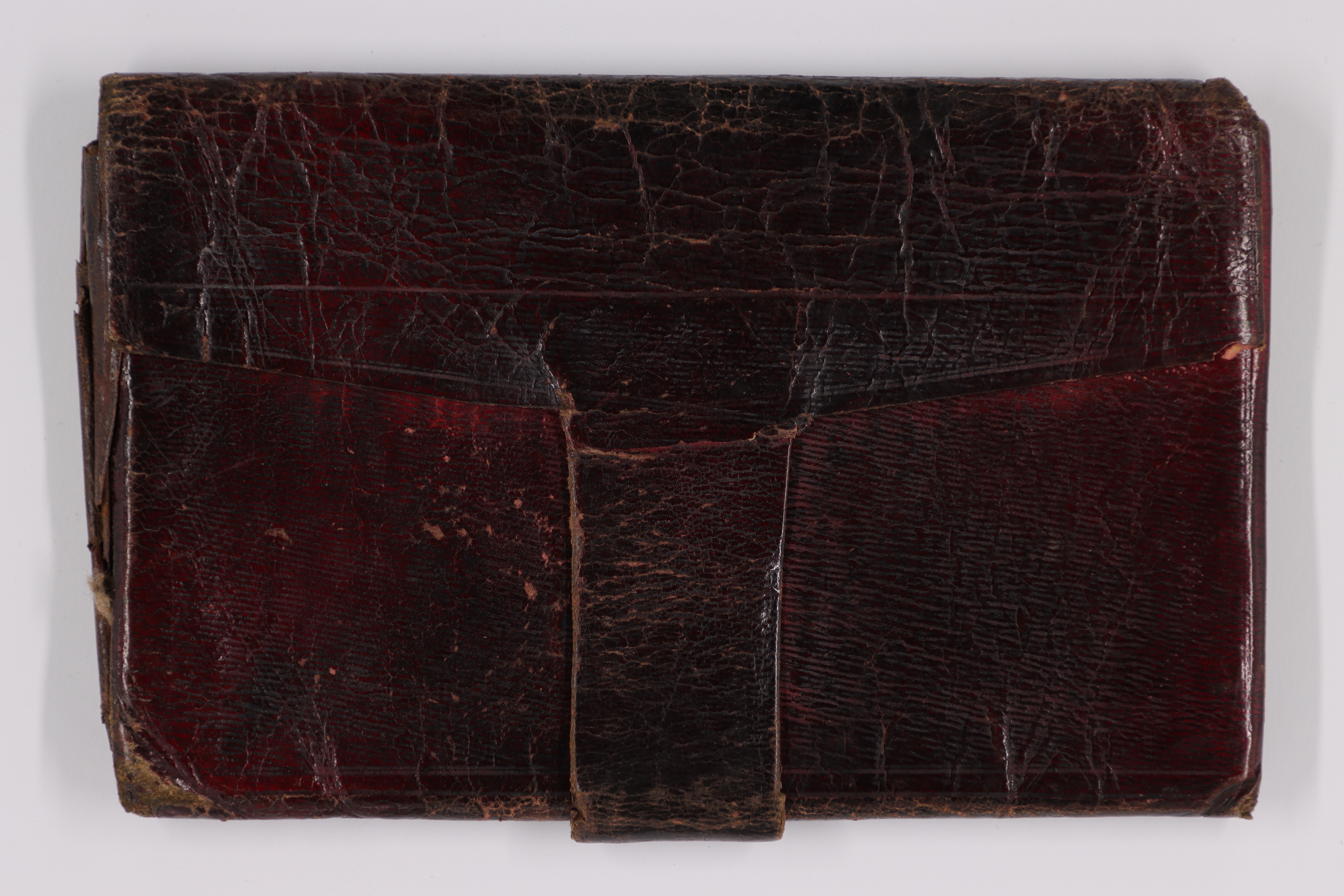 Plånbok av nu mörknat, tidigare rött läder. Plånboken stängs med en lång flik som viks runt kanten och dras igenom en hälla. Insidans fack av grönfärgad kartong som är mycket sliten.
