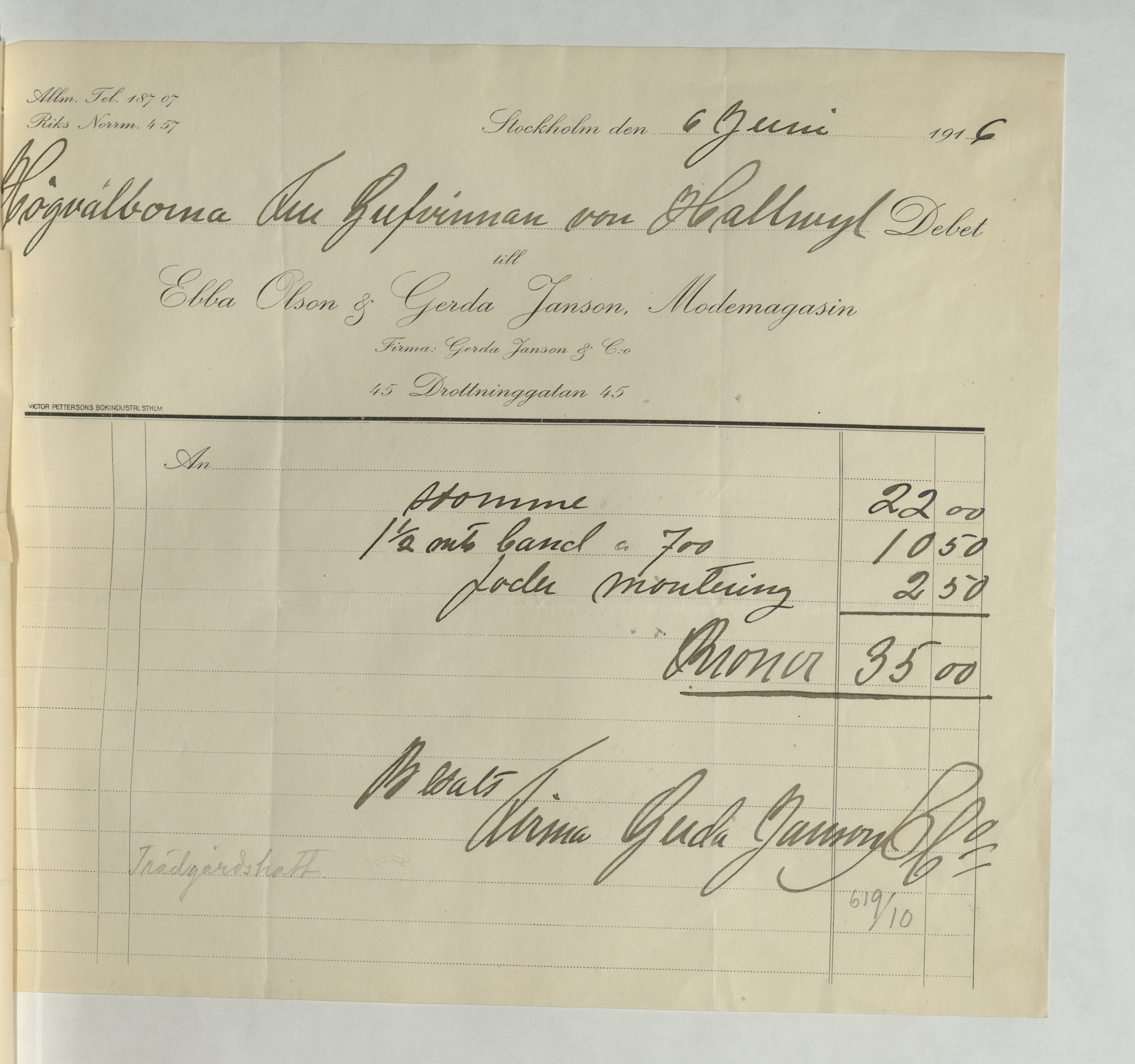 Kvitto från Ebba Olson & Gerda Janson, Modemagasin. Inköpt "stomme", samt band för montering, för en totalsumma av 35Kr. Betalt Stockholm 3 juni 1916.