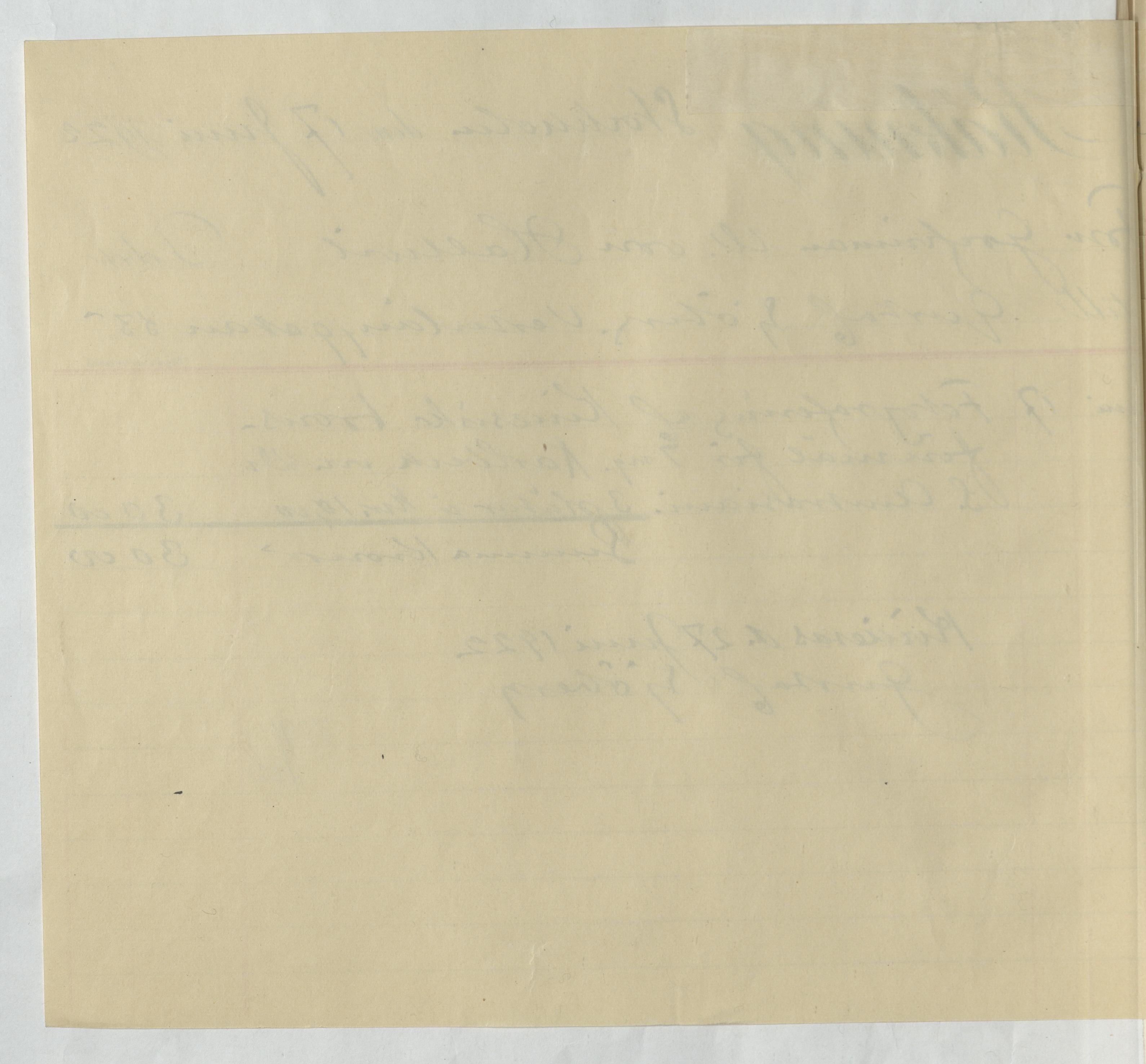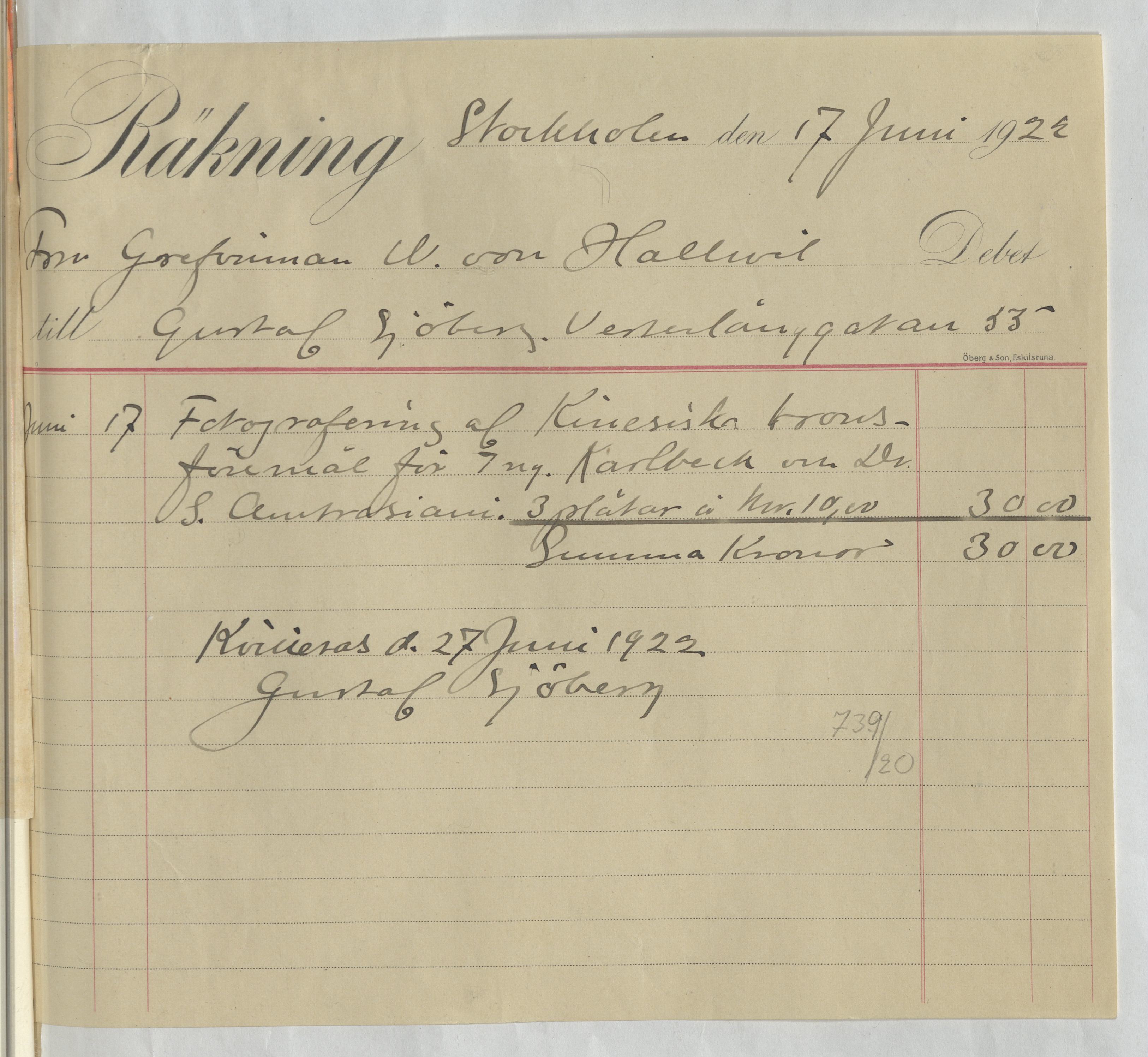 Kvitto från Gustaf Sjöberg. Gällande betalning för hans arbete med fotografering av museisamlingarna. Stockholm, 1922.