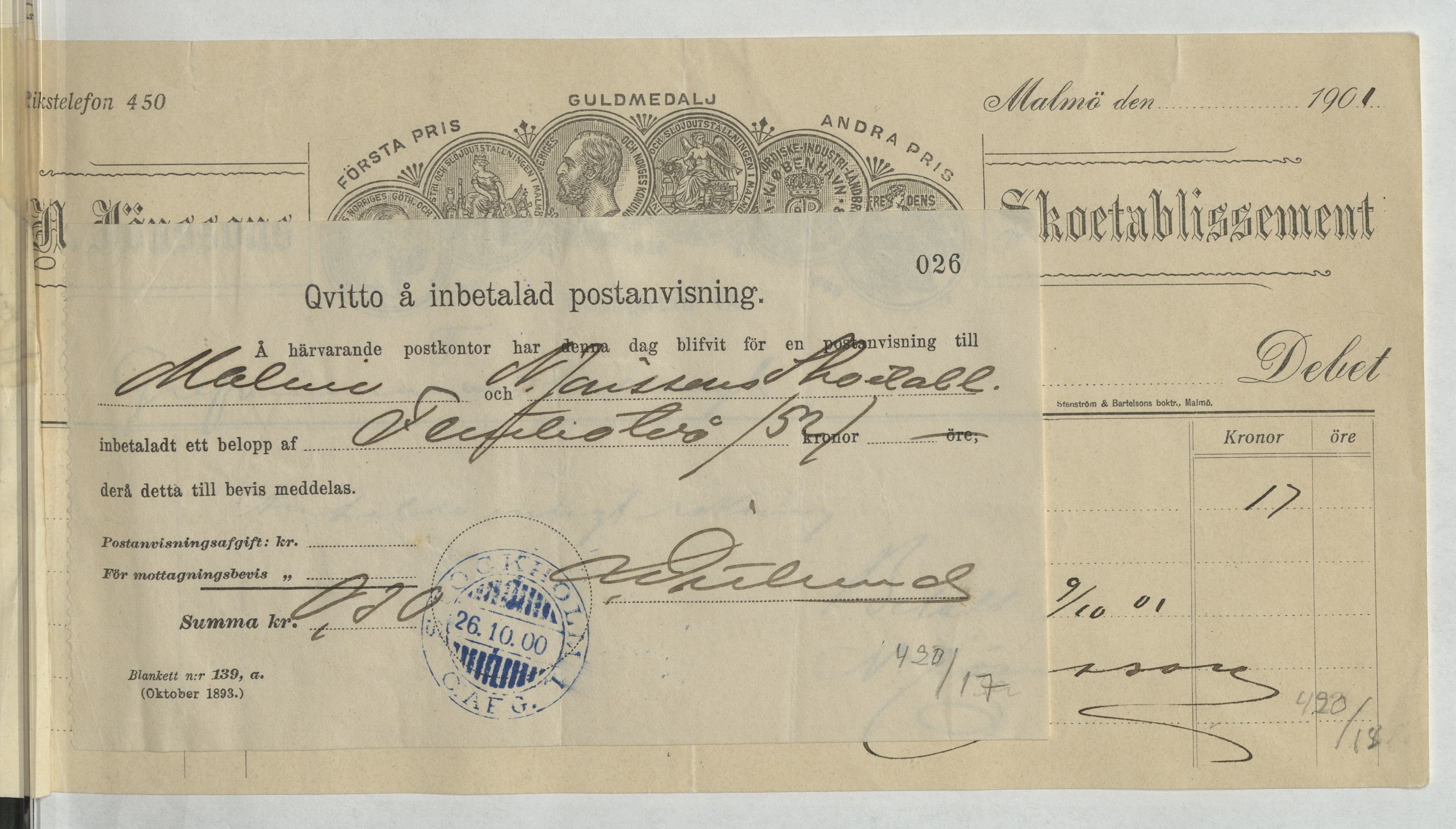 Kvitto från N. Jönssons Skoetablissement. Malmö, 1901.