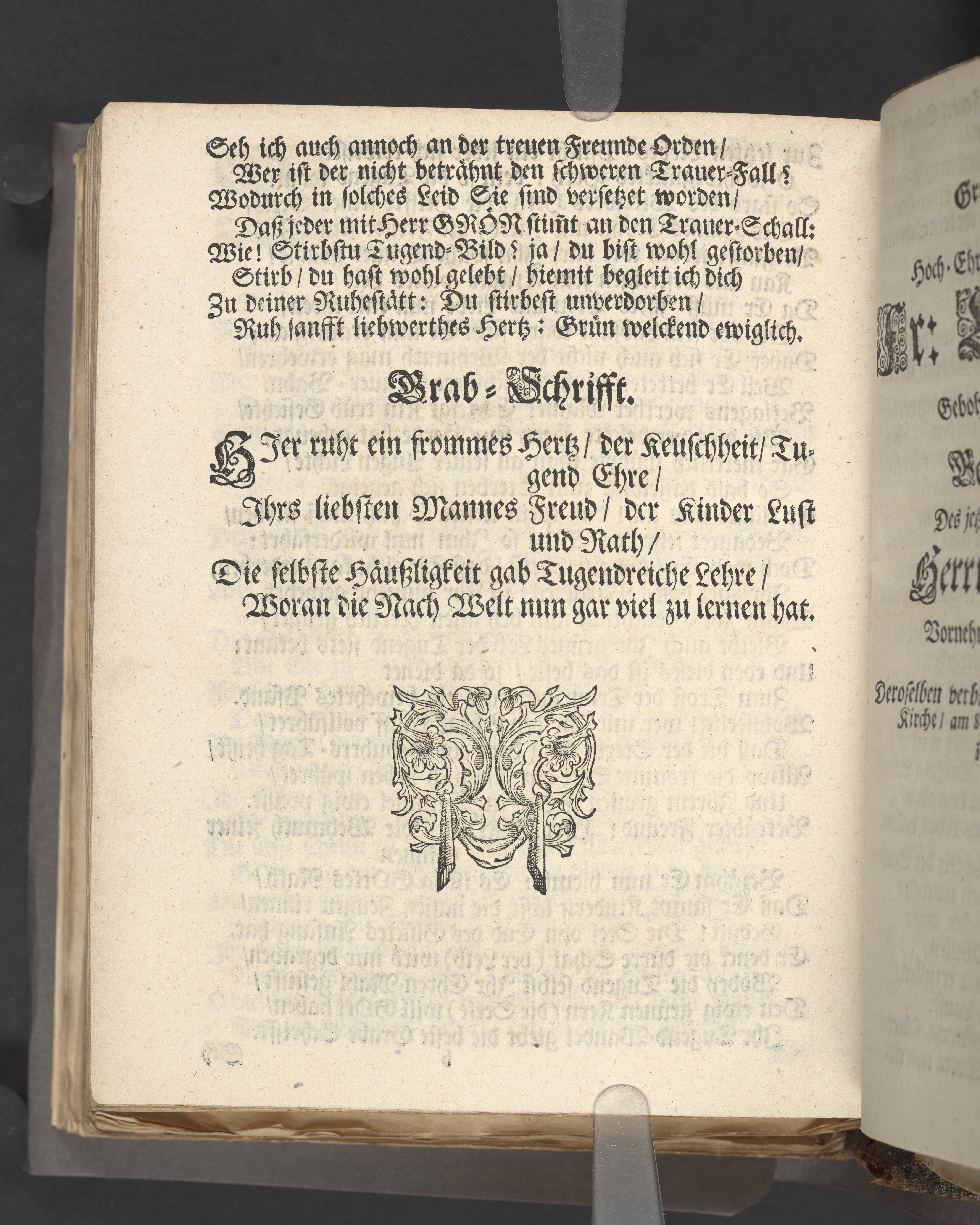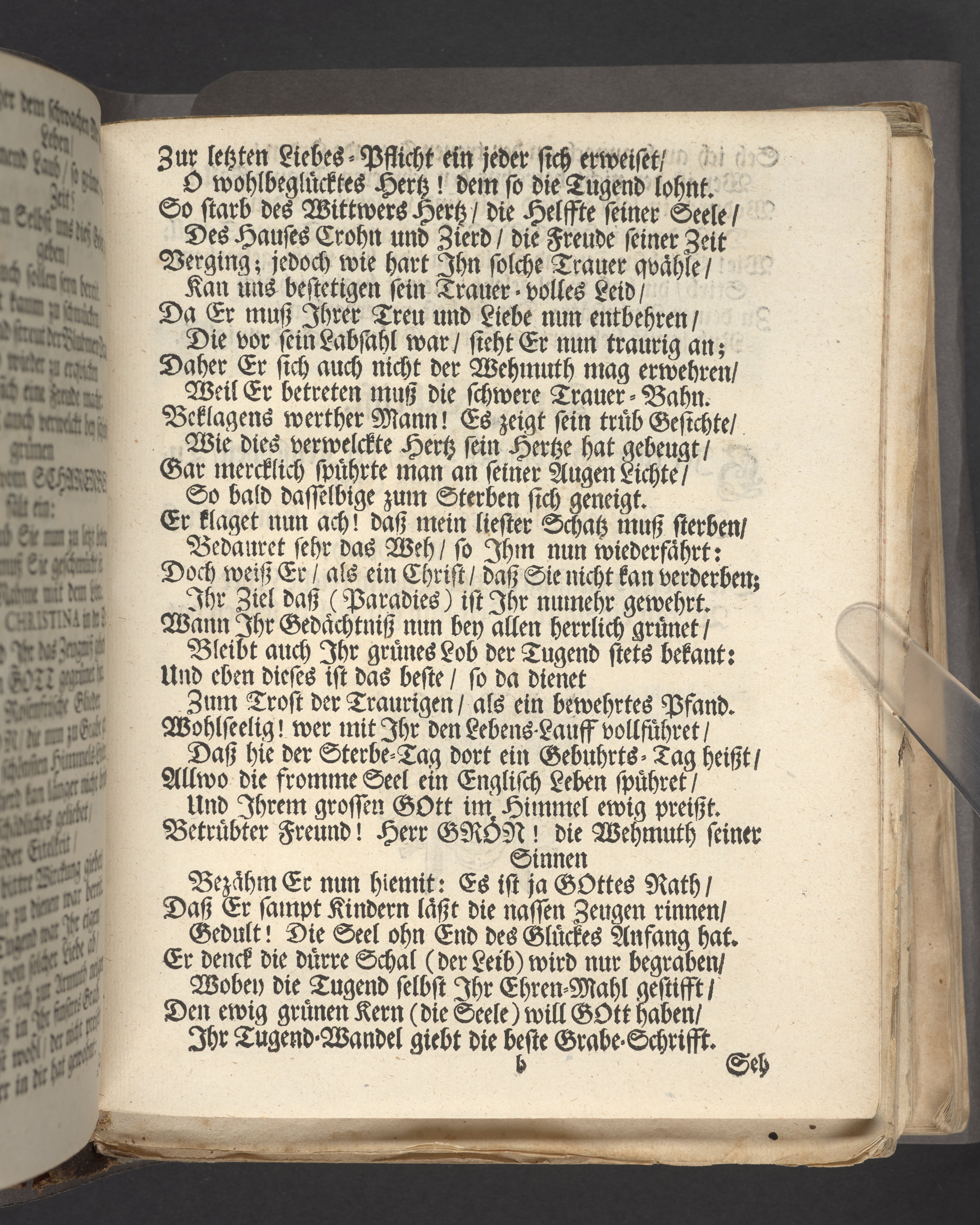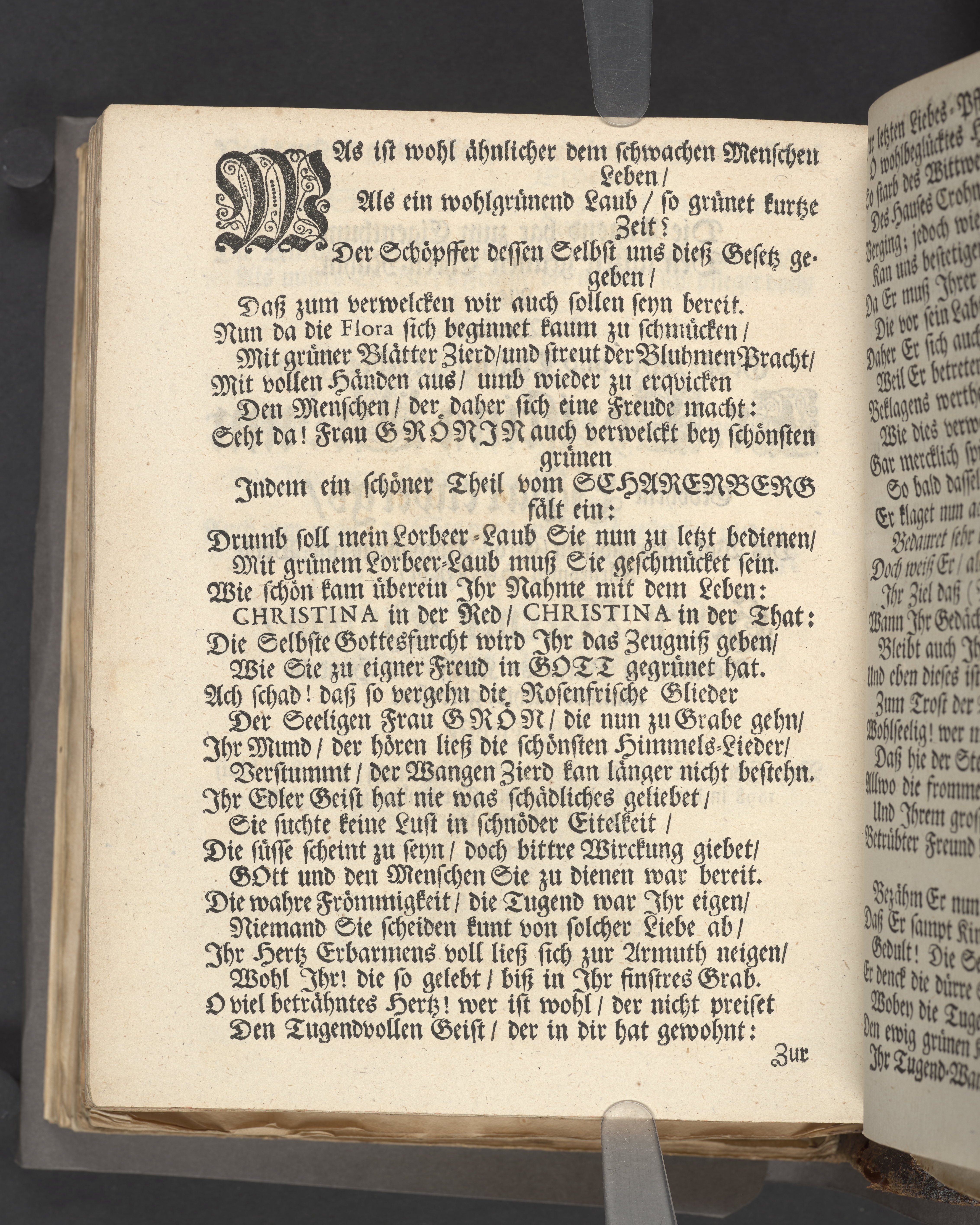 Die Tugend hat zum Eigenthum Den allzeit grünen Ehren-Ruhm. Als die weyland gross- ehr- und Tugend-beliebte Frau/ Fr. Christina Grönin gebohrne Scharenbergs/ des wohl-ehrenvesten/ gross-achtbahren/ und wohl-fürnehmen Herrn/ Herrn Werner Gröns/ vornehmen Bürgers/ kauf-und handels-mannes allhie/ gewesene ehe-liebste bey hochansehnlicher Trauer-Versamlung/ den 8:ten Maij 1698 in der St: Maria Kirchen/ christümligs zu Ihrer Ruhe befodert ward/ vorgestelet von Eberh. Christian Spöring, hiesiger Teutschen Schulen Con-R.