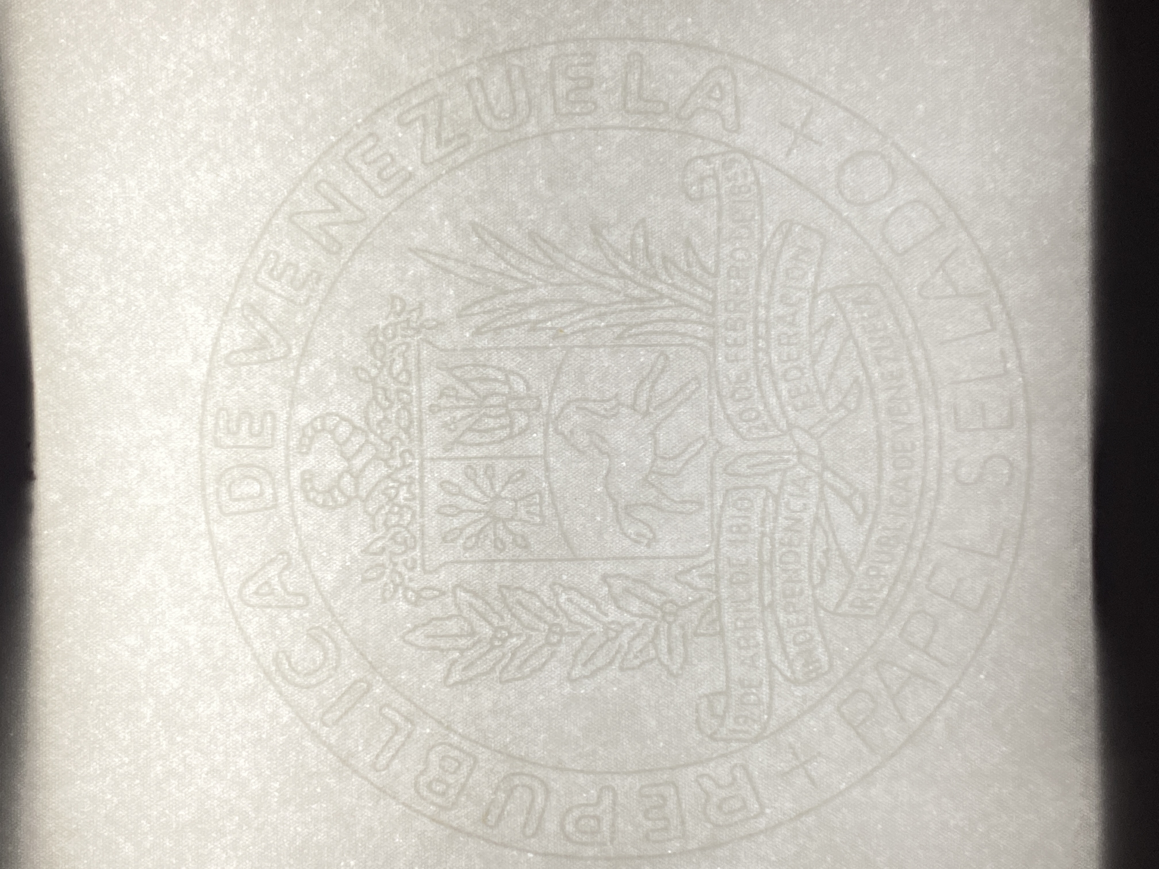 Paket innehållandes 103 stycken pappersark tillverkade vid Tumba bruk. Med enkelverkande vattenmärke föreställande Venezuelas stadsvapen omgärdat av texten: "REPUBICA DE VENEZUELA PAPEL SELLADO".