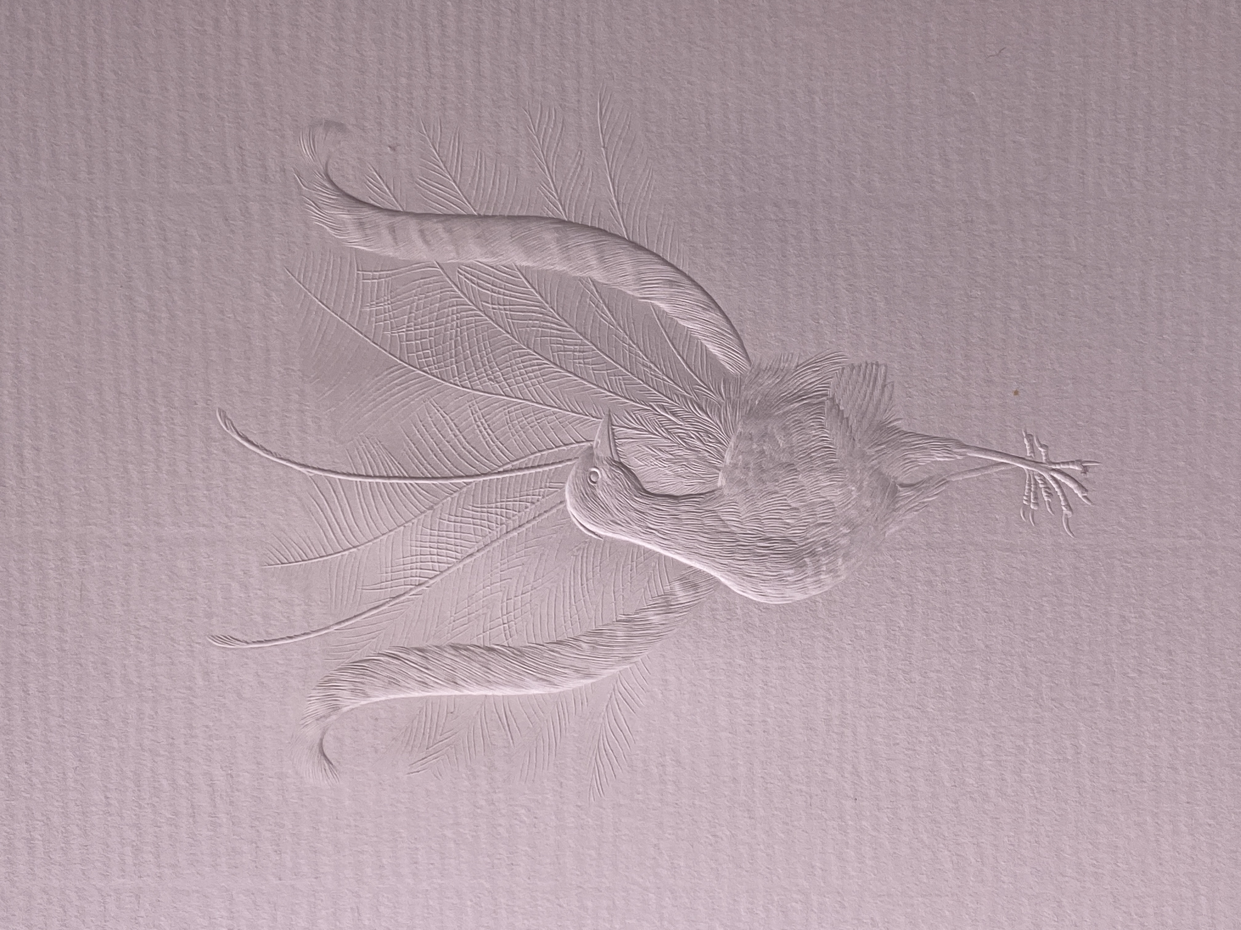 Ett pappersark av typen Tre Kronor tillverkade på Tumba bruk. Vitt papper med relief föreställande fågel.
