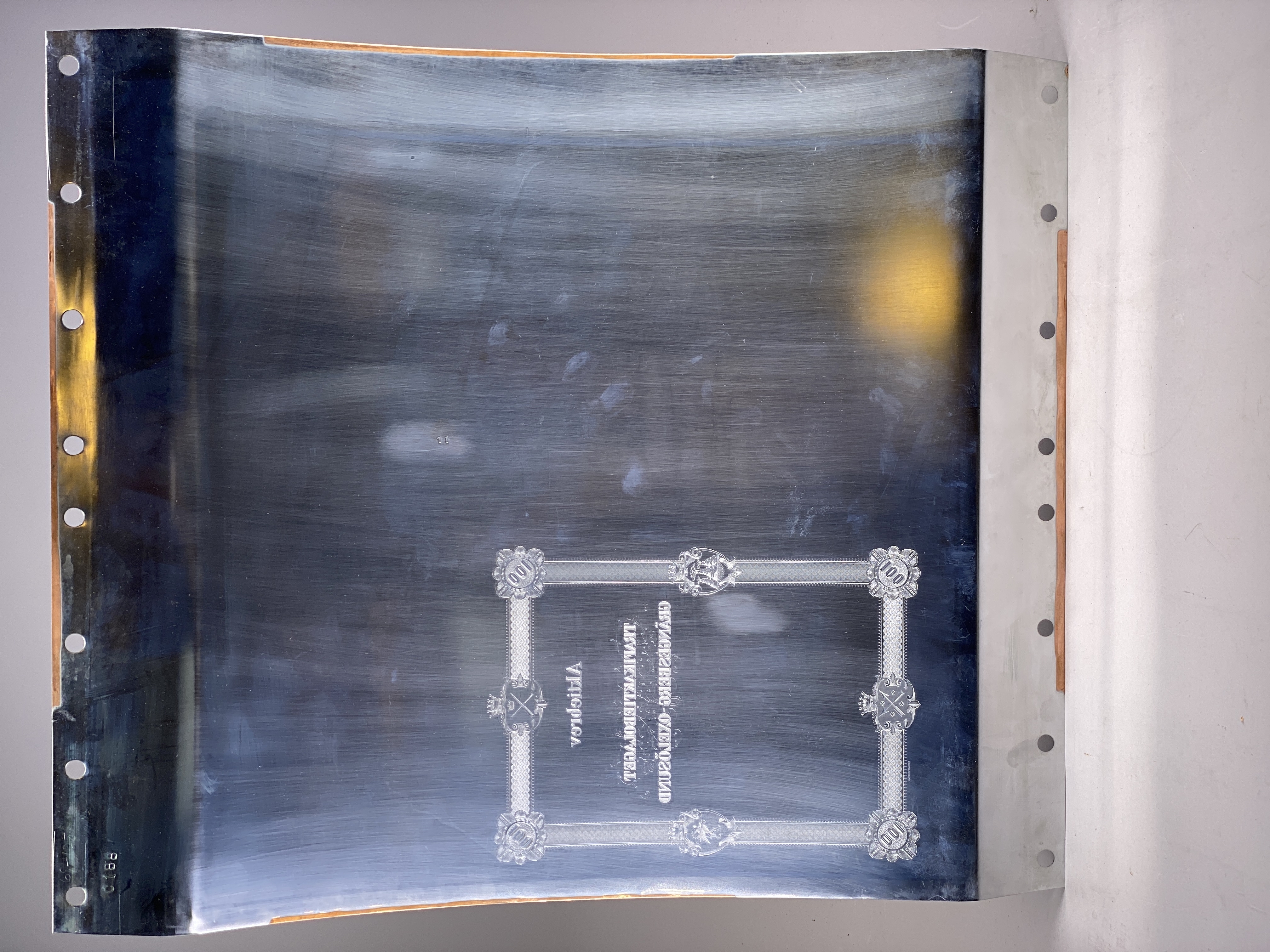 Tryckplåt för aktiebrev på 100 kr från Trafikaktiebolaget. Rektangulär plåt tillverkad i förkromad koppar. Framsidan av plåten med gravyr föreställande ram med flera ornament, däribland fyra vapensköldar. Två vapensköldar med korslagda pilar, en sköld med grip och en sköld med tre vulkaner. Innanför ramen graverad påskrift: "Aktiebrev. TRAFIKAKTIEBOLAGET GRÄNGESBERG-OXELÖSUND". Plåten stämplad: "C188".