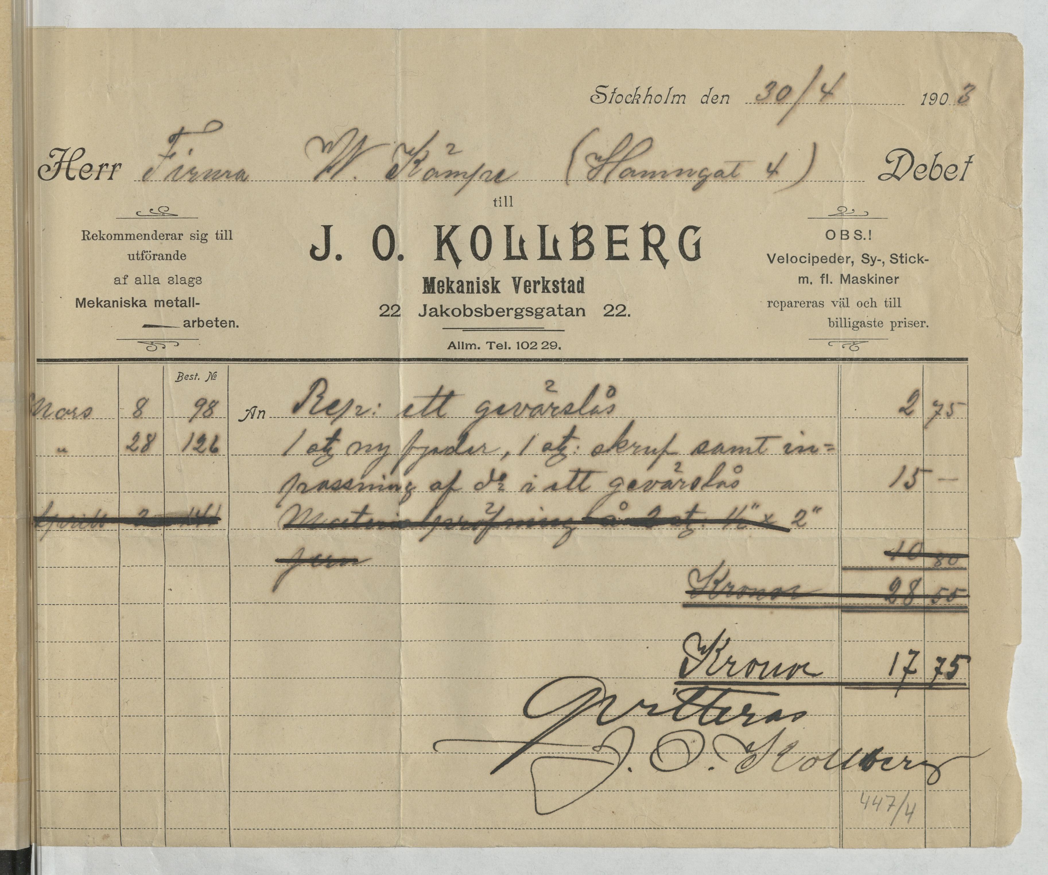 Kvitto från J. O. Kollberg, Mekanisk Verkstad. Stockholm, 1903.