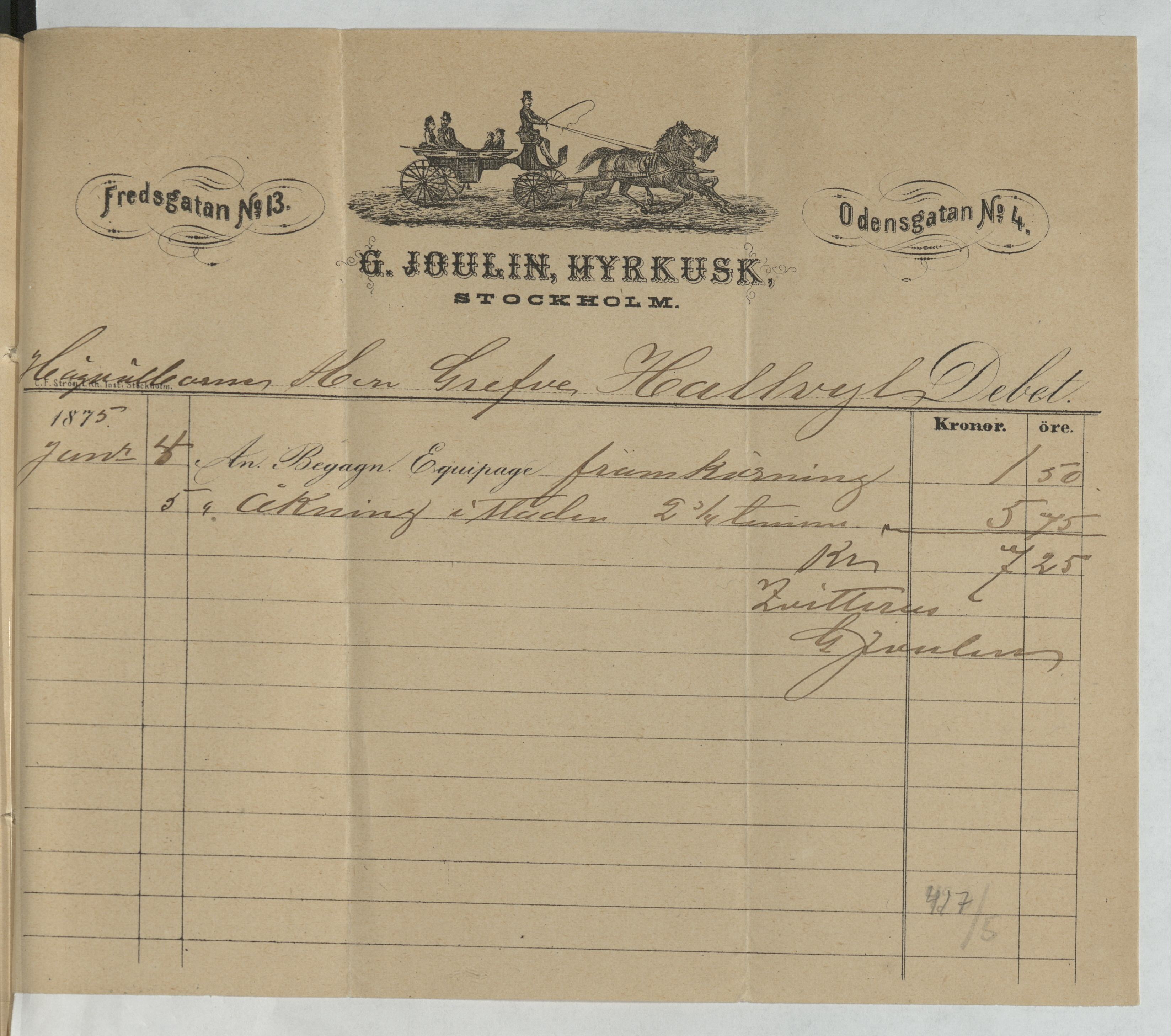 Kvitto från G. Joulin, Hyrkusk. Gällande framkörning och åkning i staden. Stockholm, 1875.