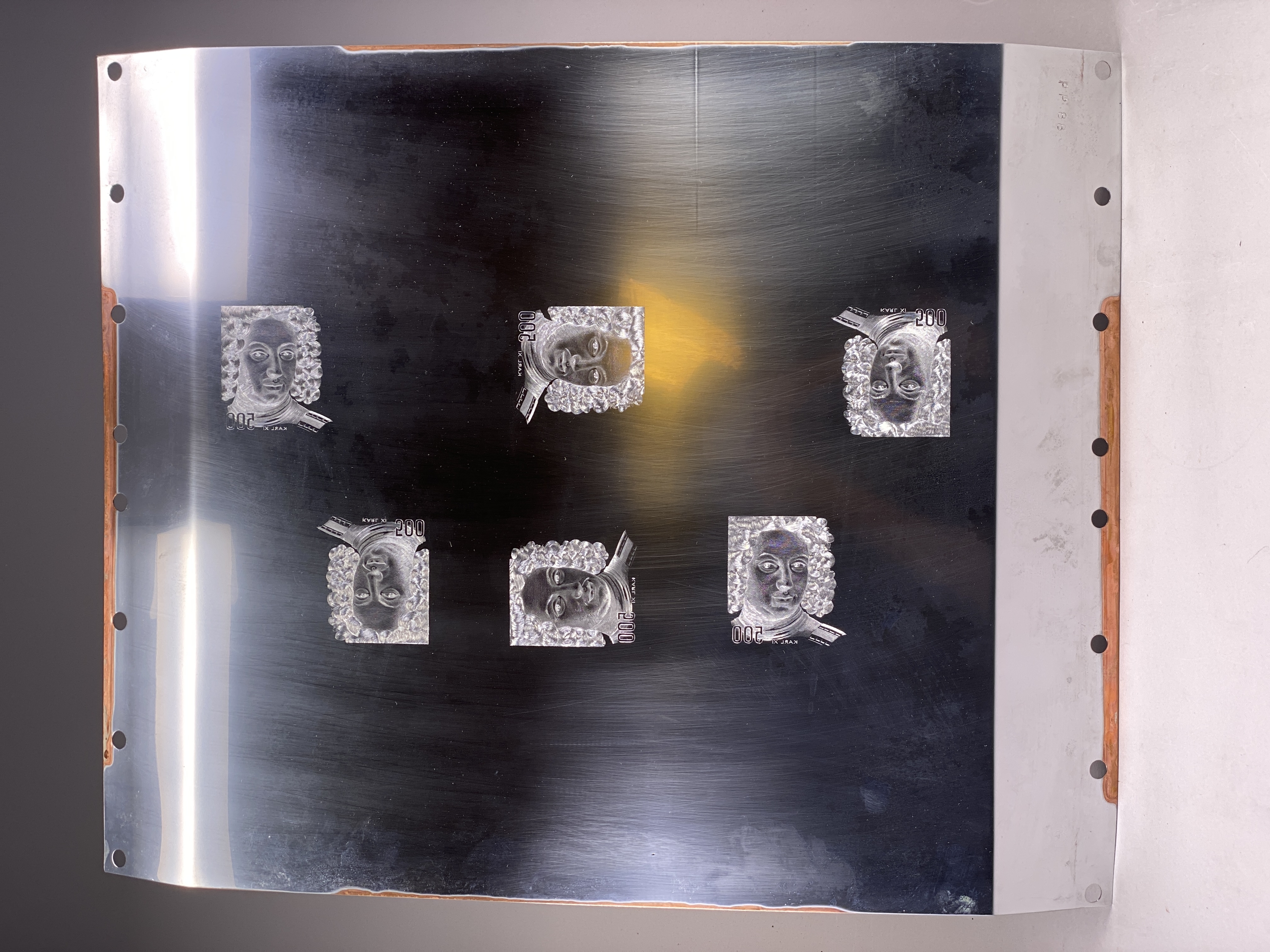 Tryckplåt med okänt användningsområde. Med tillhörande kuvert. Rektangulär plåt tillverkad i rostfritt stål och koppar. Framsidan med graverat porträtt föreställande Karl XI samt inskriften: "500". Plåten stämplad: "PP88".