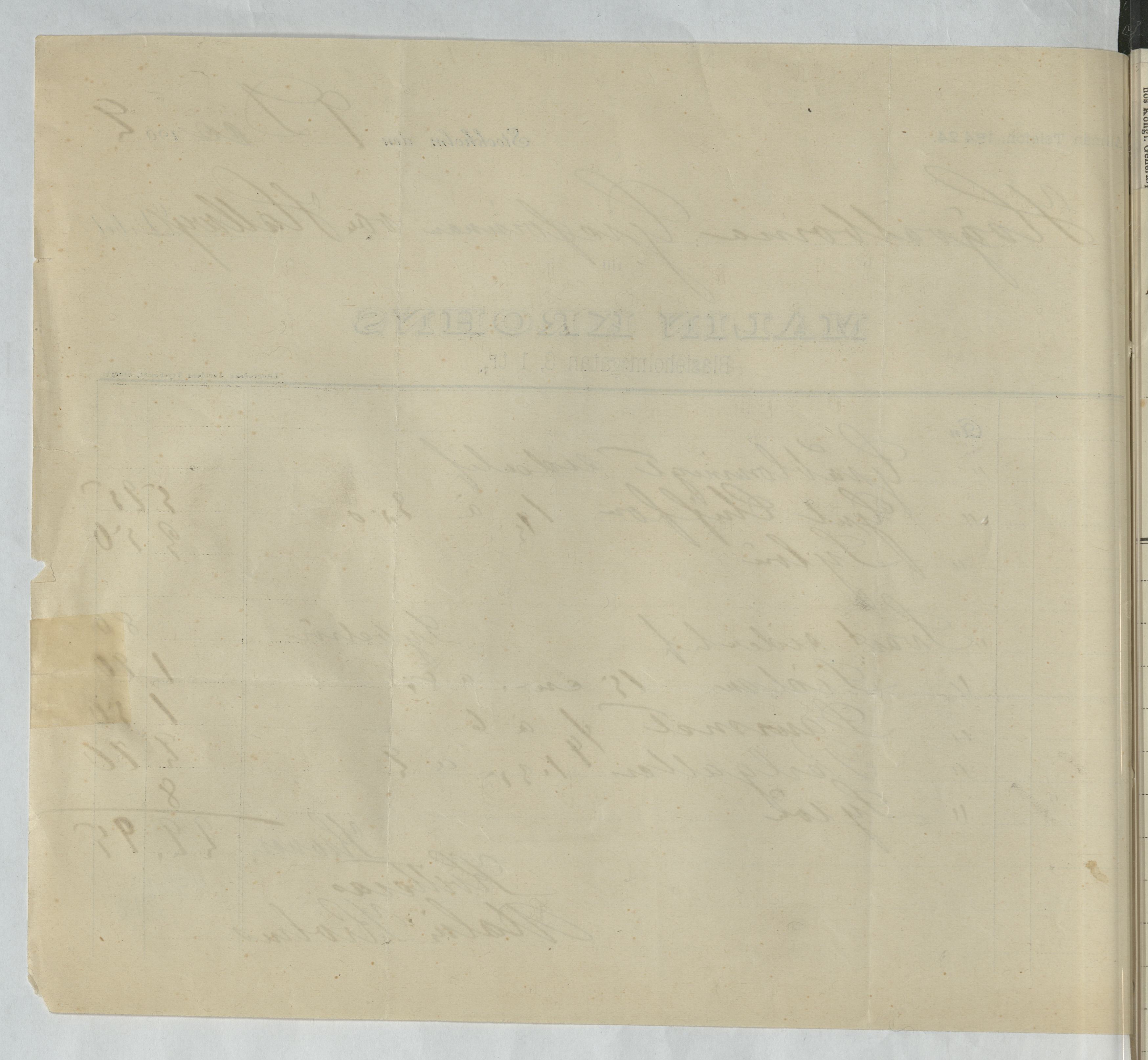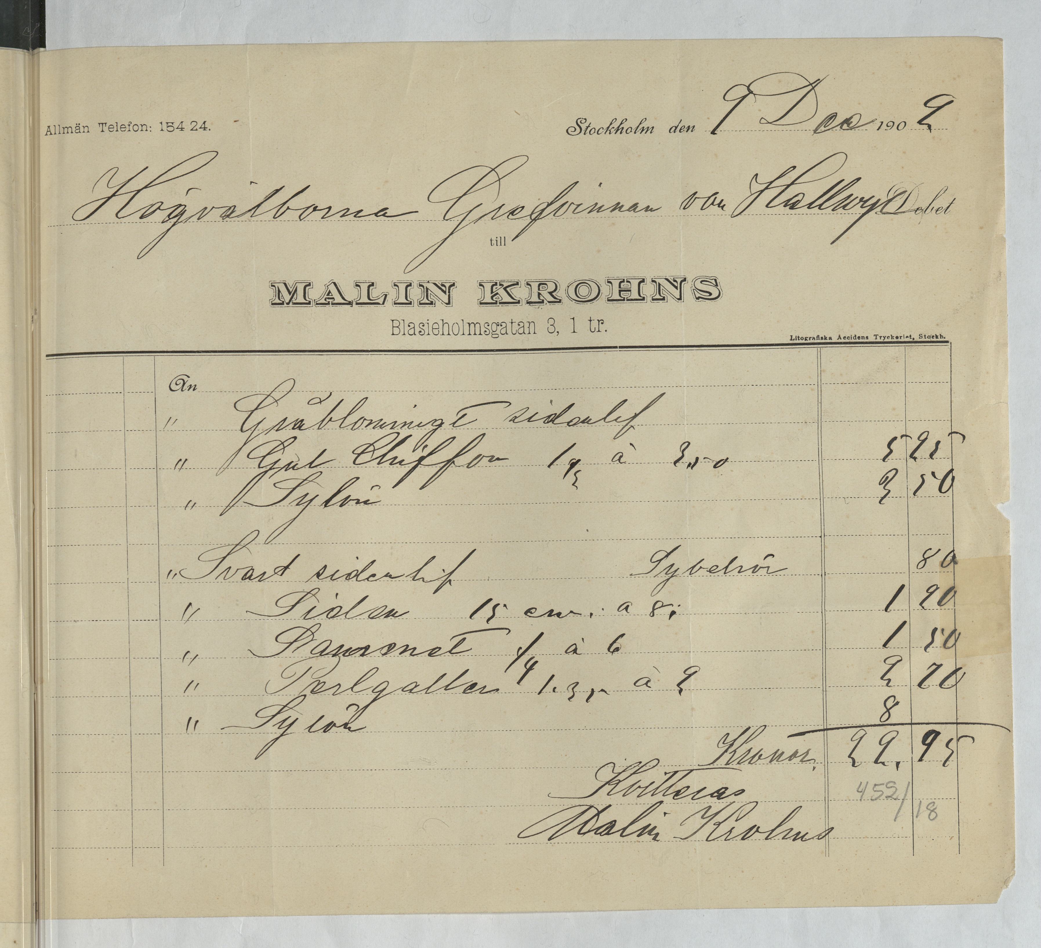 Kvitto från Malin Krohns ateljé. Gällande material och sylön. Stockholm, 1902.