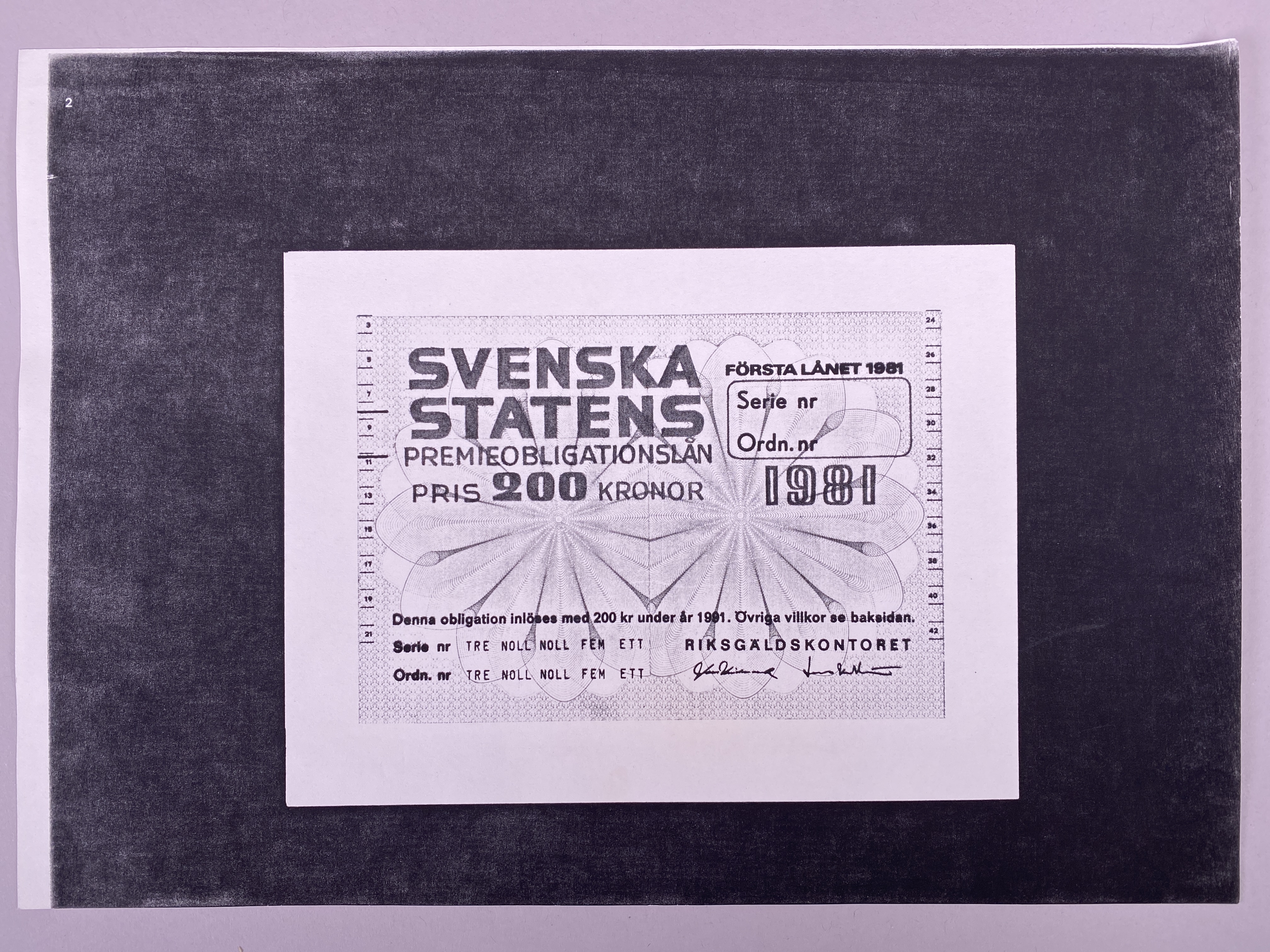 Fotostatkopia på obligation som "inlöses med 200 kr under år 1991". Första lånet 1981. Serie nr 30051, ord. nr 30051. Designförslag (no. 2, övre vänstra hörnan)