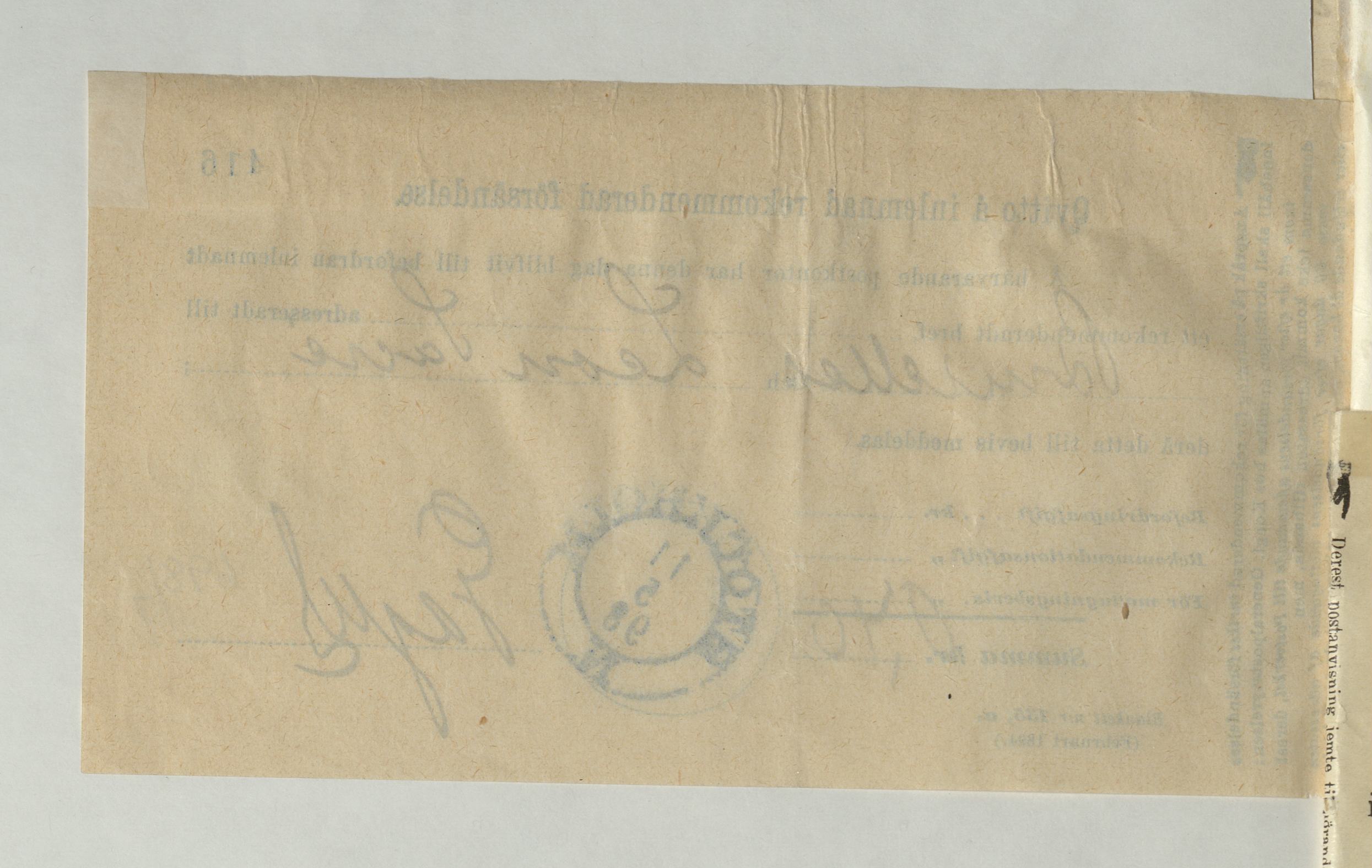 Kvitto på inlämnad assurerad postförsändelse till Léon Sacré, Manufactures de Dentelles, Bruxelles från Stockholm. Stockholm, 11 maj 1898.