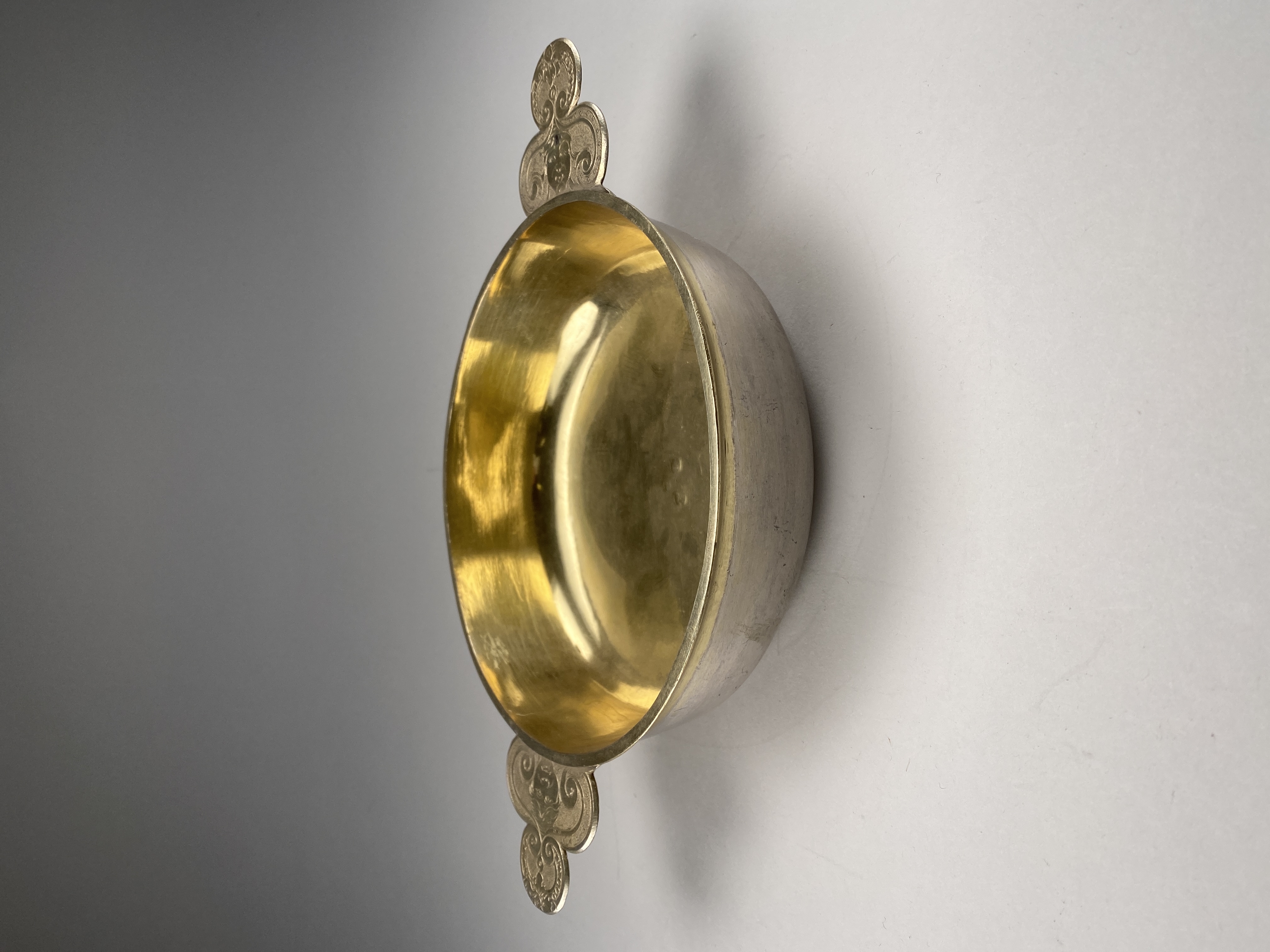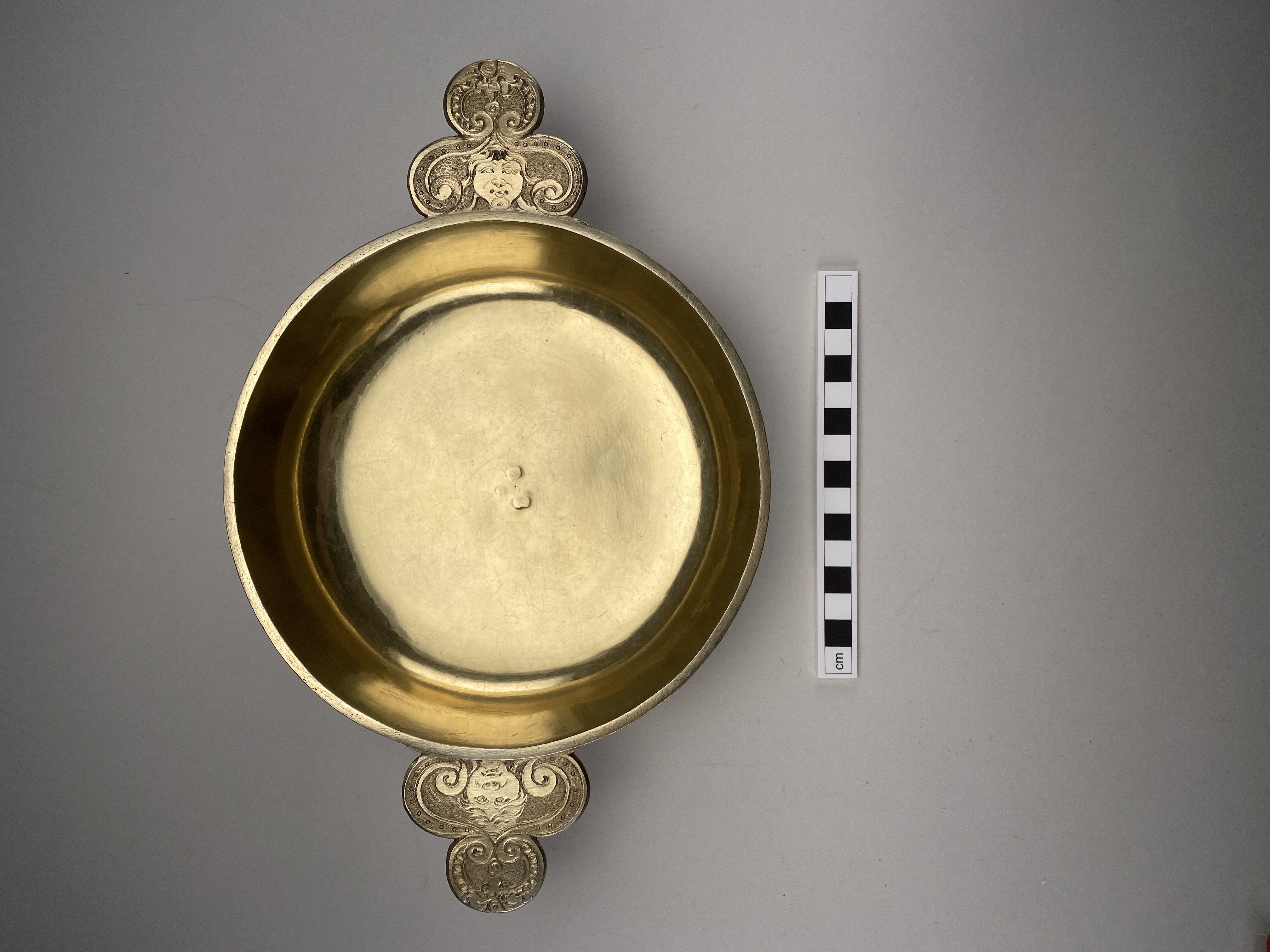 Skål av låg modell med två treklöverformade snibbar med graverad dekor i form av ansikten på ovansidan. Matt silver, insida, kant och snibbar förgyllda. Hittad i kittel A.