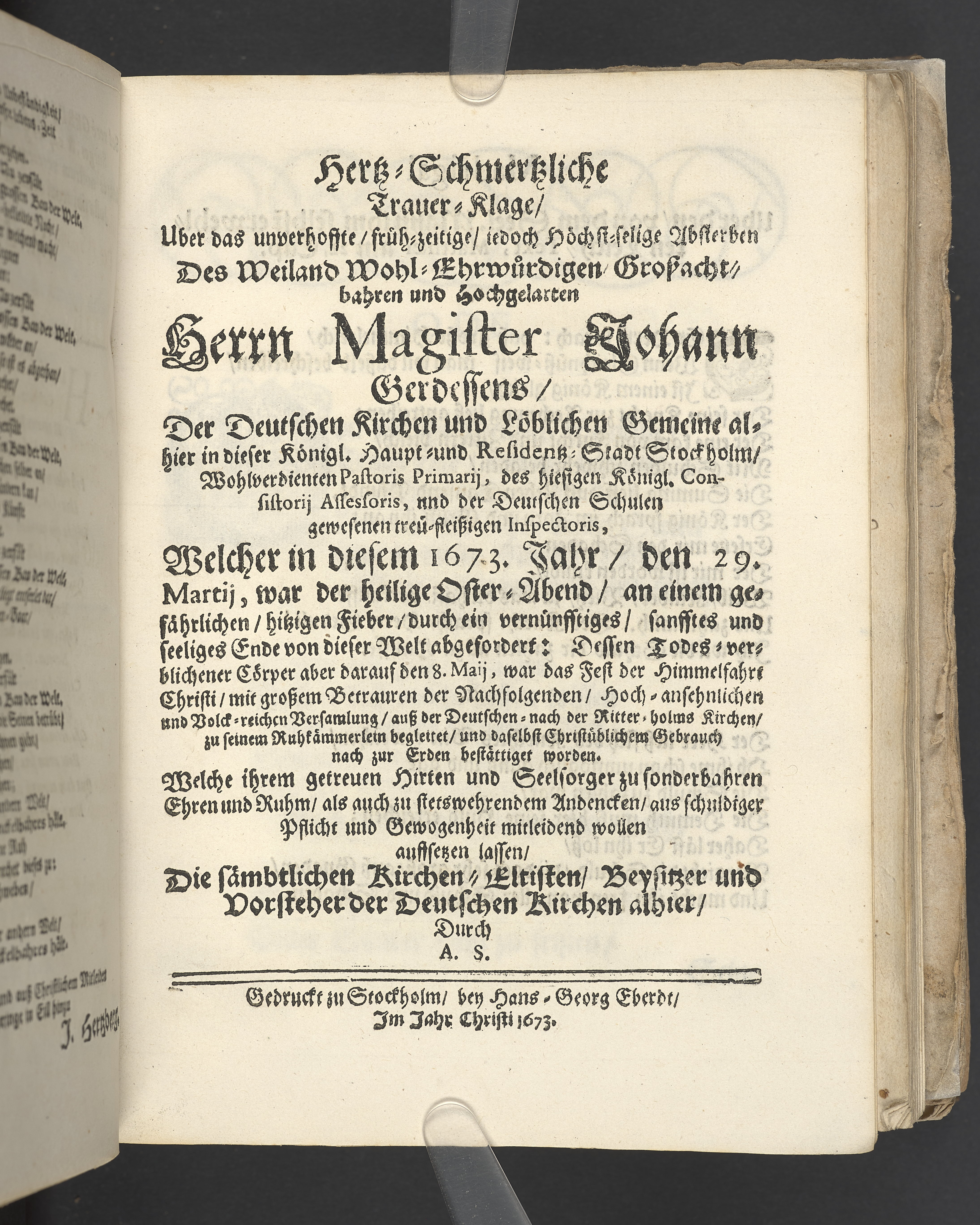 Hertz-Schmertzliche Trauer-Klage/ uber das unverhoffte/ frü-zeitige/ iedoch höchst-selige Absterben des weyland wohl-ehrwürdigen/ groszachtbahren und hochgelarten Herrn Magister Johann Gerdessens/ der Deutschen Kirchen und Löblichen Gemeine alhier in dieser Königl. Haupt- und Residentz-Stadt Stockholm/ wohlverdienten Pastoris Primarij, des hiesigen Königl. Consistorij Assesoris, und der Deutschen Schulen gewesenen treu-fleiszigen Inspectoris, welcher in diesem 1673. Jahr/ den 29. Martij, war der heilige Ofter-Abend/ an einem gwfährlichen/ hitzigen Fieber/ durch ein vernünffftiges/ sanfftes und seeliges Ende von dieser Welt abgefordert: dessen Todes-verblichener Cörper aber darauf den 8. Maij, war das Fest der Himmelfahrt Christi/ mit groszem Betrauren der Nachfolgenden/ hoch-ansehnlichen und Volck-reichen Versamlung/ ausz der Deutschen-nach der Ritter-holms Kirchen/ zu seinem Ruhkämmerlein beglettet/ unddaselbst Christübliche, Gebrauch nach zur Erden bestättiget worden. Welche ihrem getreuen Hirten und Seelsorger zu sonderbahren Ehren und Rhm/ als auch zu stetswehrendem Andencken/ aus schuldiger Pflicht und Gewogenheit mitleidend wollen auffsehen lassen/ die sämbtlichen Kirchen-Eltisten/ Beysitzer und Vorteher der Deutschen Kirchen alhier/ durch A.S.