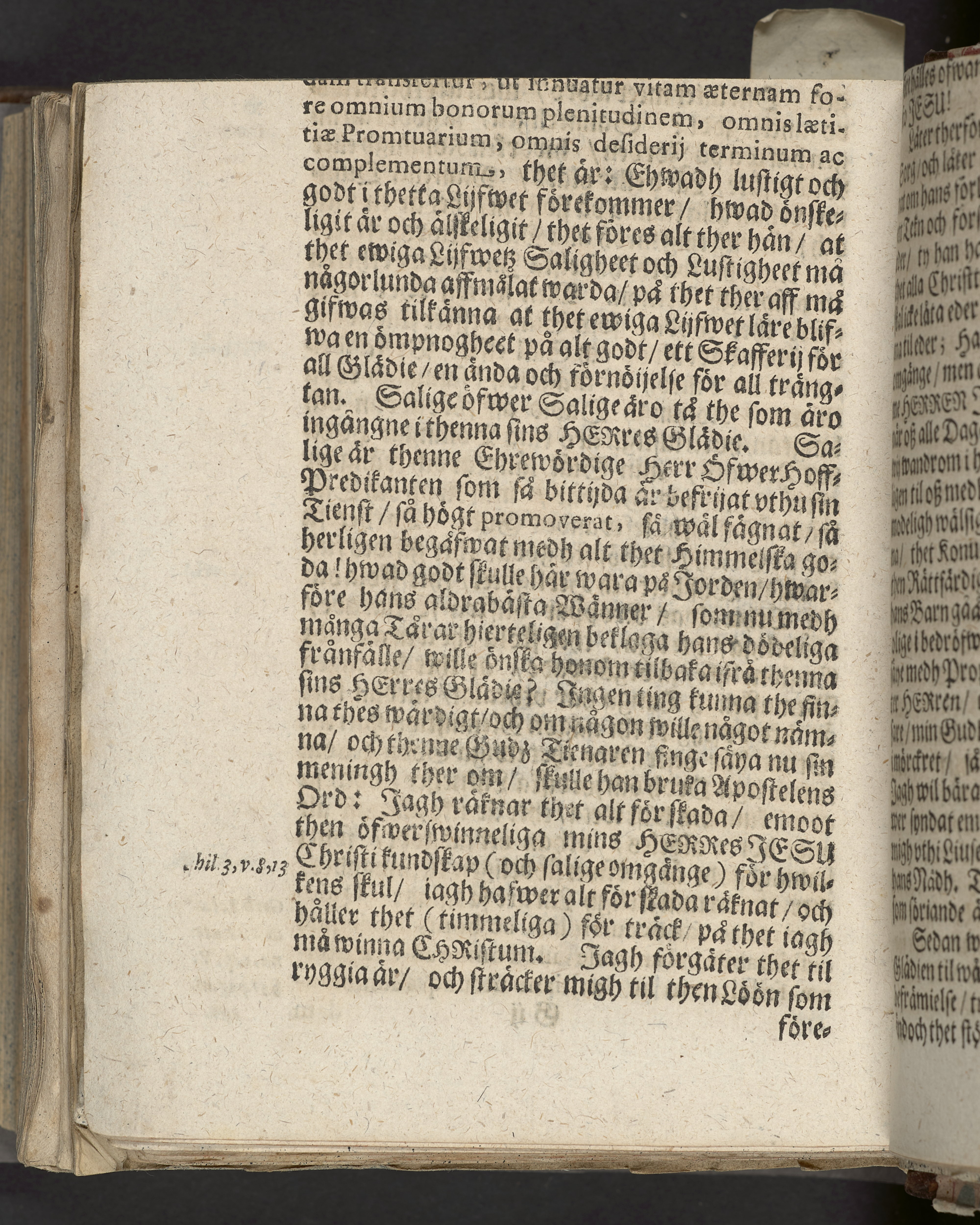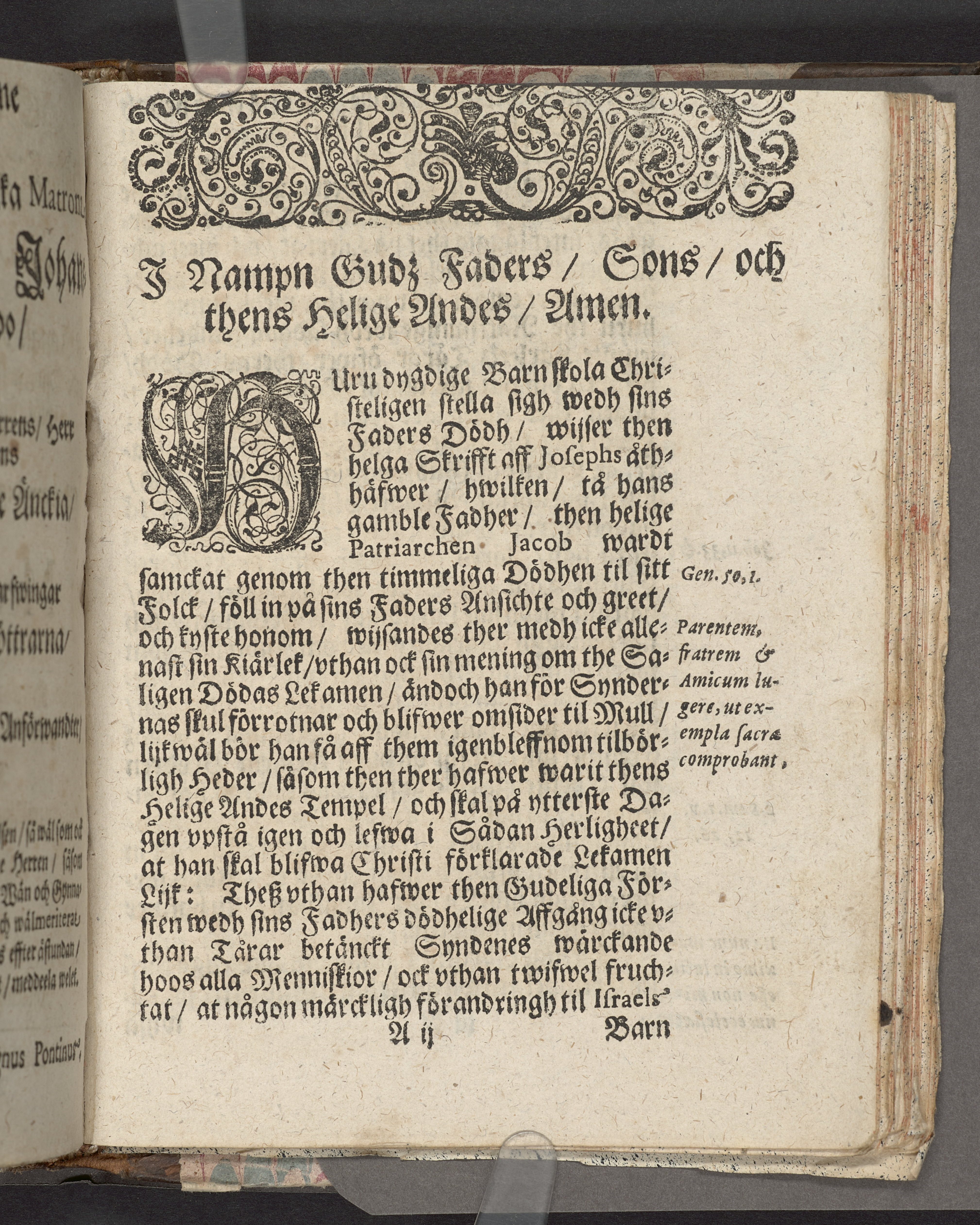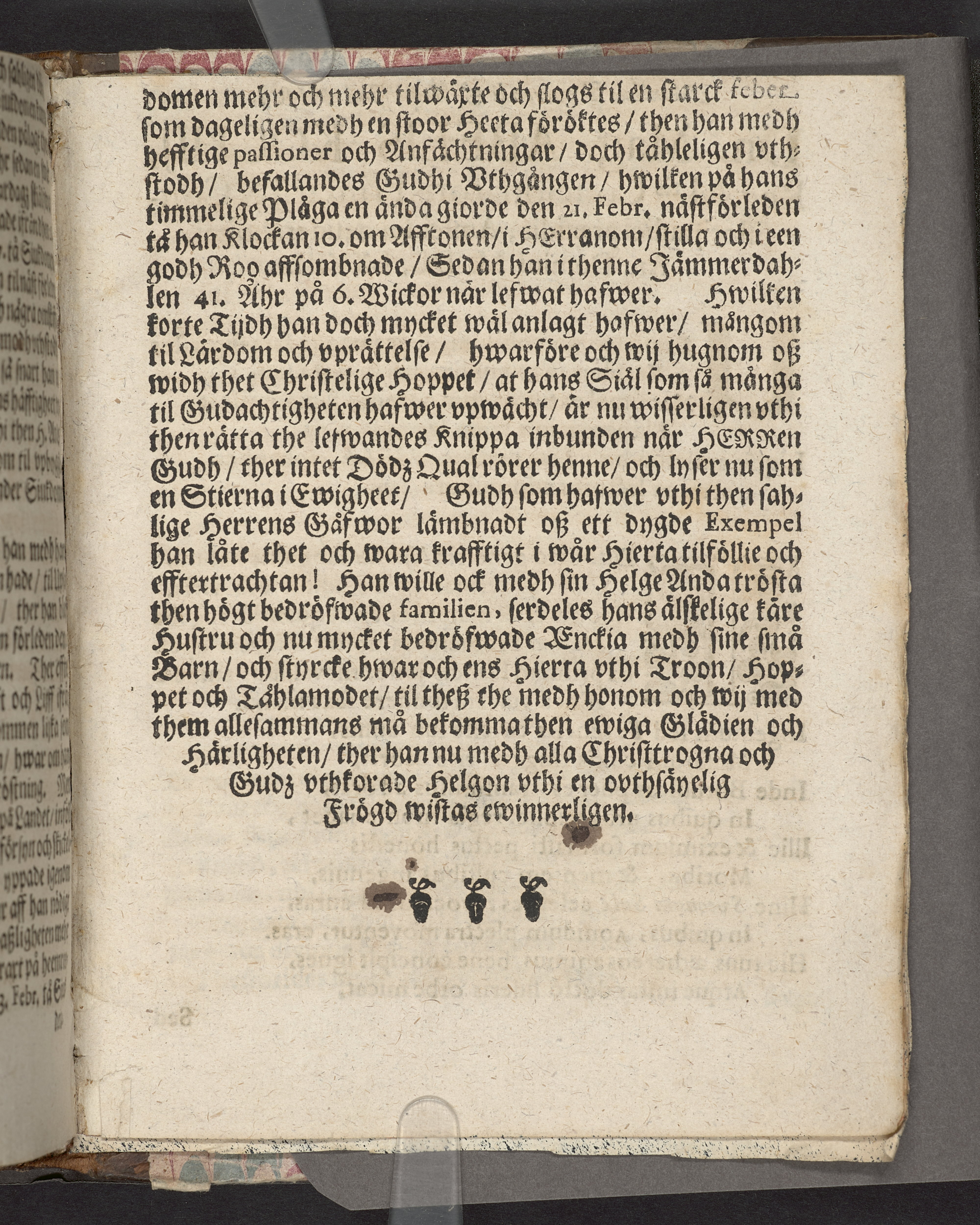 I sammelband med 26 tryck. Högst upp på titelsidan anteckning i bläck med uppgifter om födelse- och dödsdatum för den avlidna. Övre och nedre snitten stänkta i blått. På främre snittet ursprunglig röd färg.