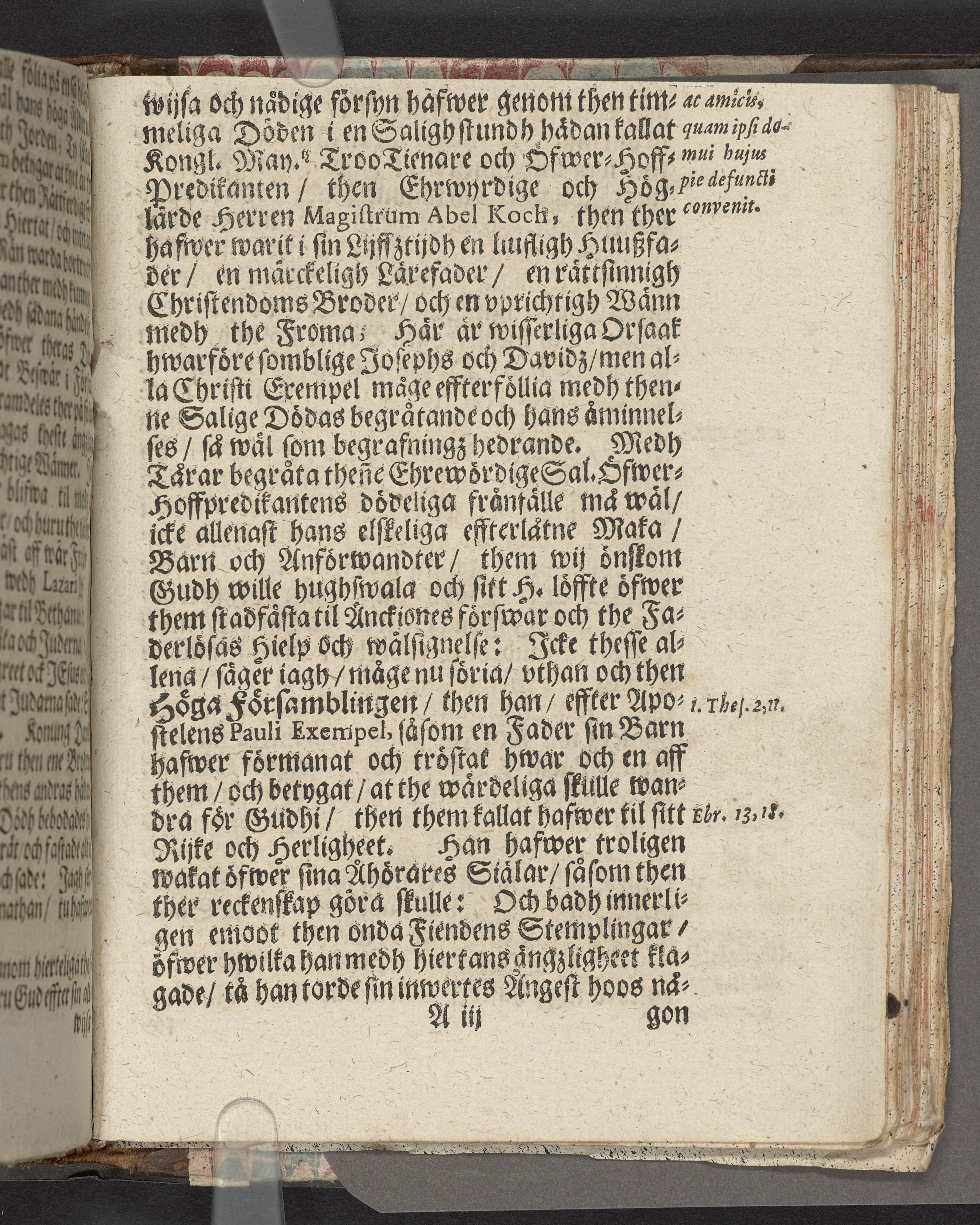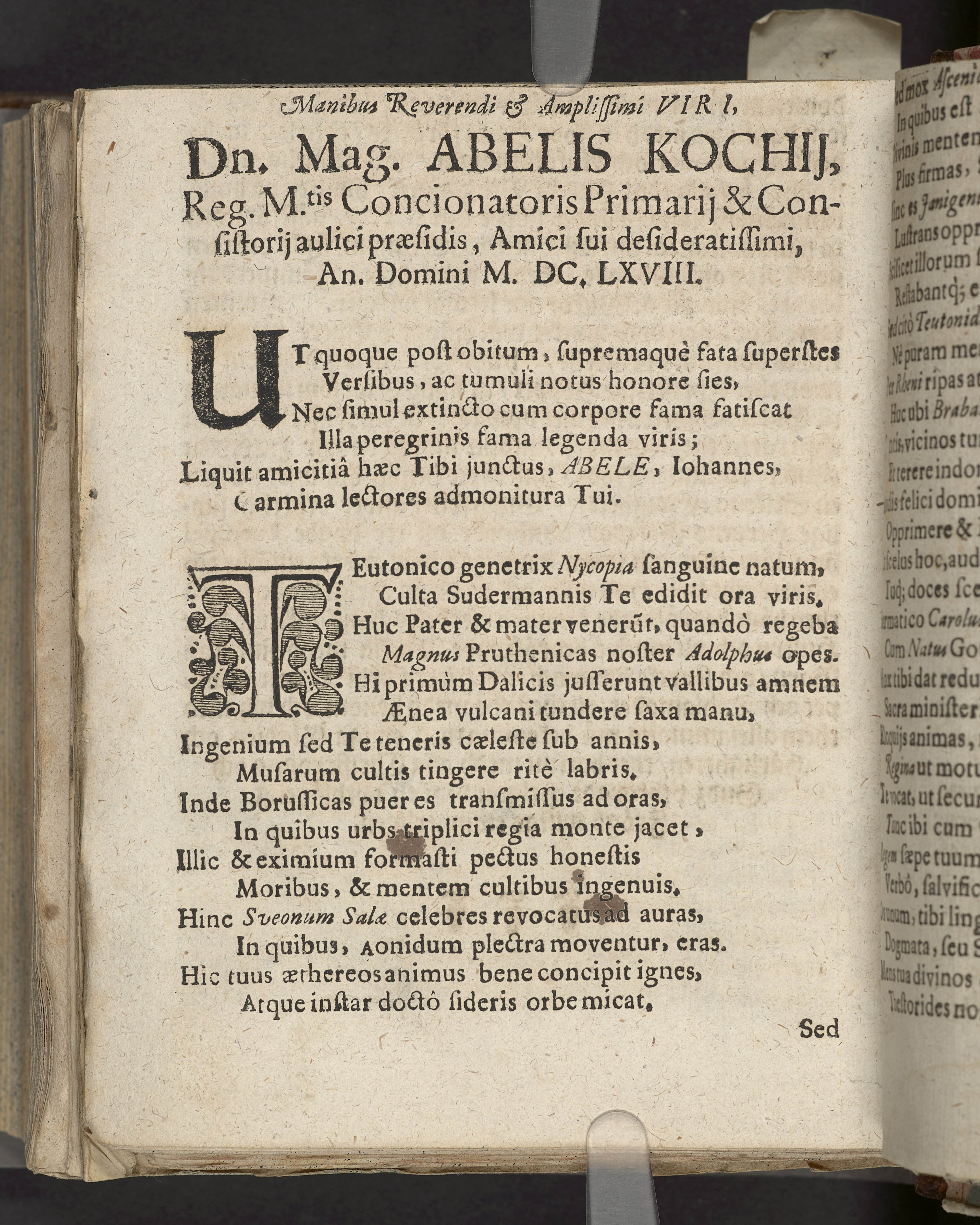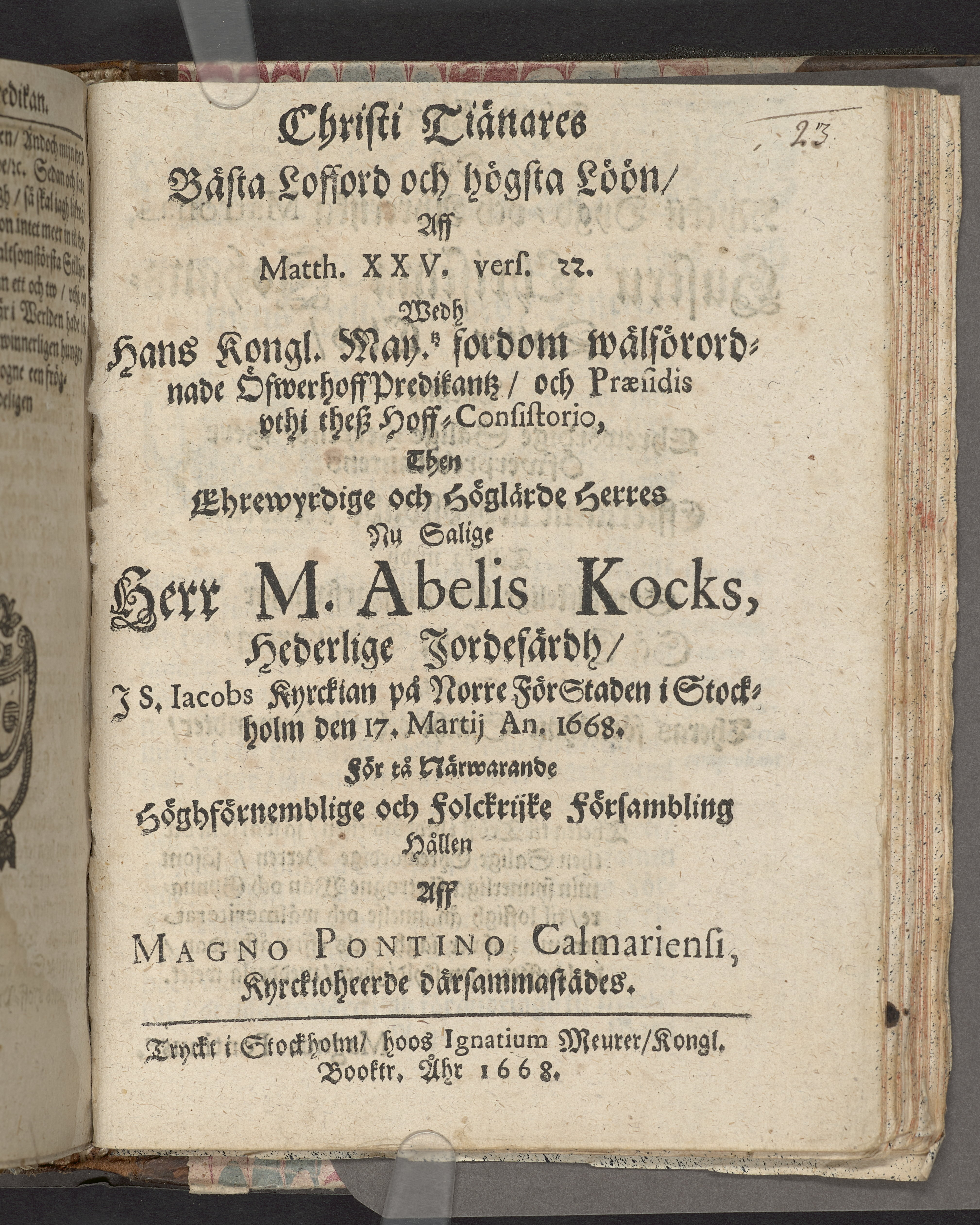 Christi tiänares bästa lofford och högsta löön, aff matth. XXV. vers 22. wedh hans kongl. may.tz fordom wälförordnade öfwerhoffpredikantz, och praesidis vthu thesz hoff-consistorio, then ehrewyrdige och höglärde herre nu salige herr M.Abelis Kocks, hederlige jordefärdh, i S. Iacobs kyrckian på norre förstaden i Stockholm den 17. martij an. 1668. för tå närwarande höghförnemblige och folckrijke försambling hållen aff Magno Pontino Calmariensi, kyrckioherde därsammastädes. tryckt i Stockholm, hoos Ignatium Meurer, kongl. booktr. åhr 1668.