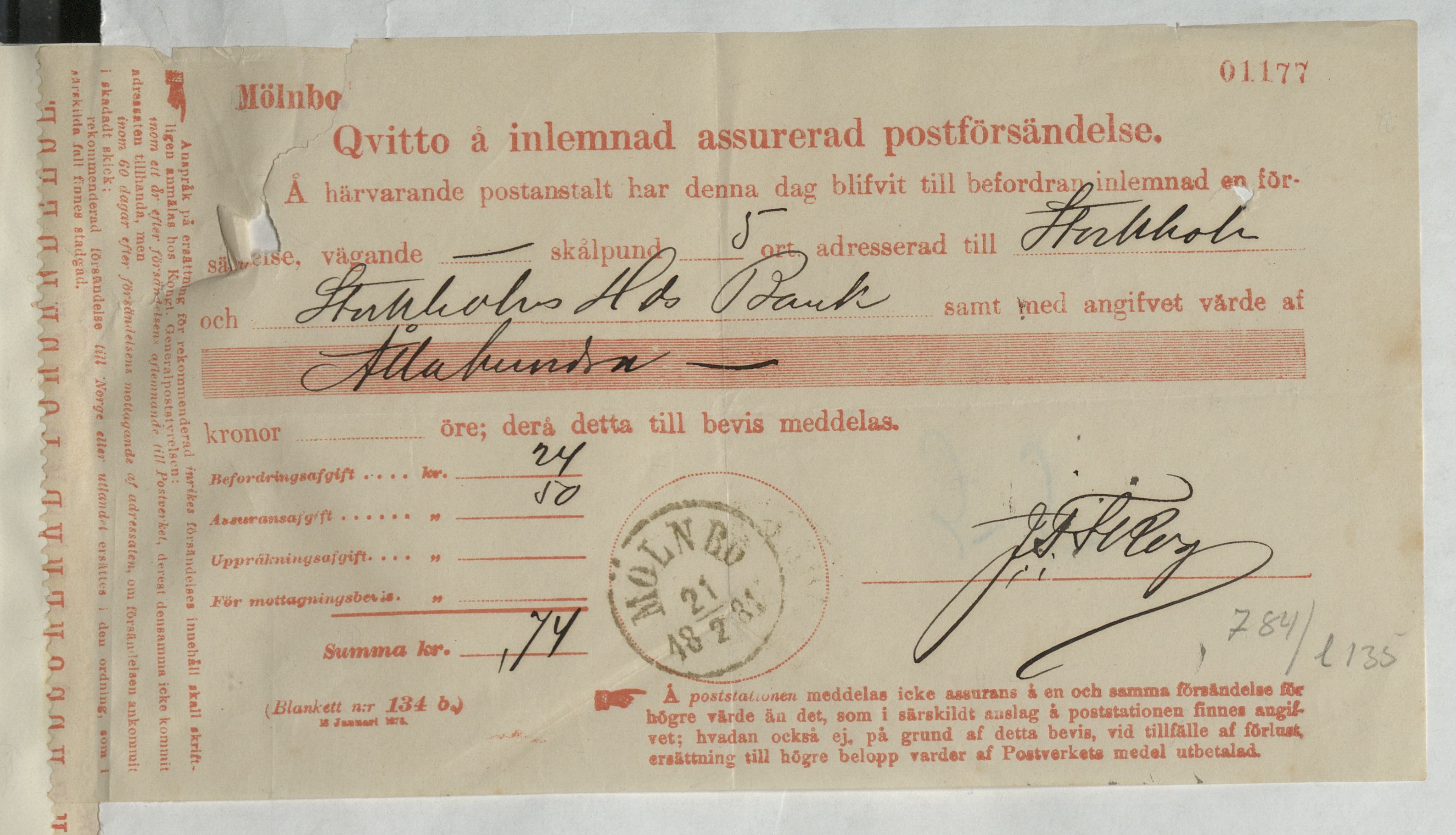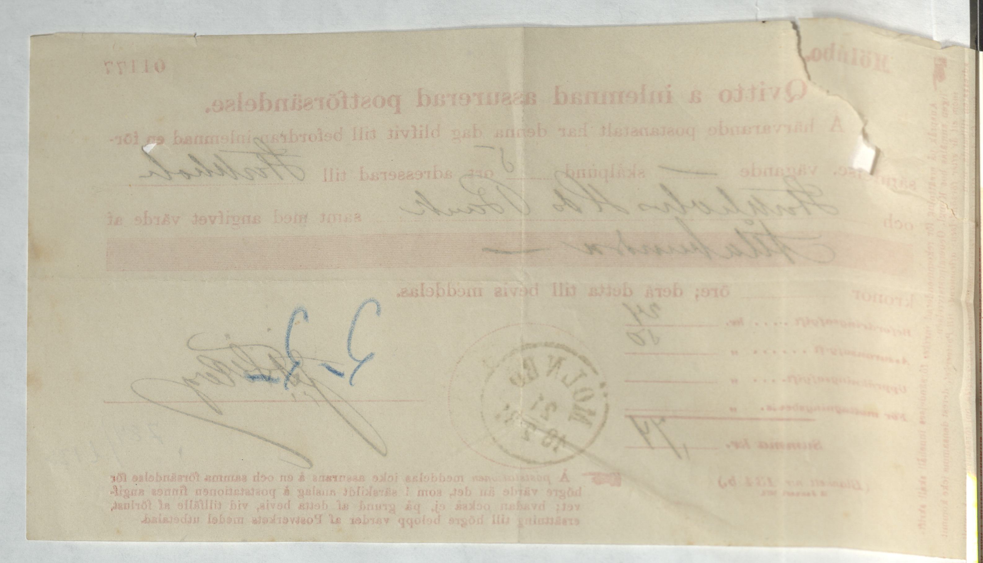 Kvitto för inlämnad assurerad postförsändelse, adresserad till Stockholms Handelsbank