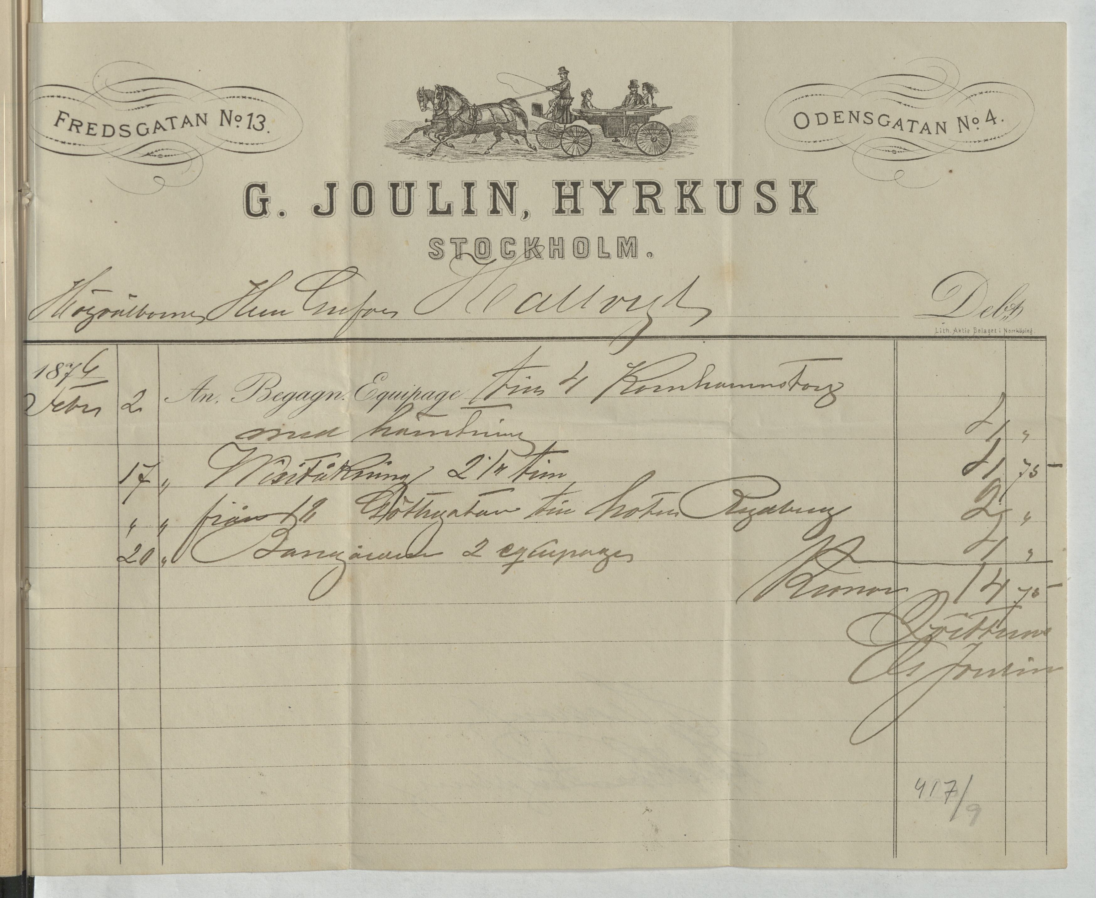 Kvitto från G. Joulin, Hyrkusk. Gällande resor till och från platser så som Kornhamnstorg 4, Götgatan, Hotel Rydberg och Bangården samt en Wisitkörning. Stockholm, 1876.