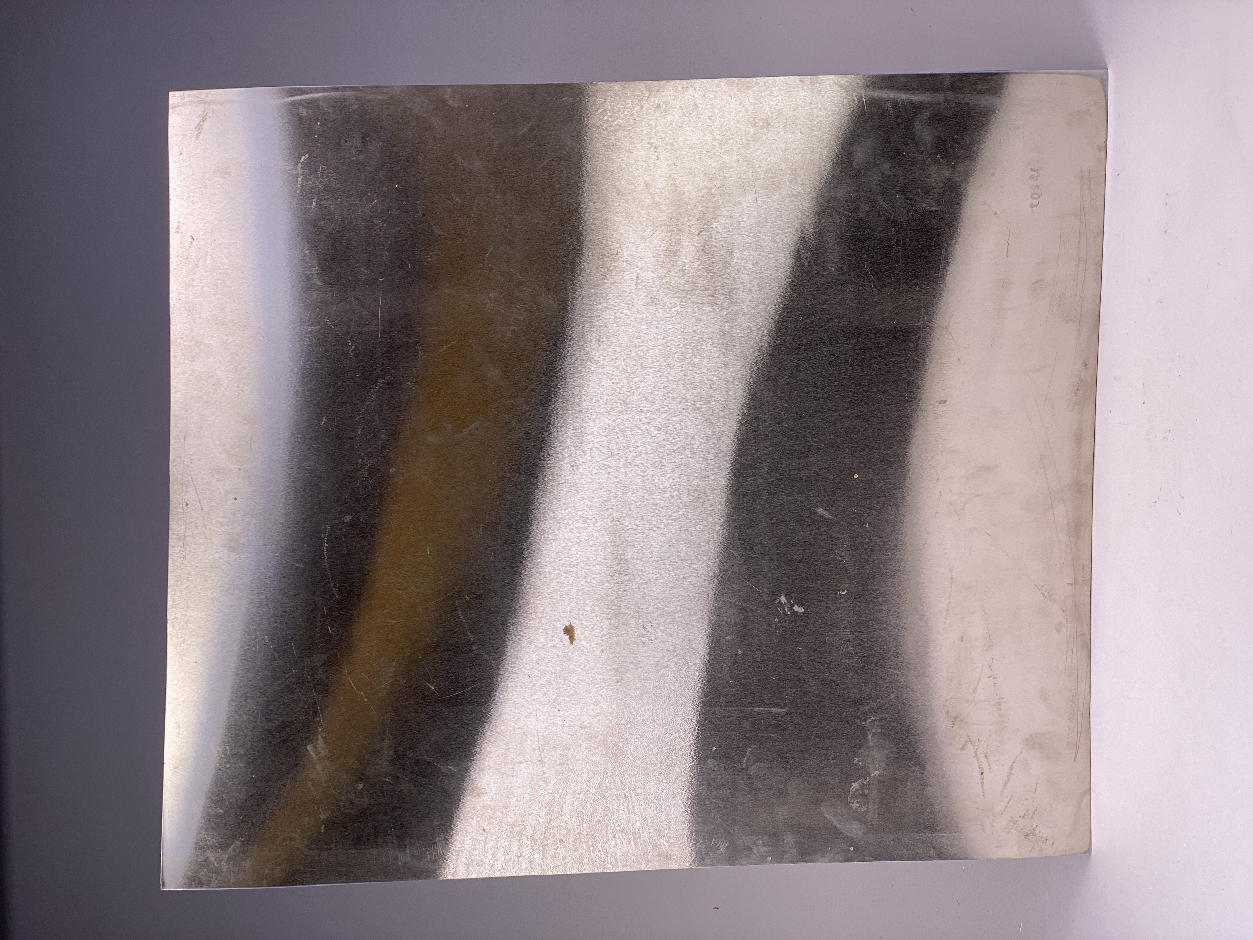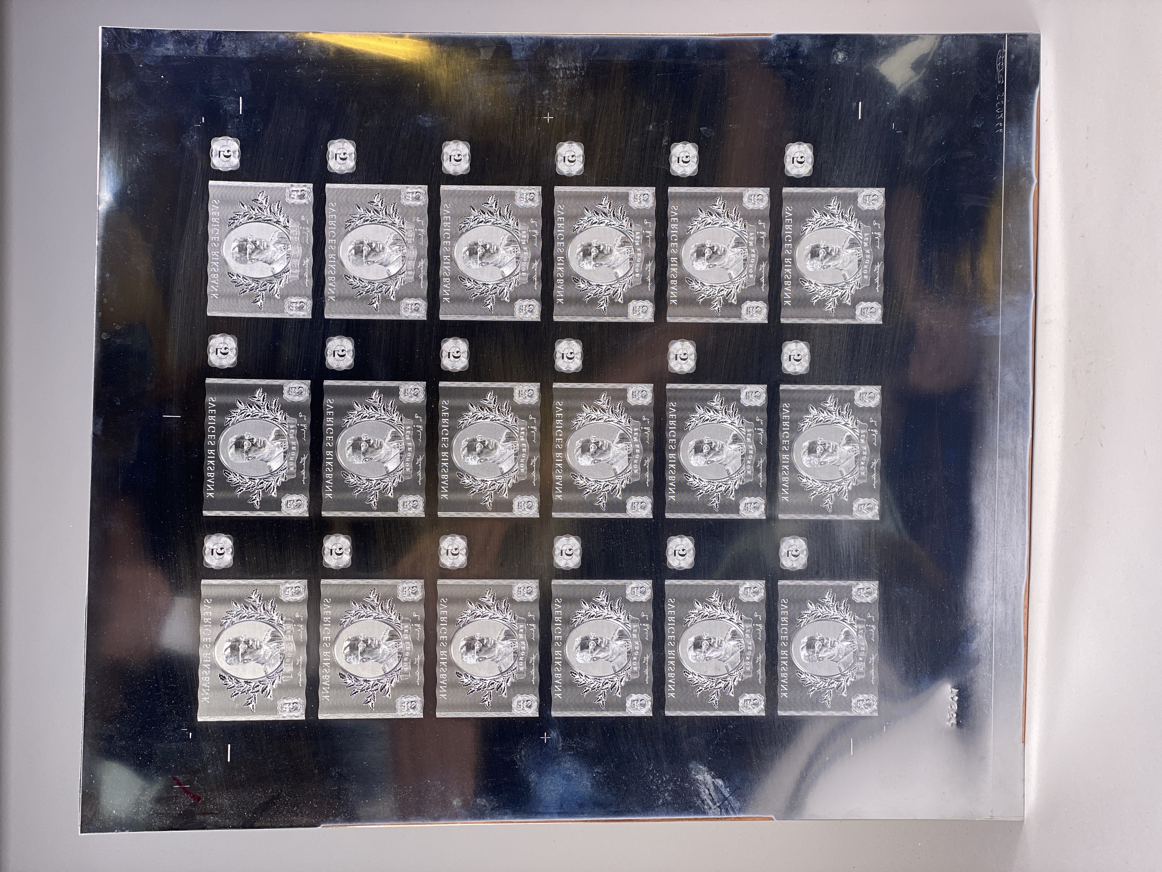 Tryckplåt för 18 stycken femkronorssedlar. Med tillhörande kuvert. Stor och rektangulär plåt tillverkad i rostfritt stål. Framsidan med gravyr föreställande Gustav VI Adolf. Plåten stämplad: "15207".