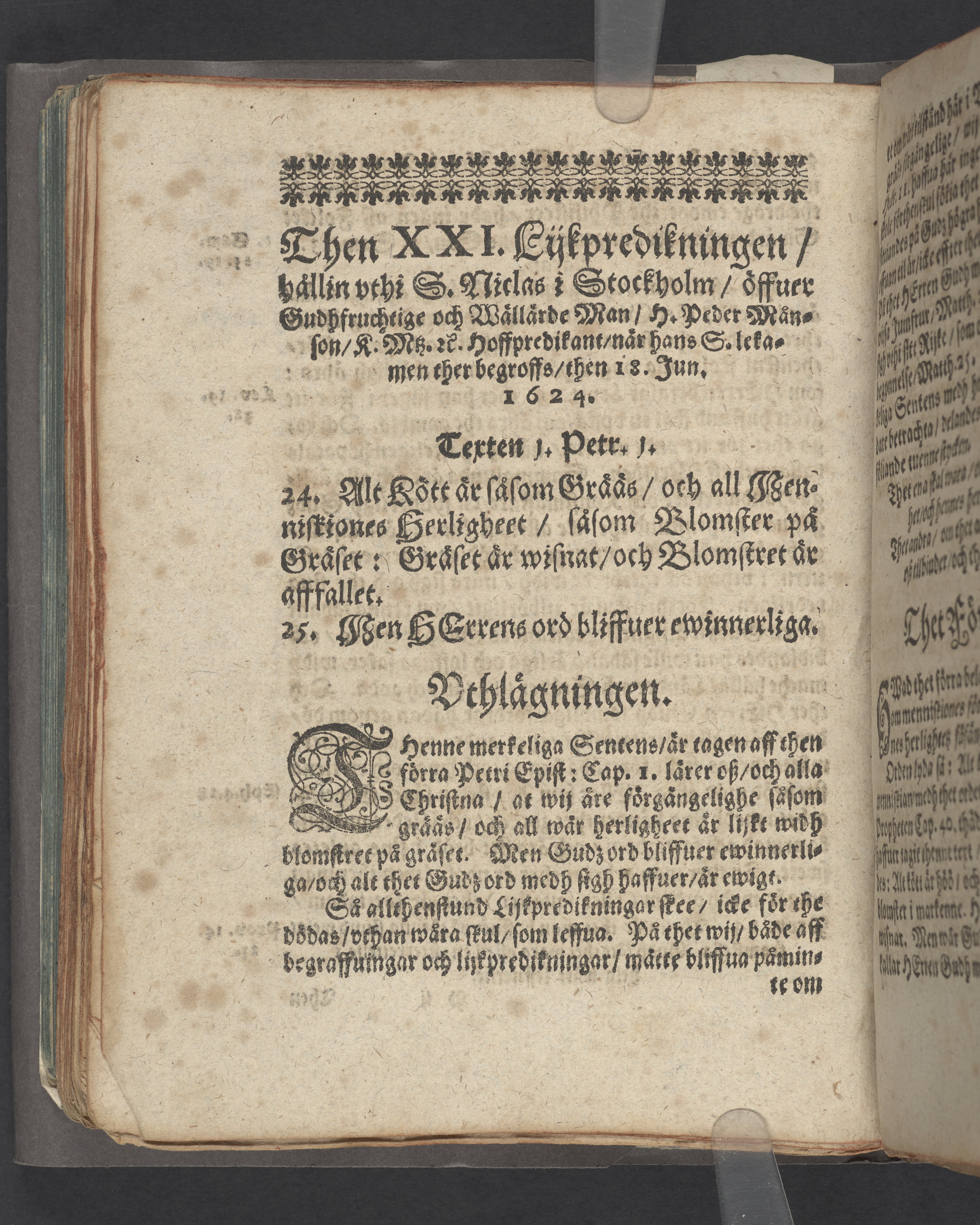 Then XXI lijkpredikningen/ hållin uthi S.Niclas i Stockholm/ öffuer Gudhfruchtige och vällärde Man/ H. Peder Månson/ K. Mtz. etc. hoffpredikant/ när hans s. lekamen ther begroffs/ then 18. Jun. 1624.