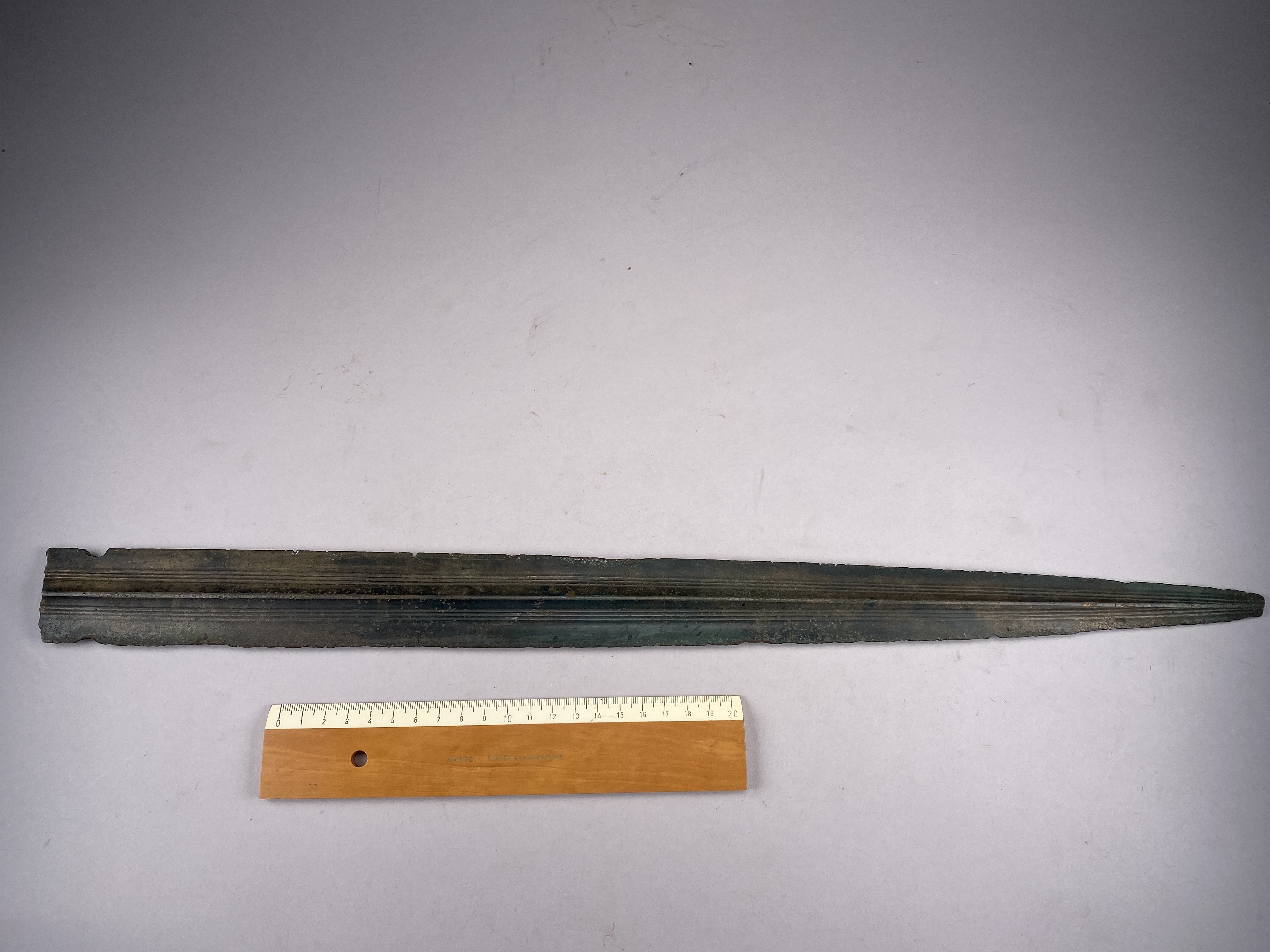 Troligen grepplattesvärd eller grepptunge svärd. Endast klingan bevarad. Klinga med rundad mittås med kantlinjer. Fäste med fyra runda nithål med tre bevarade nitar. Rester ett nithål på tungan. Hack i eggen av avbrutet fäste. Välbevarat. Upphittat på 1600-talet i vad som då tolkades som rester efter slaget vid Bråvalla. Finns dokumenterat i Erik Dahlbergs "Svecia Antiqua et Hodierna" på gravyr från 1707. Möjlligen tillhör svärdsknappen denna klinga