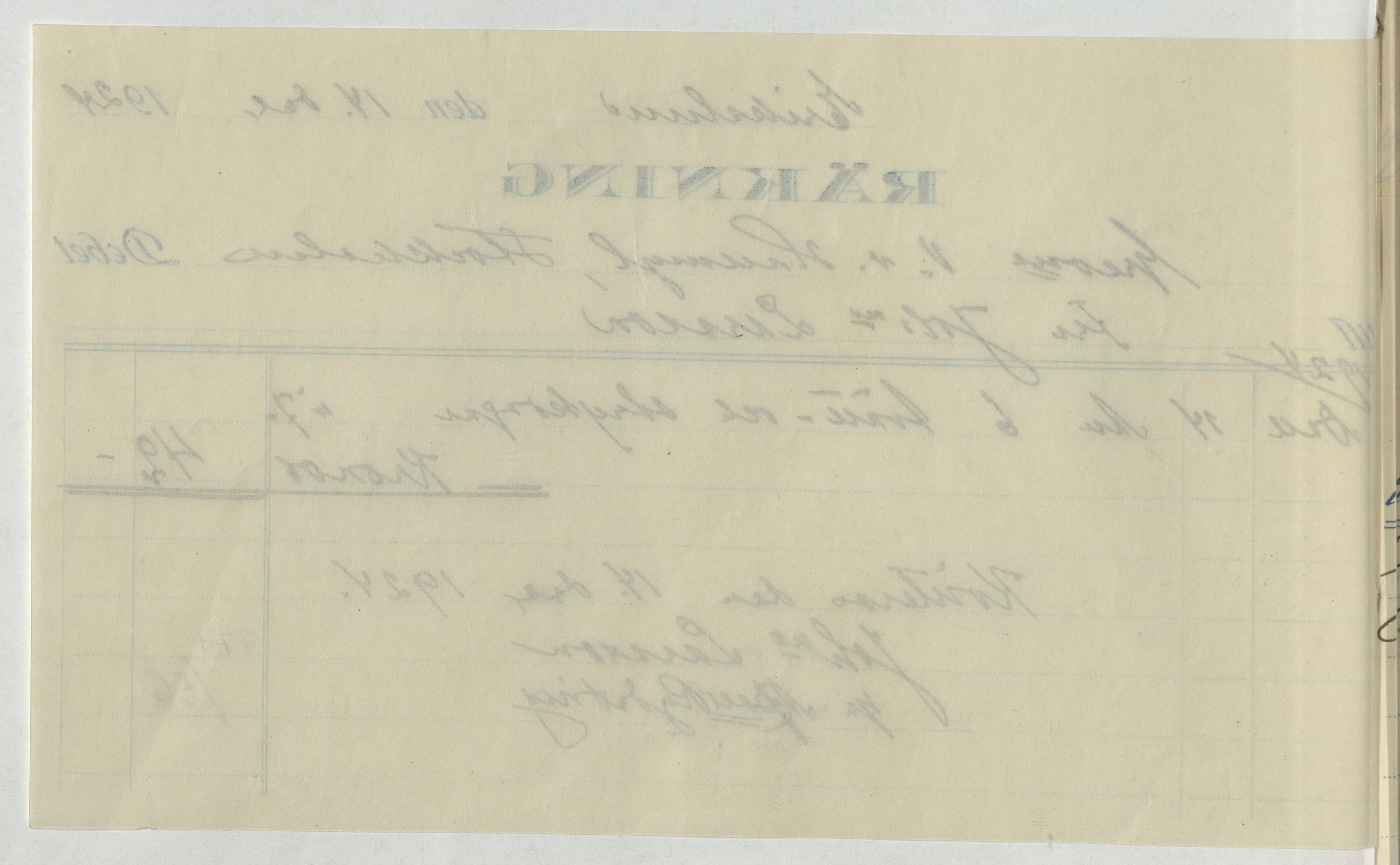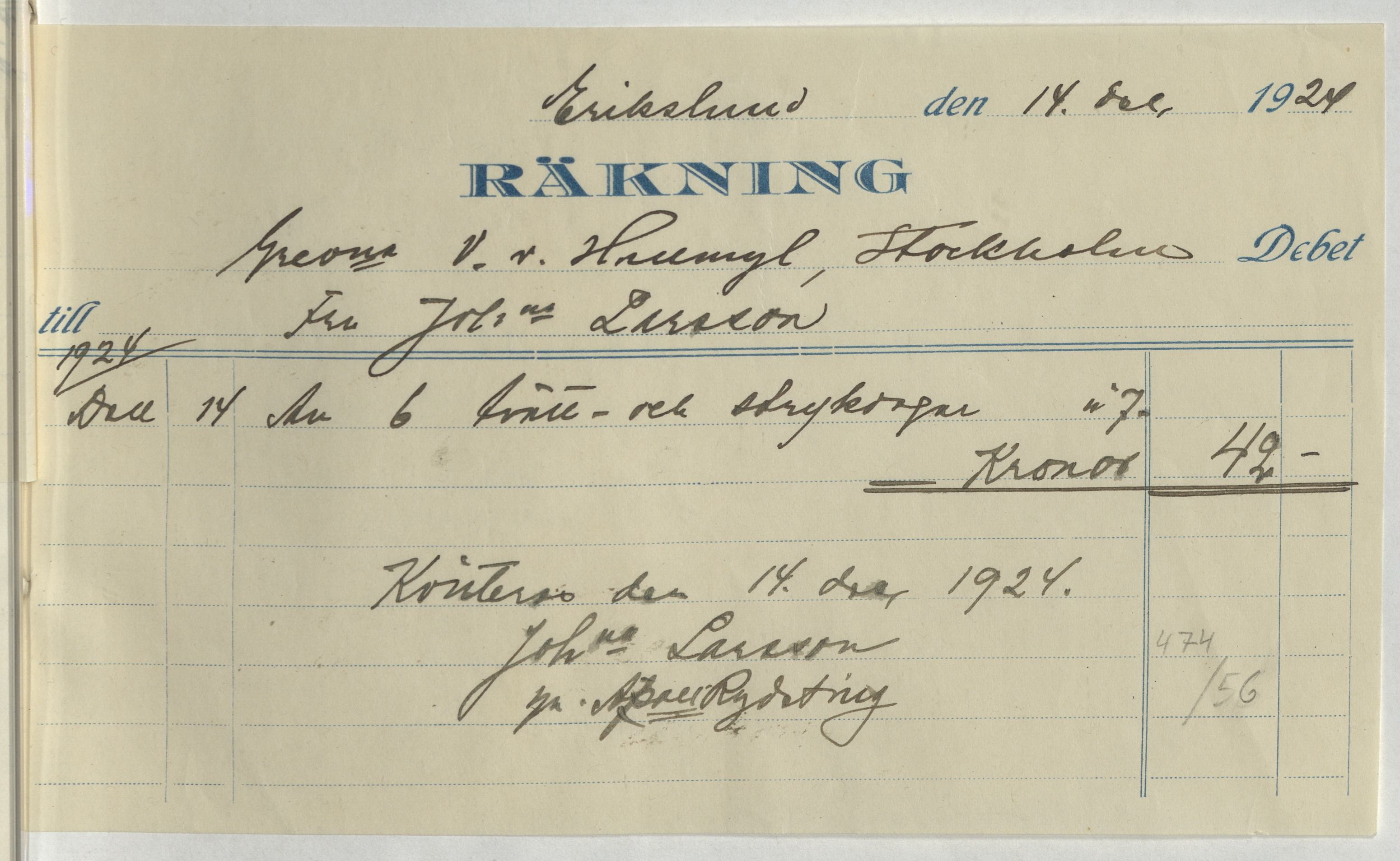 Kvitto från Johanna Larsson i Erikslund. Gällande 6 tvätt- och strykdagar. Erikslund, 1924.