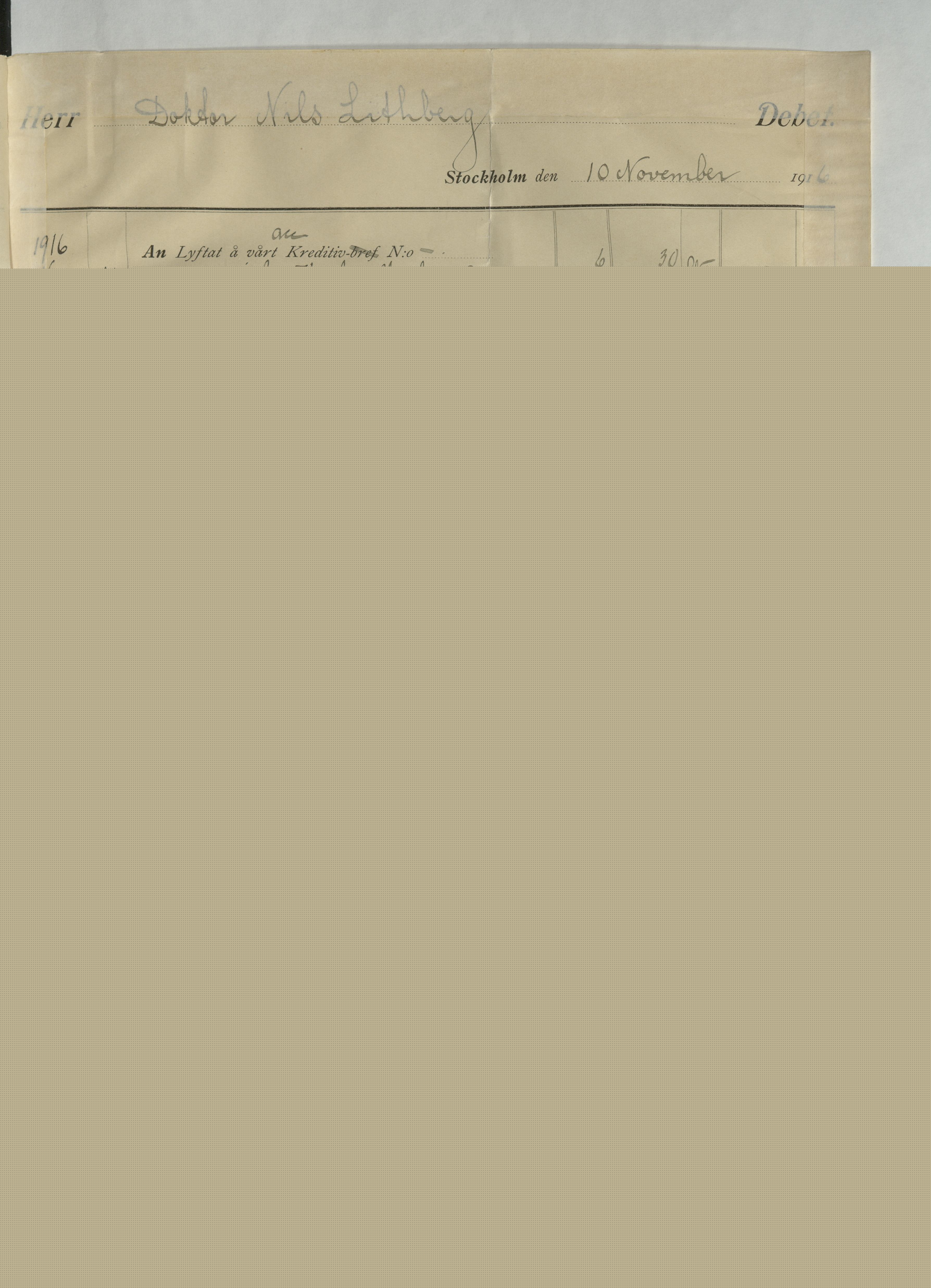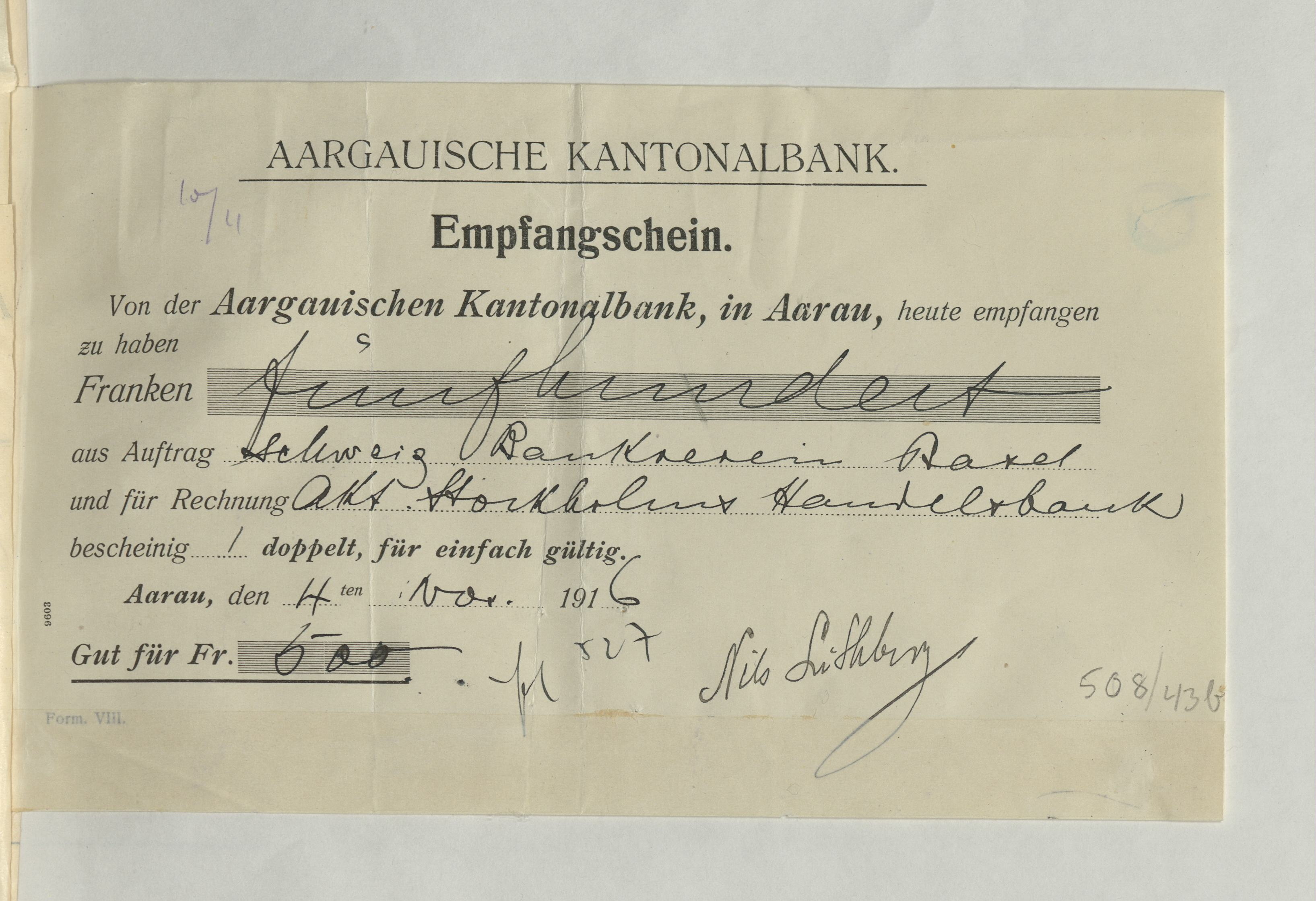 Verfikationer rörande Nils Lithberg, gällande banköverföring mellan Aargauischen Kantonalbank, Aarau, och Stockholms handelsbank, 1916.