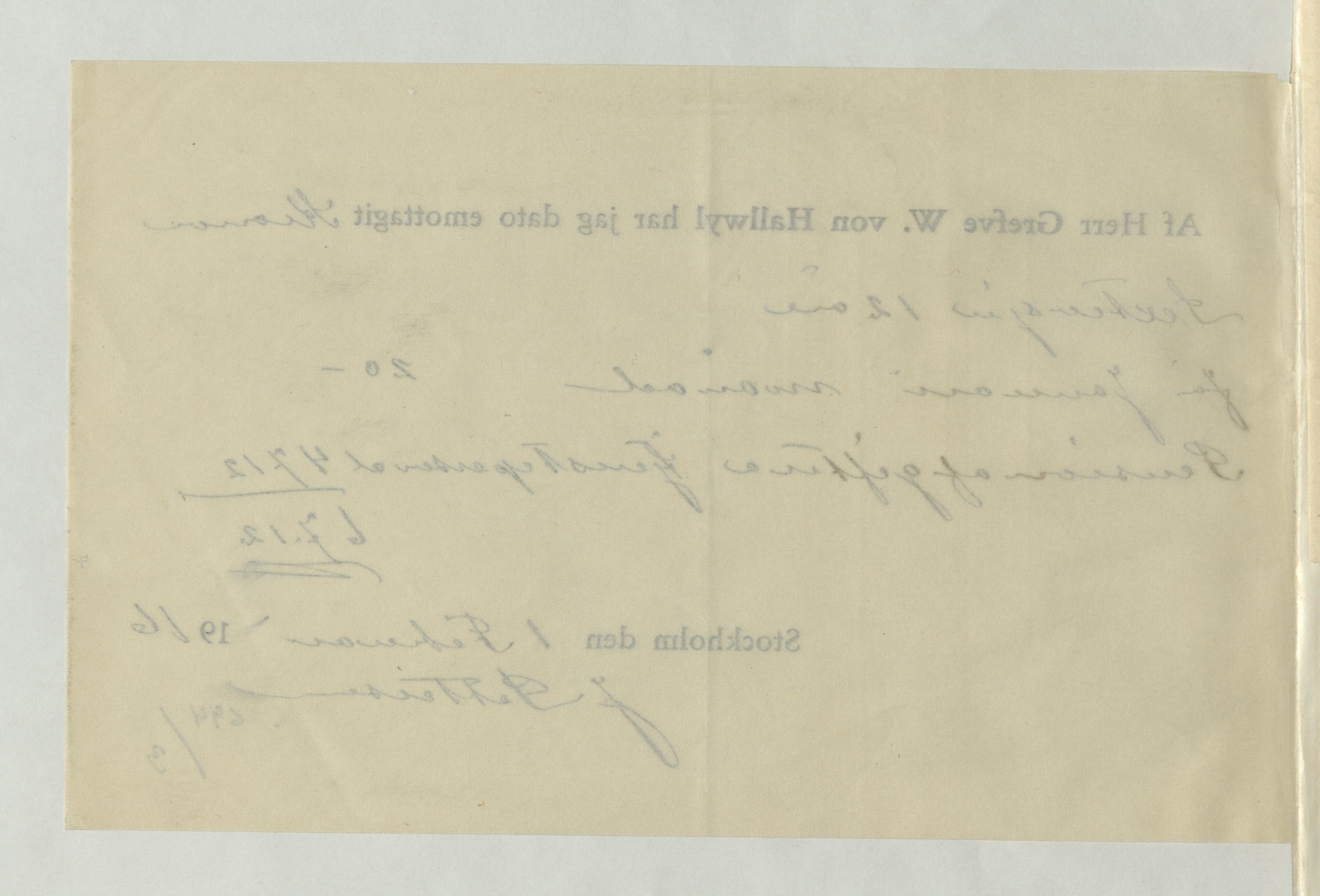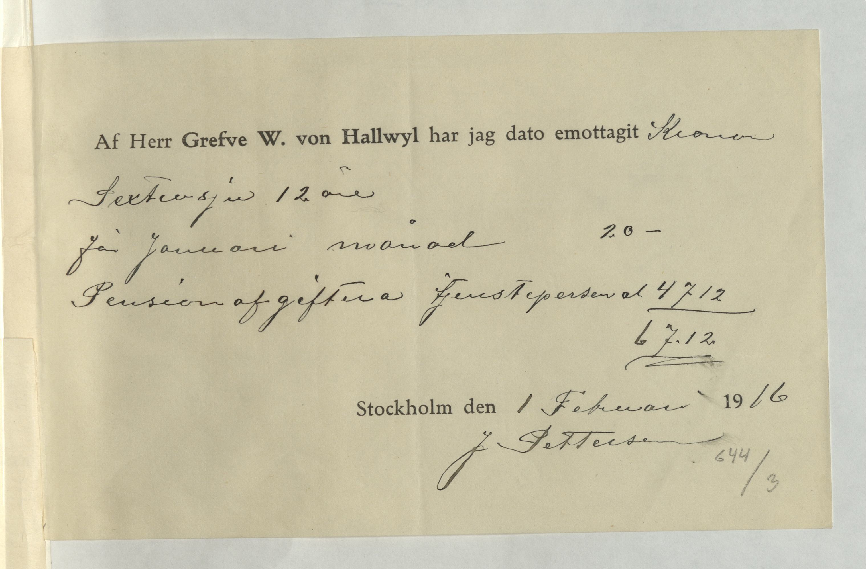 Kvitto från J. Pettersson, på att han emottagit 67:12Kr av Greve W. von Hallwyl för januari månad. Stockholm 1 februari 1916.