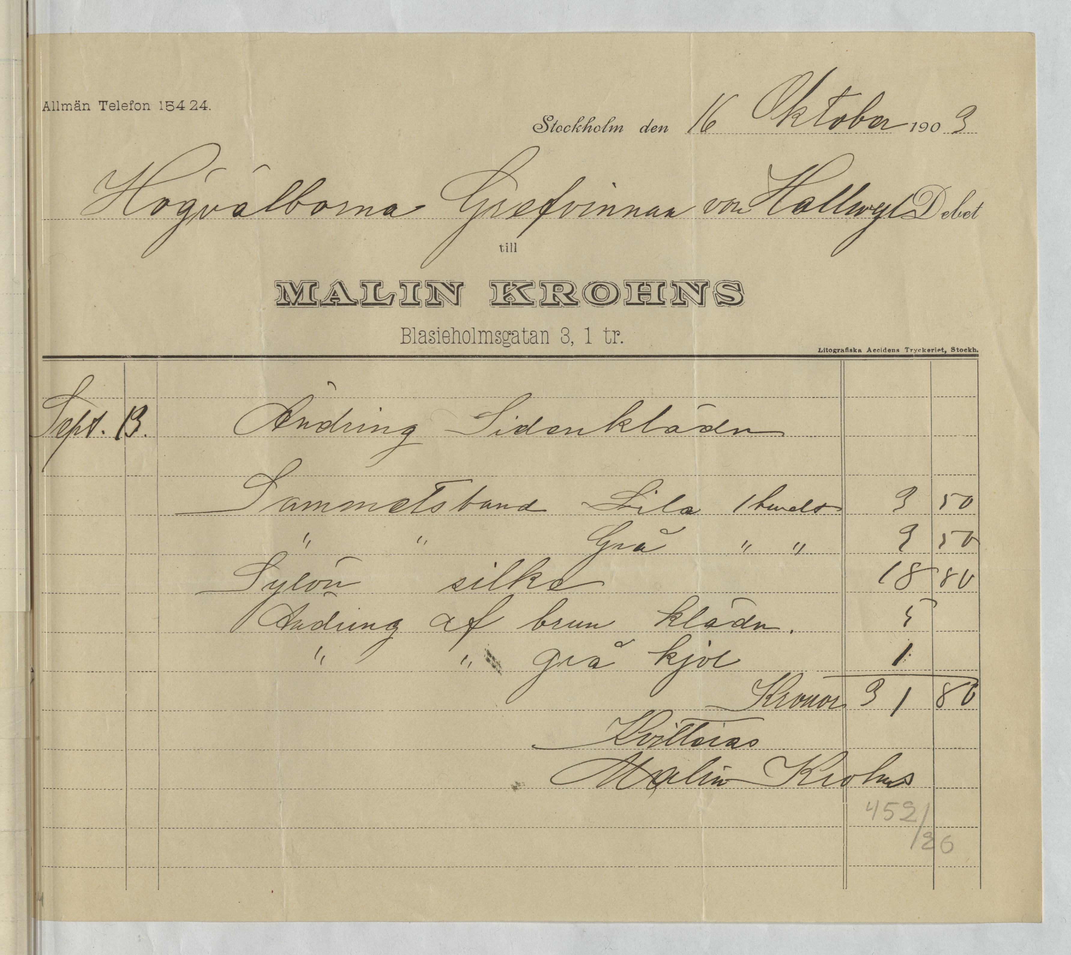 Kvitto från Malin Krohns ateljé. Gällande material och sylön. Stockholm, 1903.