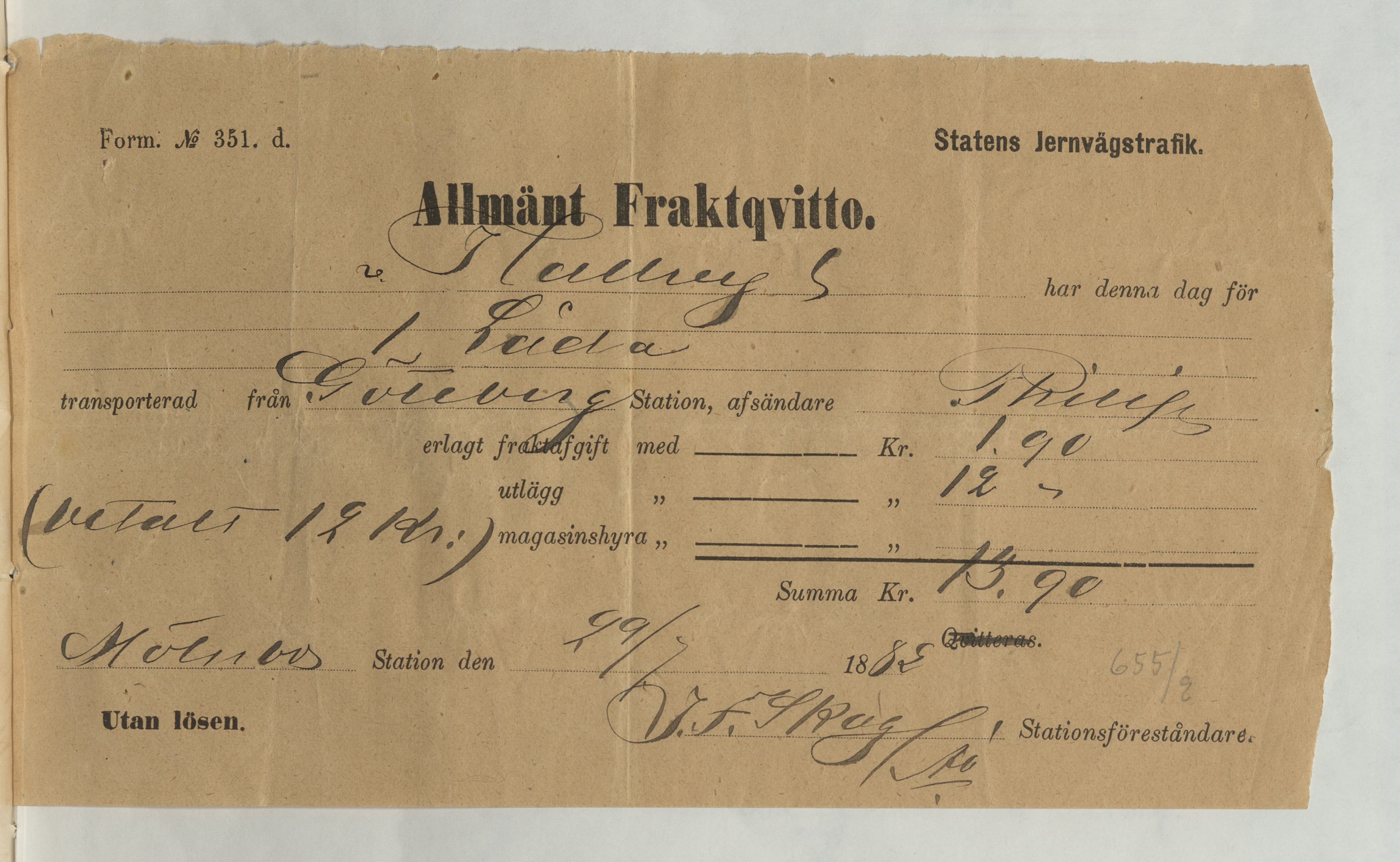 Kvitto från L. & R. Philips Spedition & Incasso, Göteborg, på frakt hos Statens Jernvägstrafik. Mölnbo station 29 juni 1882. 12kr betalt.