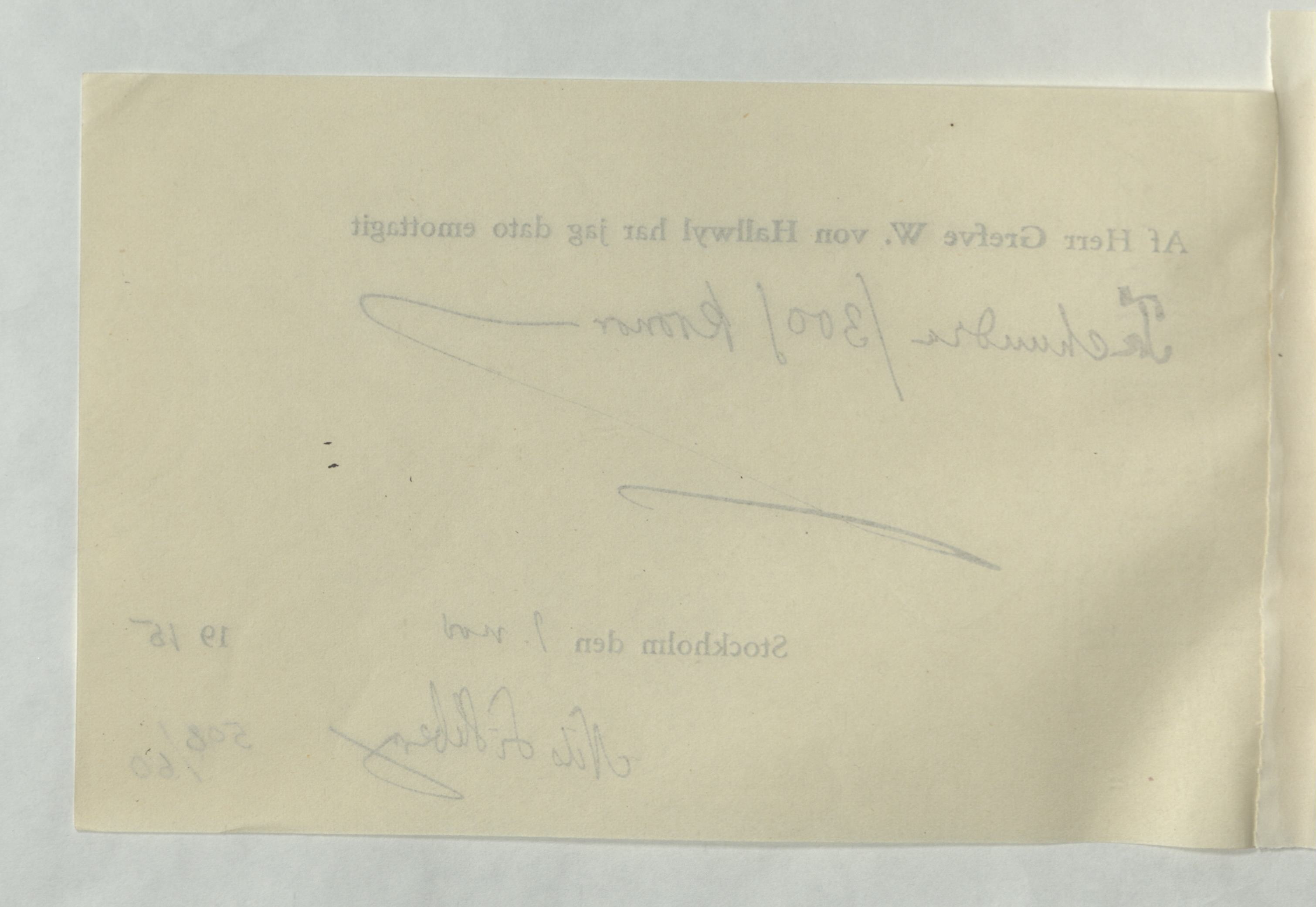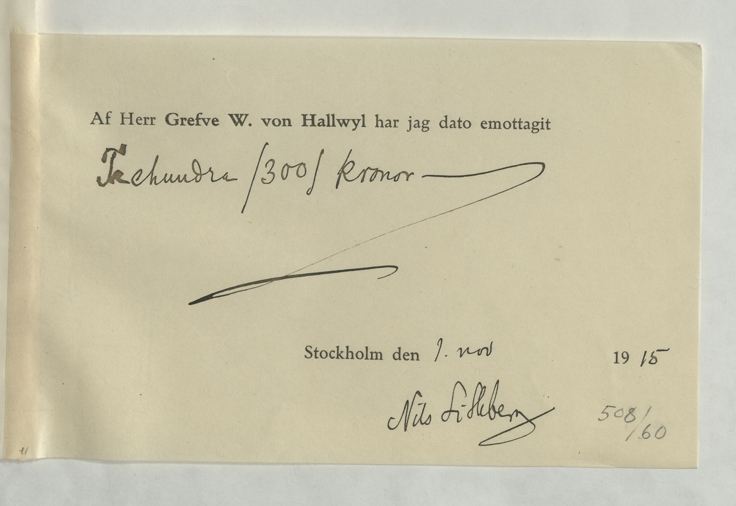 Emottagande av arvode från greven Walther von Hallwyl till Nils Lithberg, 1 november 1915.