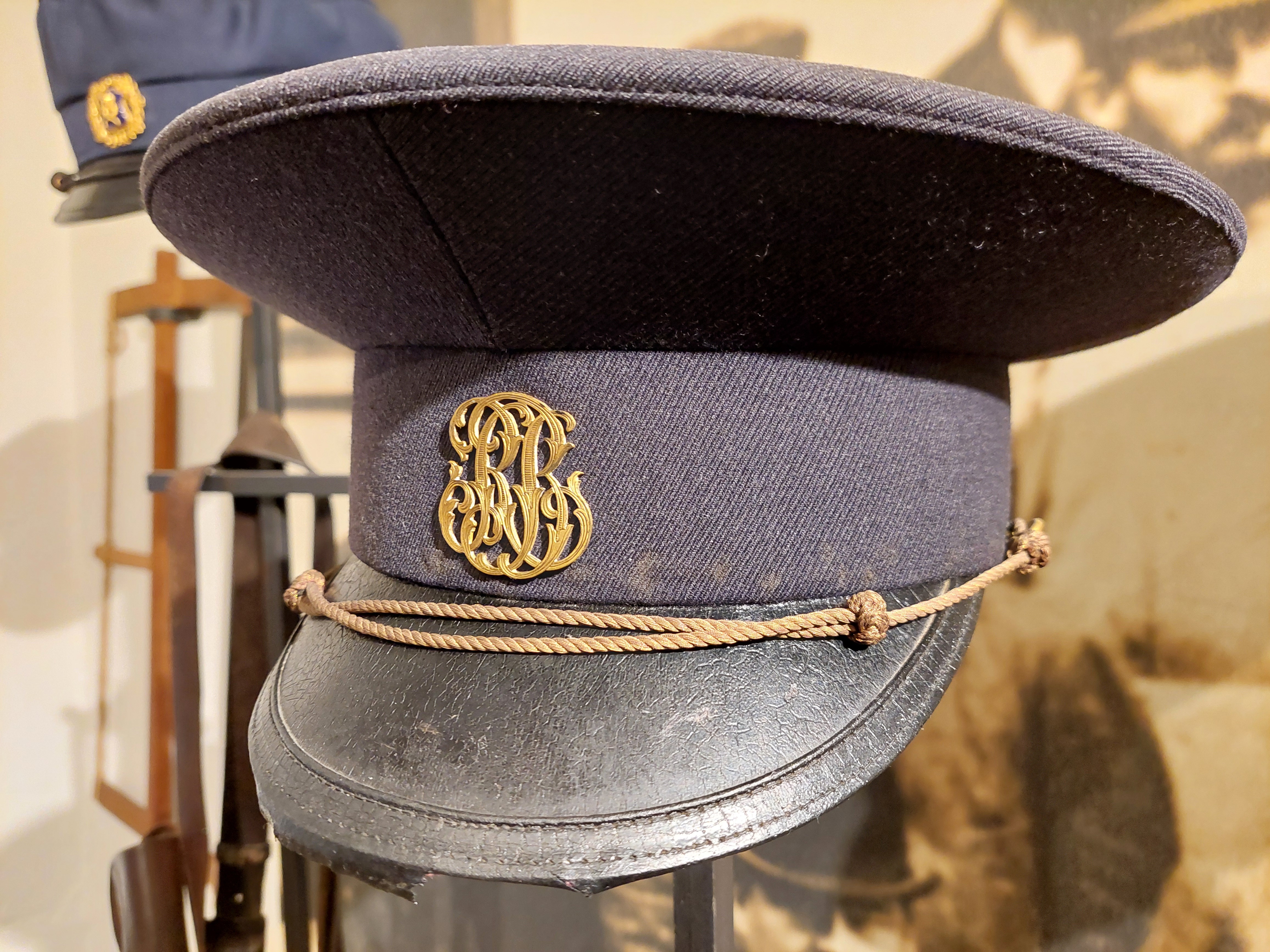Kuskmössa (Keps) använd av vakten vid Tumba bruk. Framtill finns ett monogram av bokstäverna "R" och "B", för Riks Banken (Riksbanken).