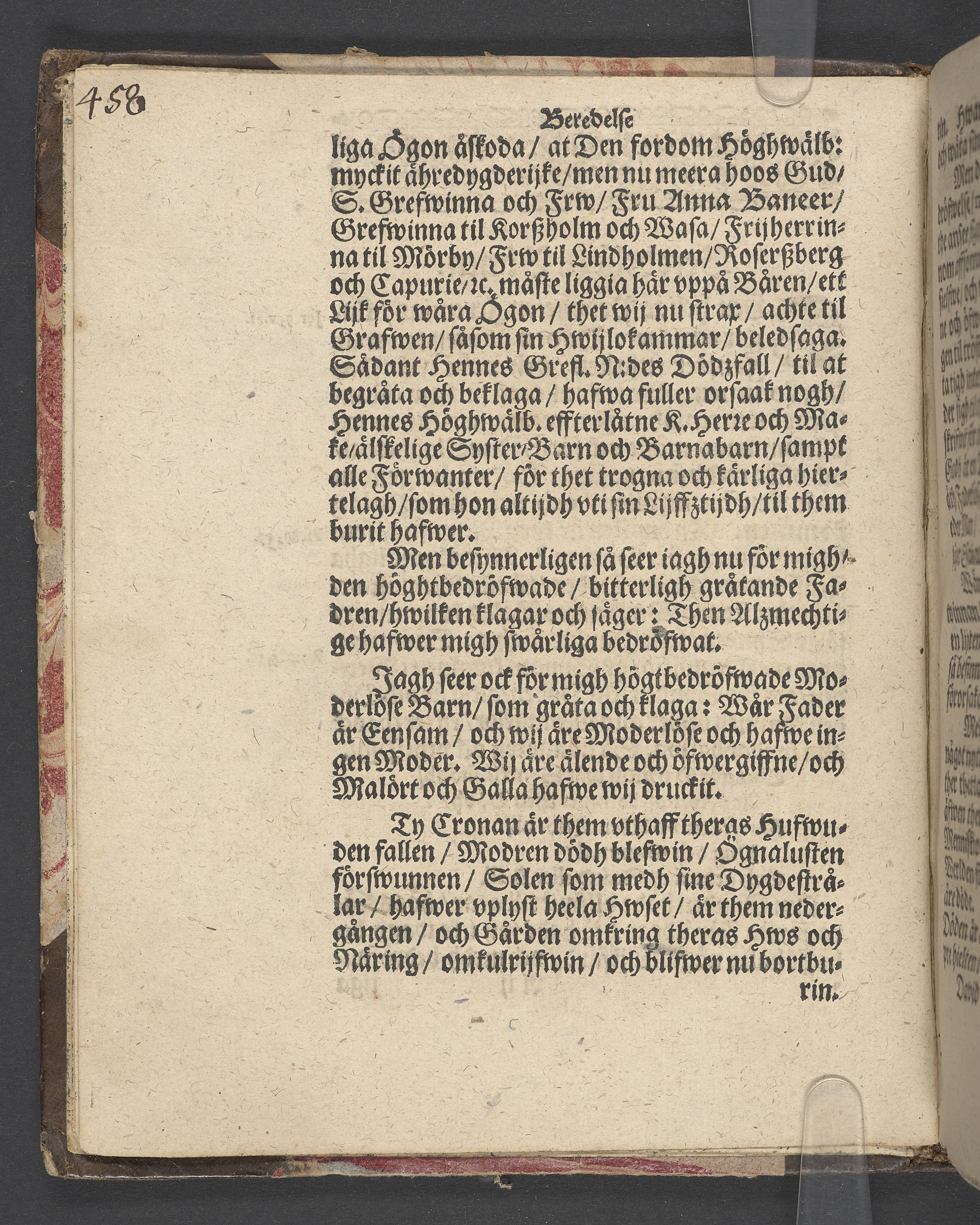 Vthfärdz predikan öfwer then fordom höghwälborne grefwinna och frw frw Anna Baneer, grefwinna til Korszholm och Wasa, frijherrinna til Mörby, fru tl Lindholmen, Rosersberg och Capurie. Hwars salige lekamen medh stoor wedherbörligh solennitet och förnemblighit ähre-process, närwarendes högre och nidrige ståndz personer, til stoort antaal, bleff beledhsagat och vthfördt vthur Mörby slotz kyrckia, then 16. martii, åhr 1656. Hållen thersammastädes aff Torstano Laur. Salinio pastore i Hiälstadh. Tryckt i Stockholm, hoos Ignatium Meurer.