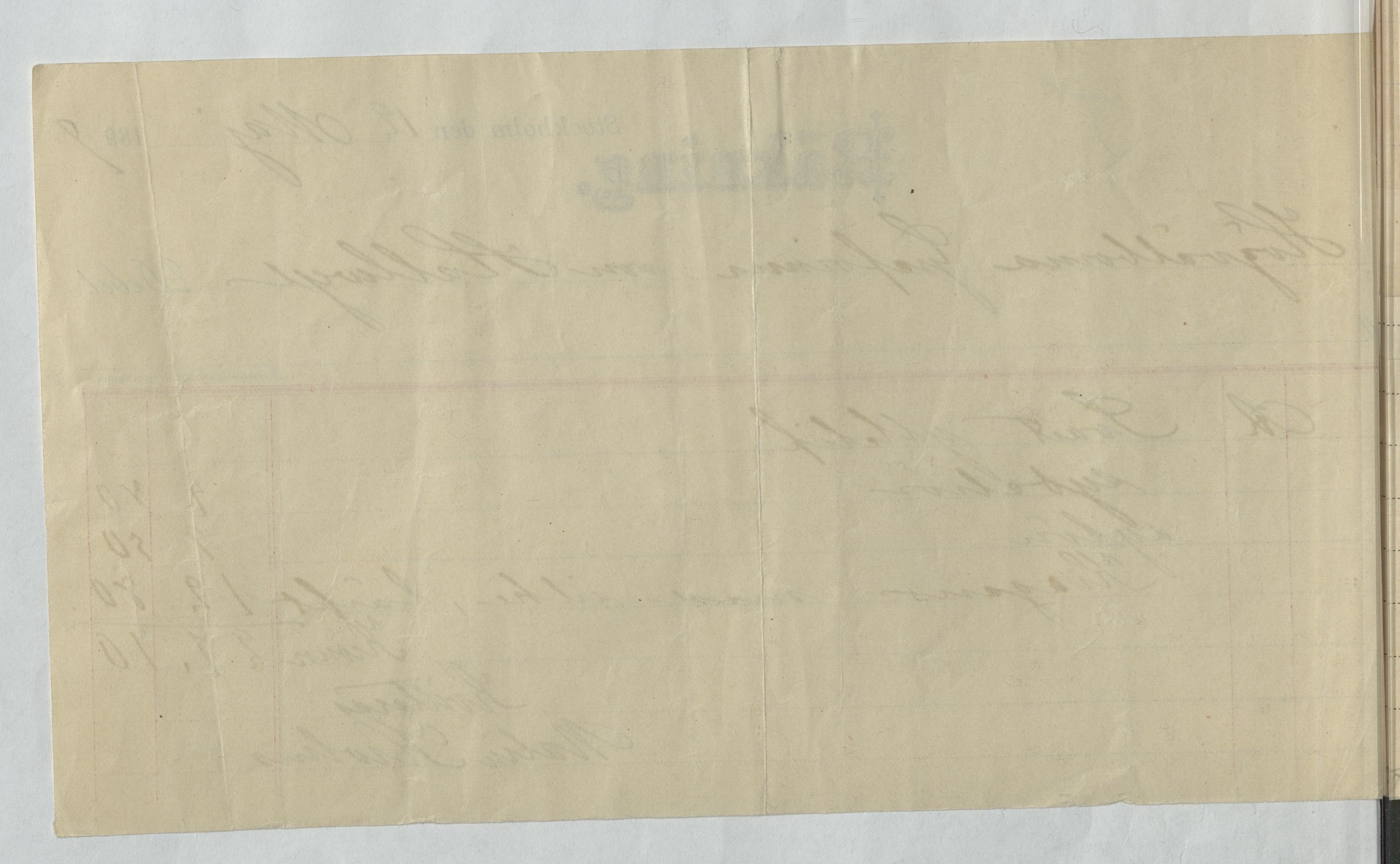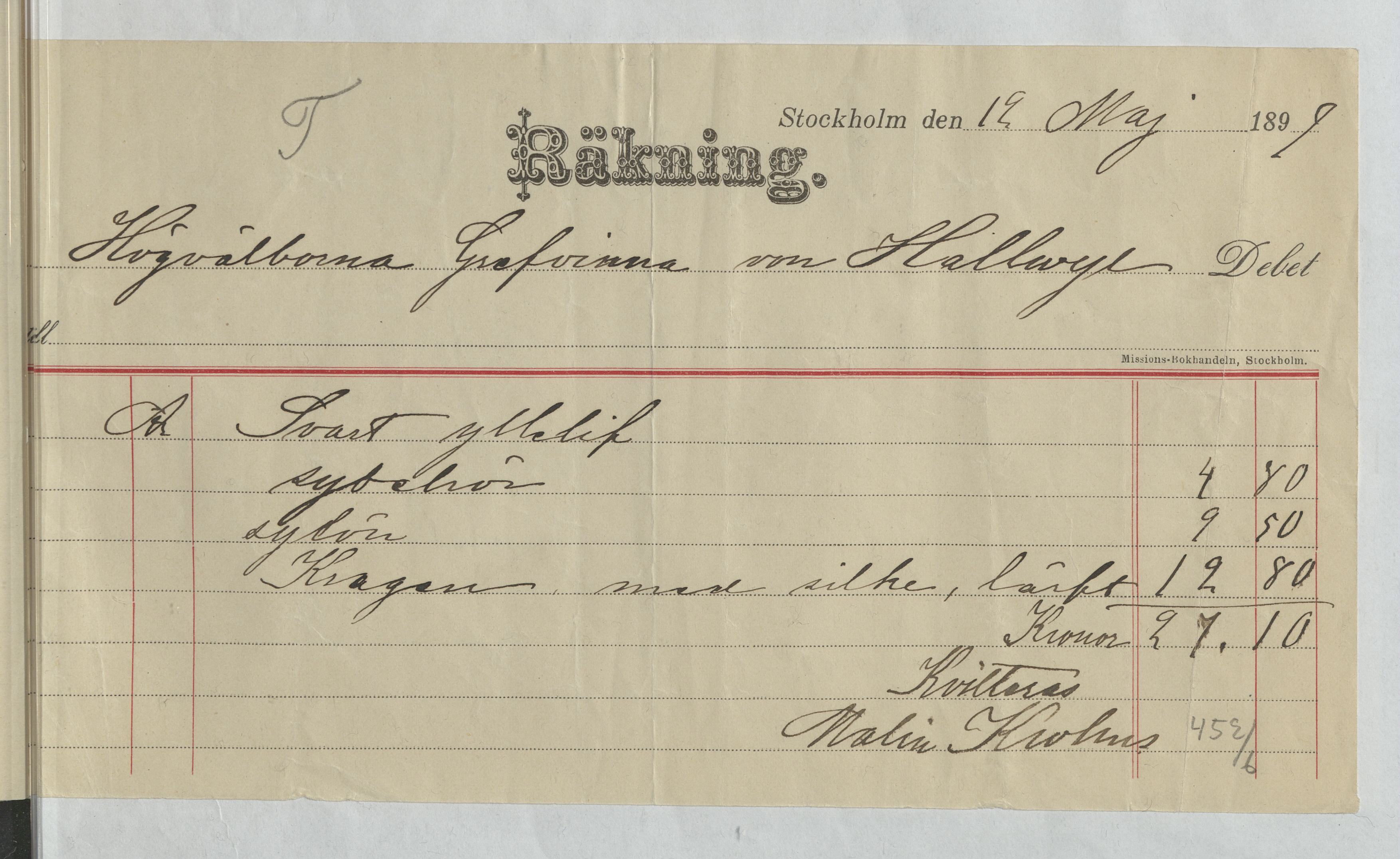 Kvitto från Malin Krohns ateljé. Gällande material och sylön för ett svart ylleliv och krage med silke och lärft. Stockholm, 1899.