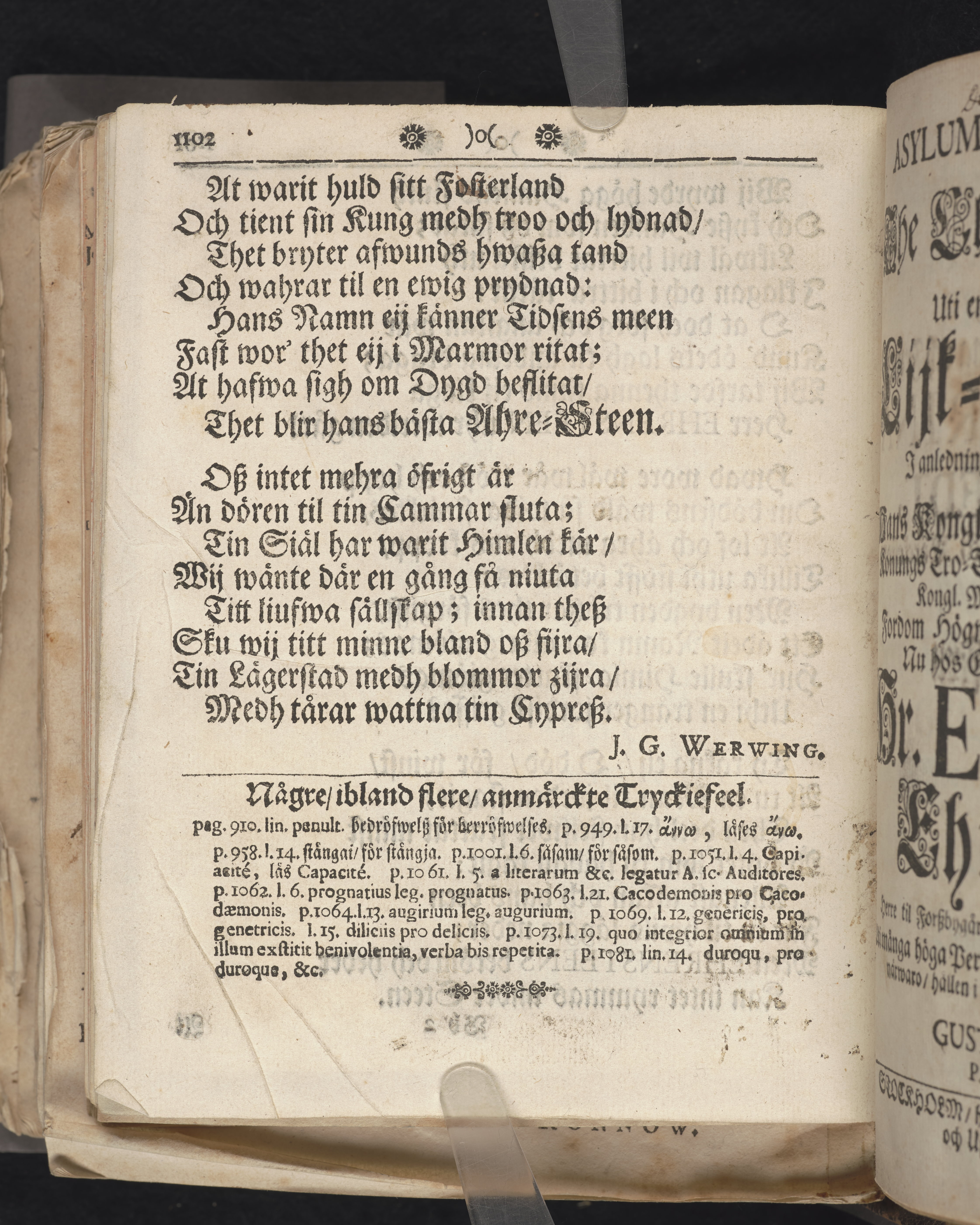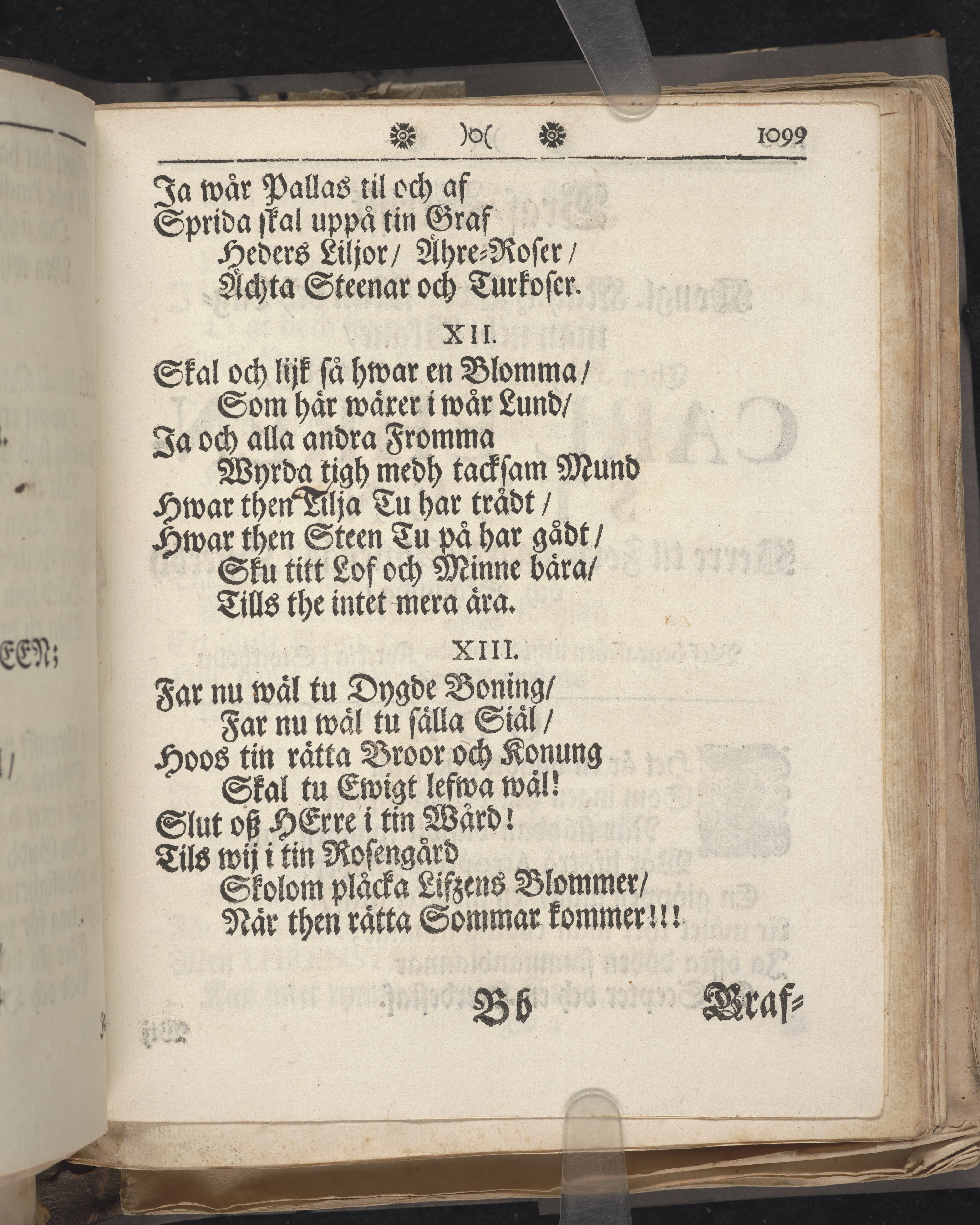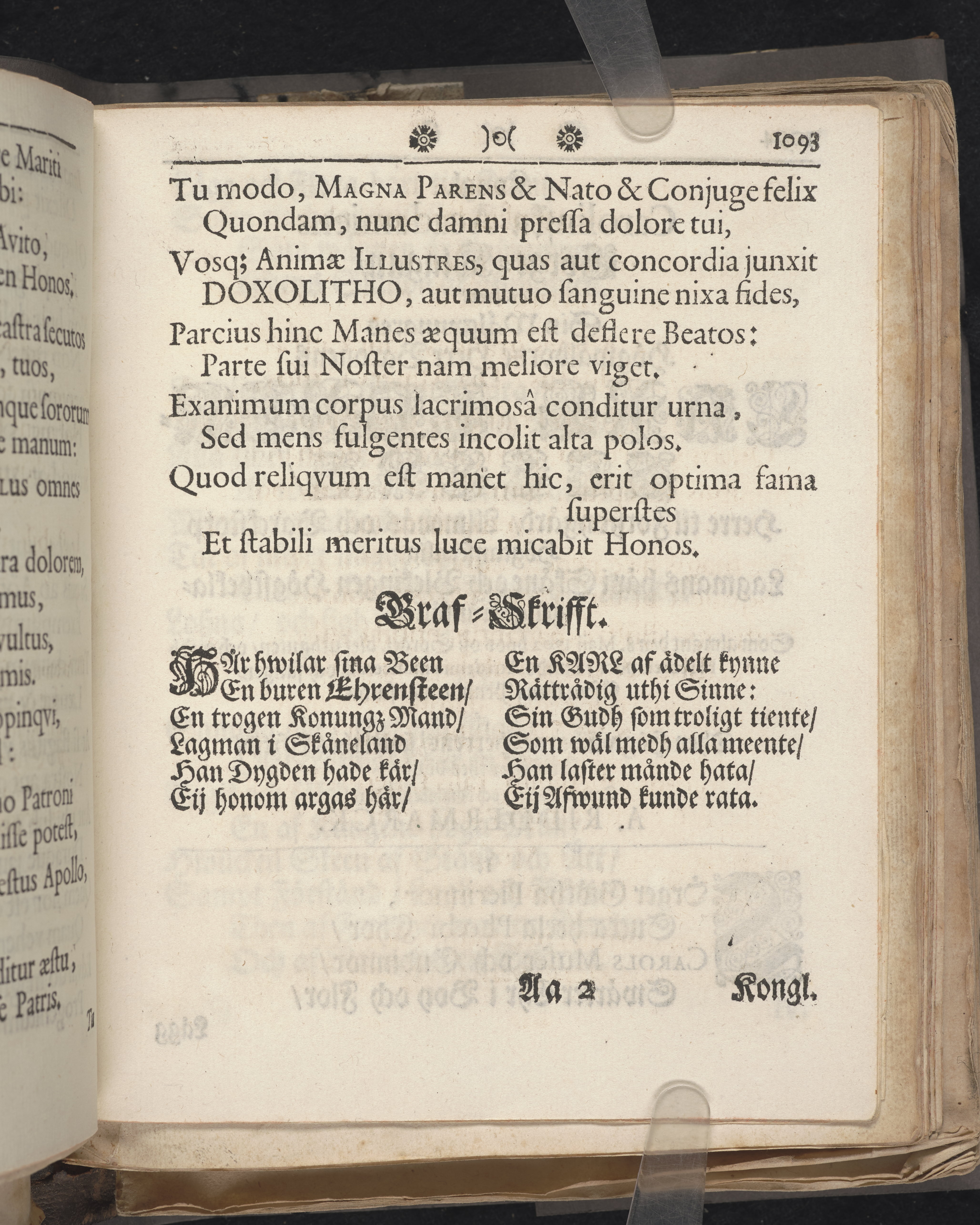 En av 20 texter inbundna tillsammans i ett kolligatband. På denna text följer ytterligare tre gravdikter. Kommer ursprungligen från ett samlingsband och har ursprunglig paginering 1083 - 1102.
