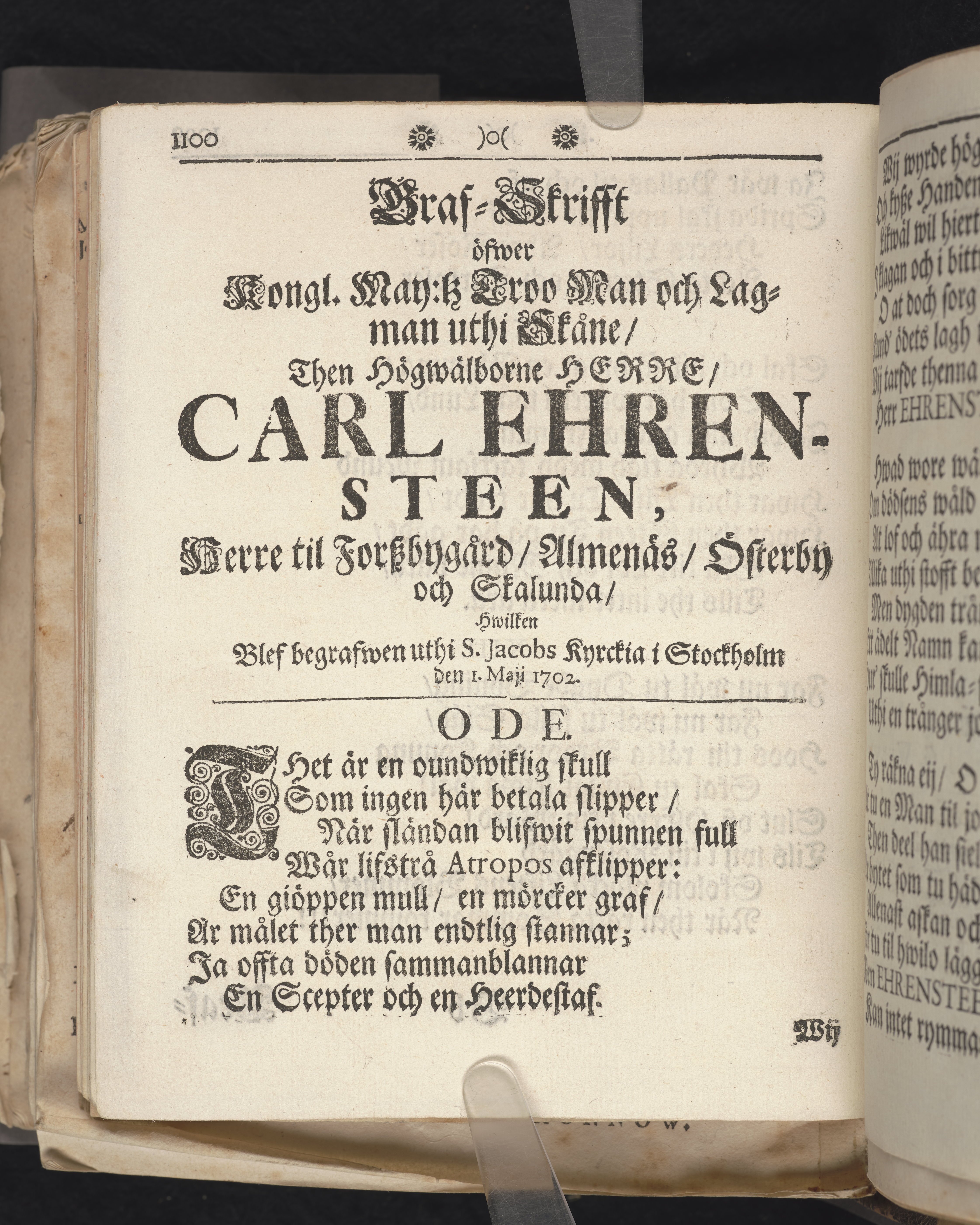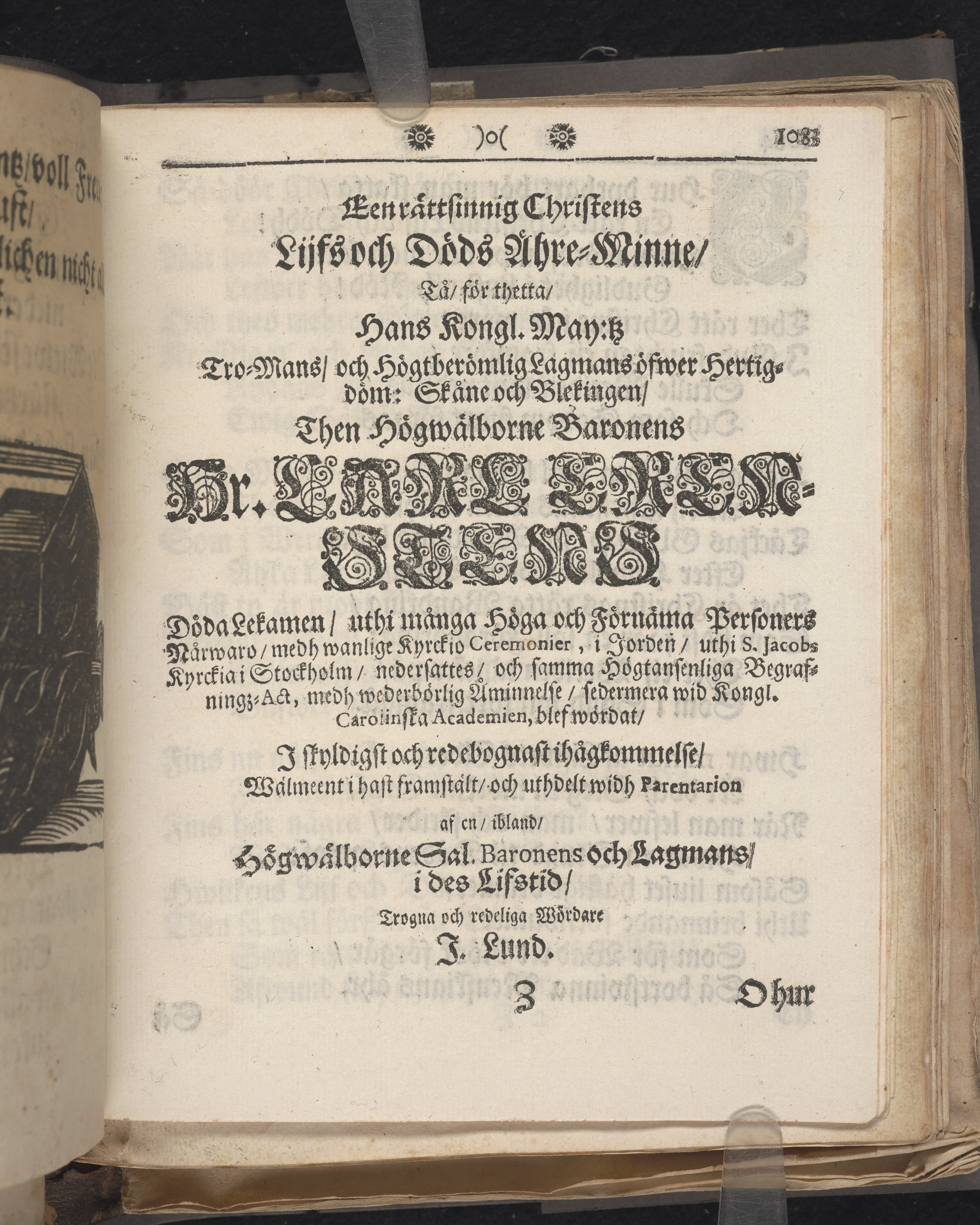 EEn rättsinnig Christens lijfs och döds ähre-minne/ Tå/ för thetta/ hans Kongl. May:tz tromans/ och högtberömlig lagmans öfwer hertigdöm: Skåne och Blekingen/ Then högwälborne baronens Hr. Lars Erensteens döda lekamen/ uthi många höga och förnäma personers närwaro/ medh wanlige kyrckio ceremonier, i jorden/ uthi S. Jacobs kyrckia i Stockholm/ nedersattes/ och samma högtansenliga begrafningz-act, medh wederbörlig åminnelse/ sedermera wid Kongl. Carolinska Academien, blef wördat/ I skyldigst och redobognast ihågkommelse/ Wälment i hast framstält/ och utdelt widh Parentation af en/ ibland/ Högwälborne Sal. Baronens och Lagmans/ i des lifstid/ trogna och redeliga wördare I. Lund.